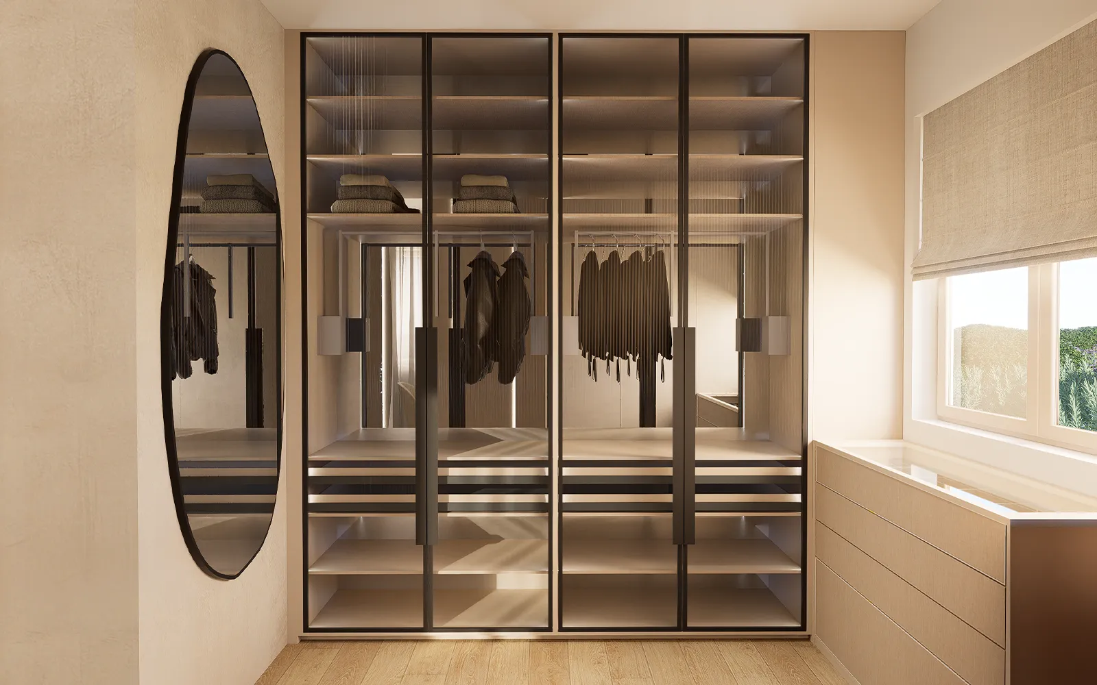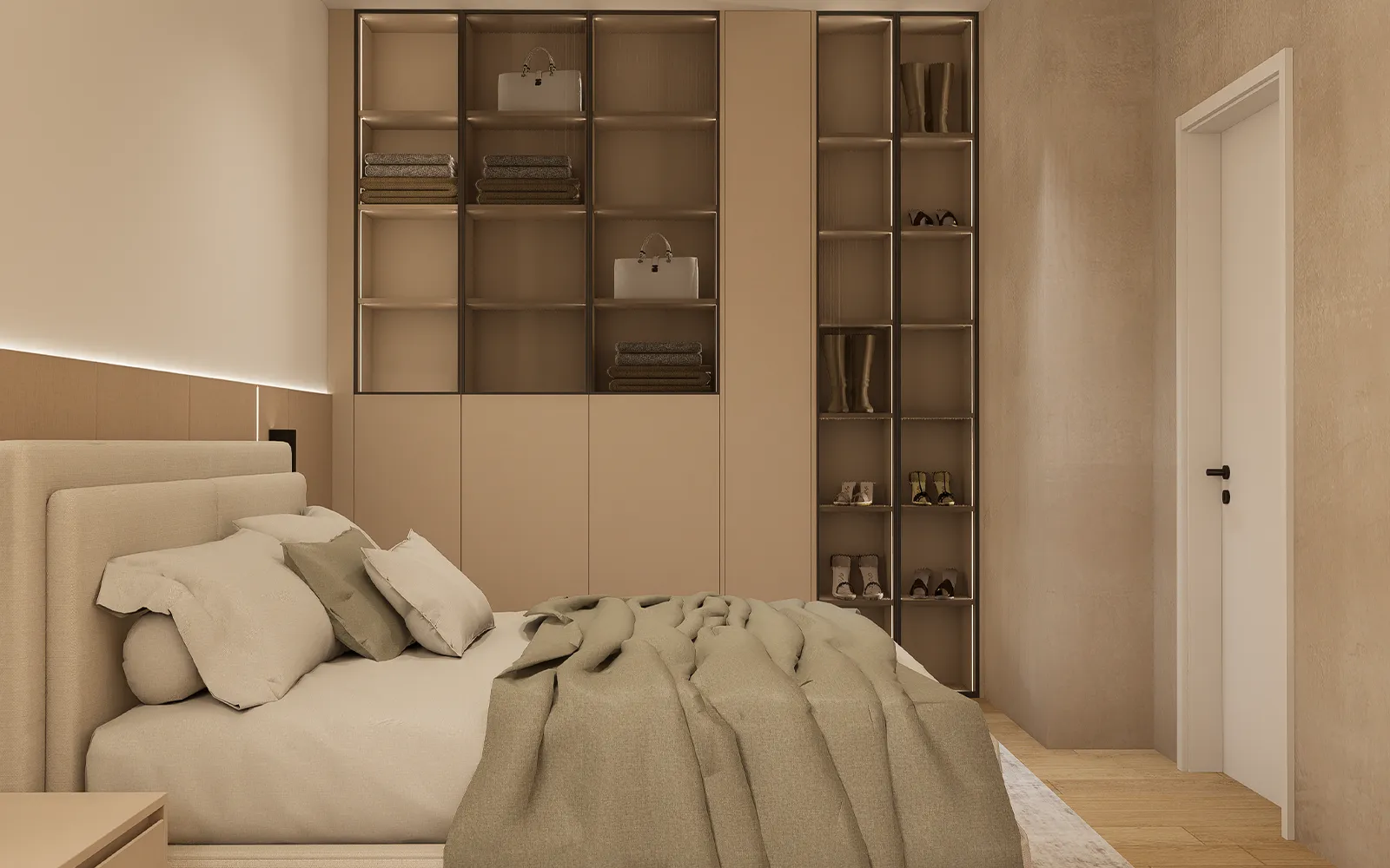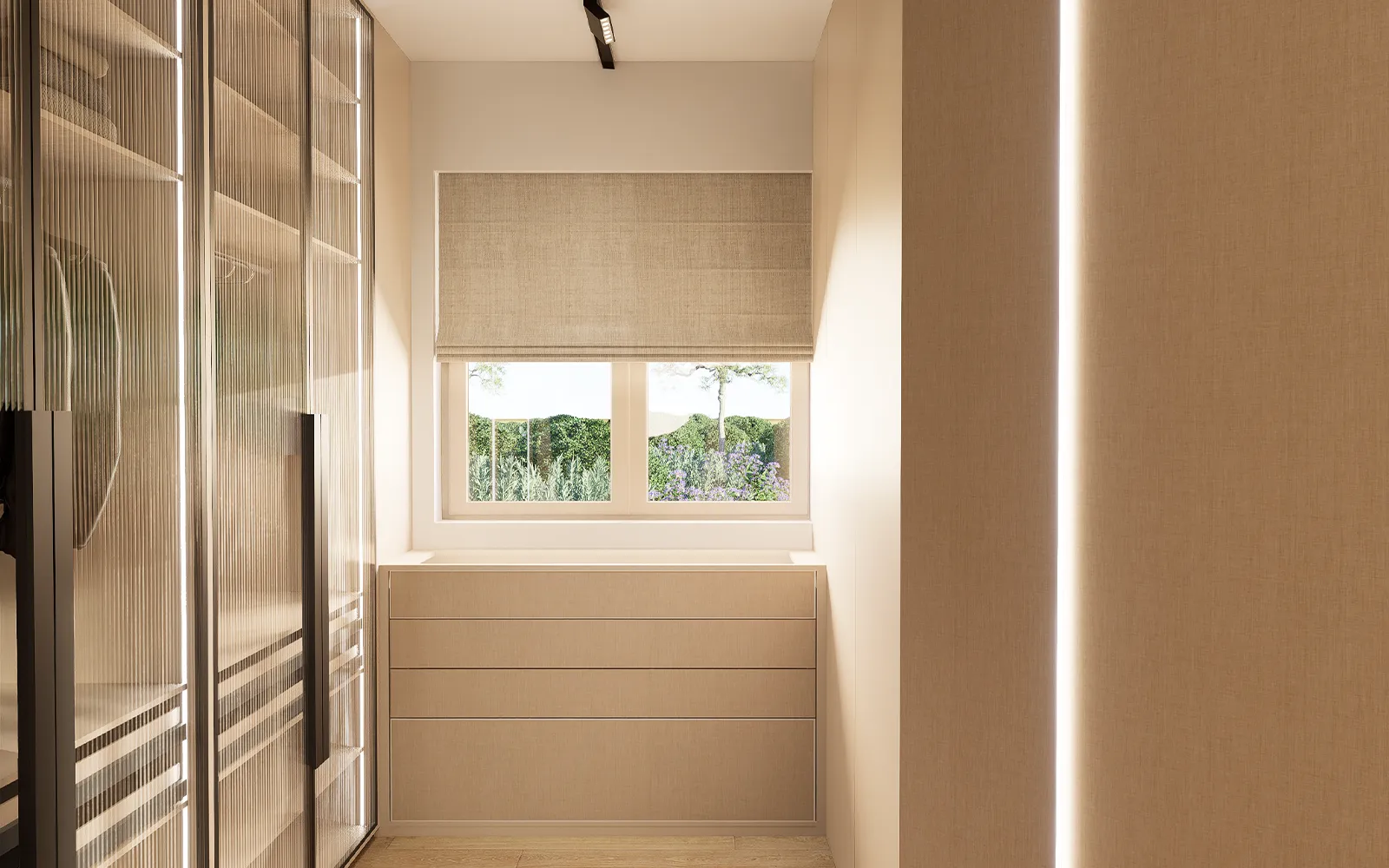 Garderobni ormari izvedeni su kombinacijom reljefnih poluzatamnjenih staklenih fronti i fronti u imitaciji tekstila. U prostoru garderobe nalazi se tapeta u imitaciji betona i veliko ogledalo koje dodatno povećava osjećaj prostora.
