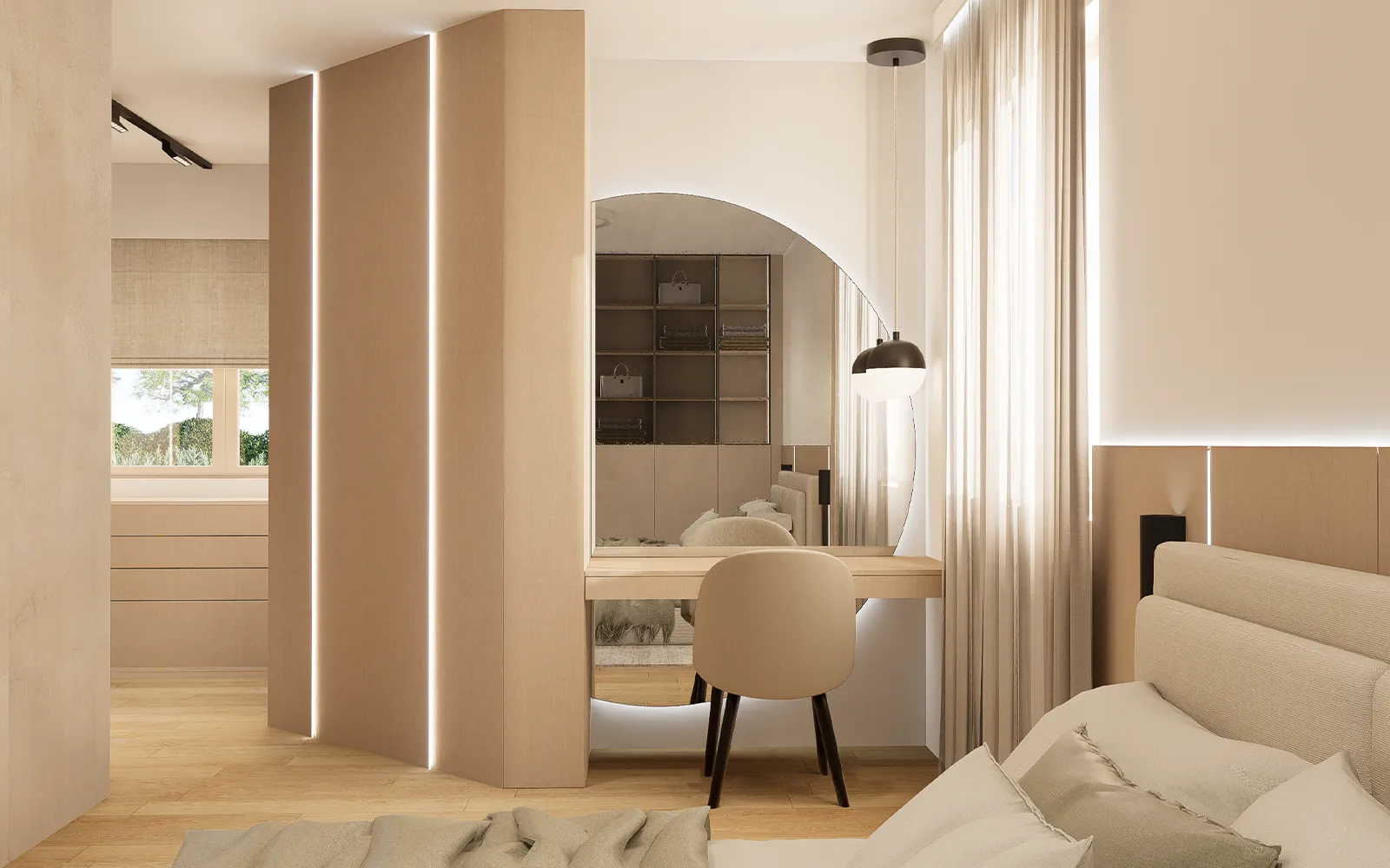 Centralni element sobe je krevet. S desne strane kreveta nalazi se plitki ormar za pohranu modnih dodataka, dok se s lijeve strane nalazi make-up kutak te dijagonalno postavljen ormar koji vodi prema prostoru garderobe.