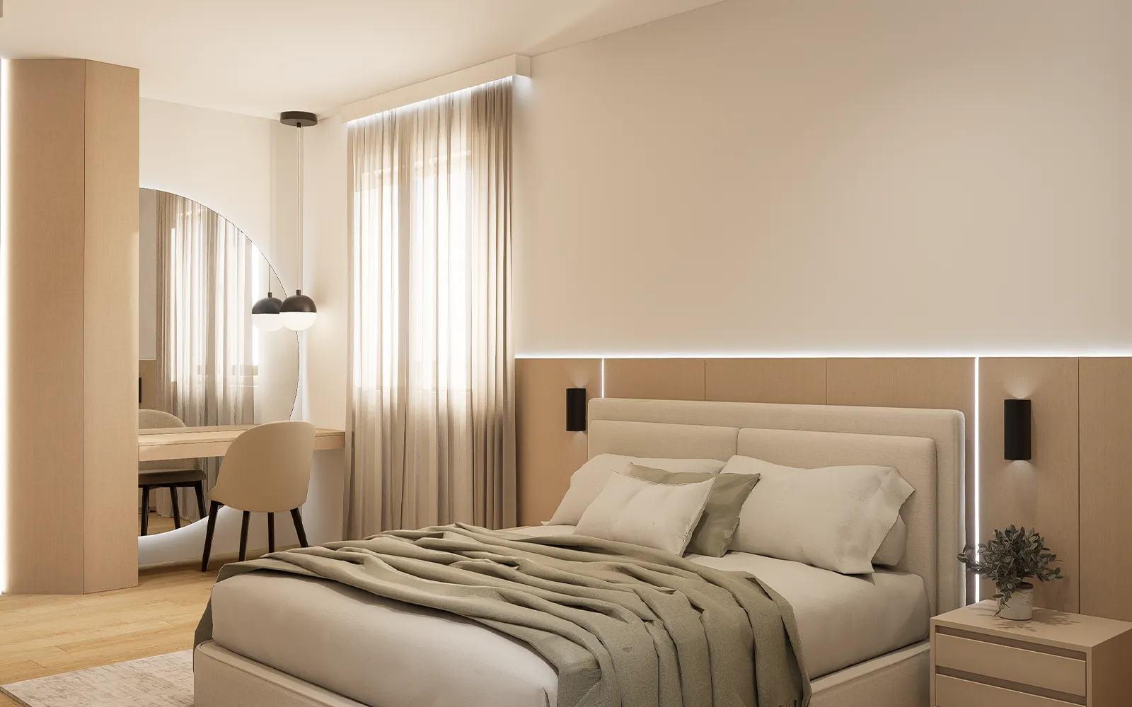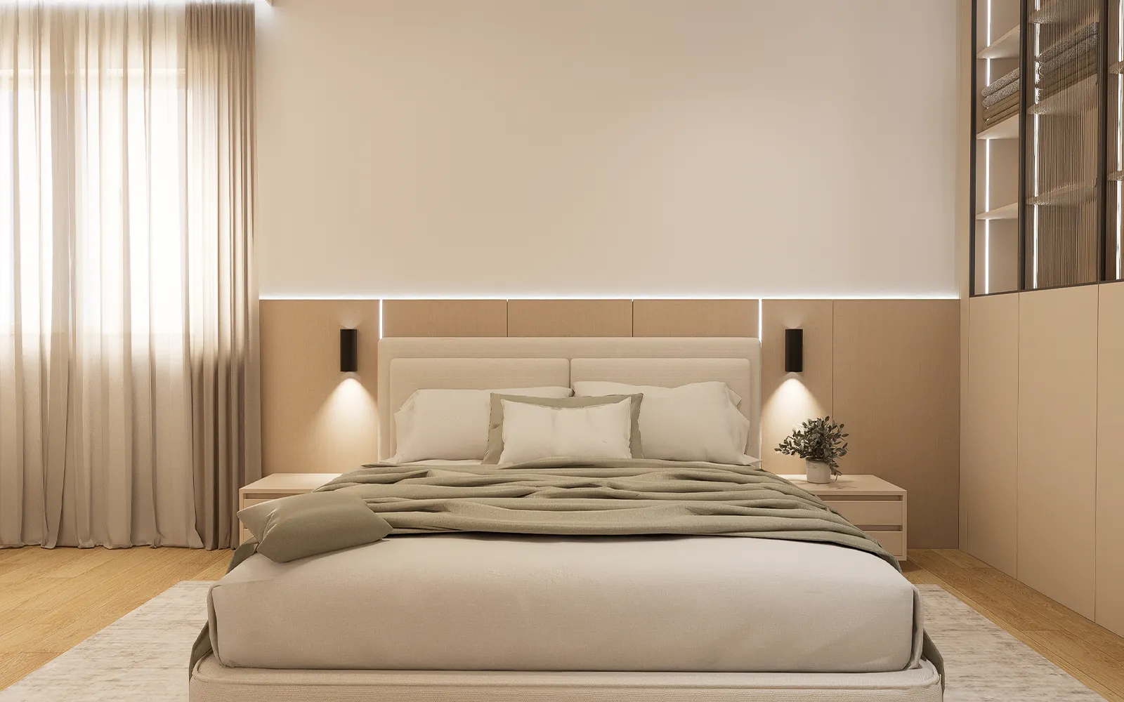 Dvije spavaće sobe spojene su u jednu cjelinu kako bi se dobila prostrana master soba koja se sastoji od spavaćeg dijela, garderobe i vlastite kupaonice.
