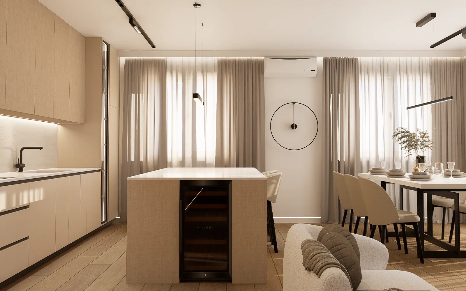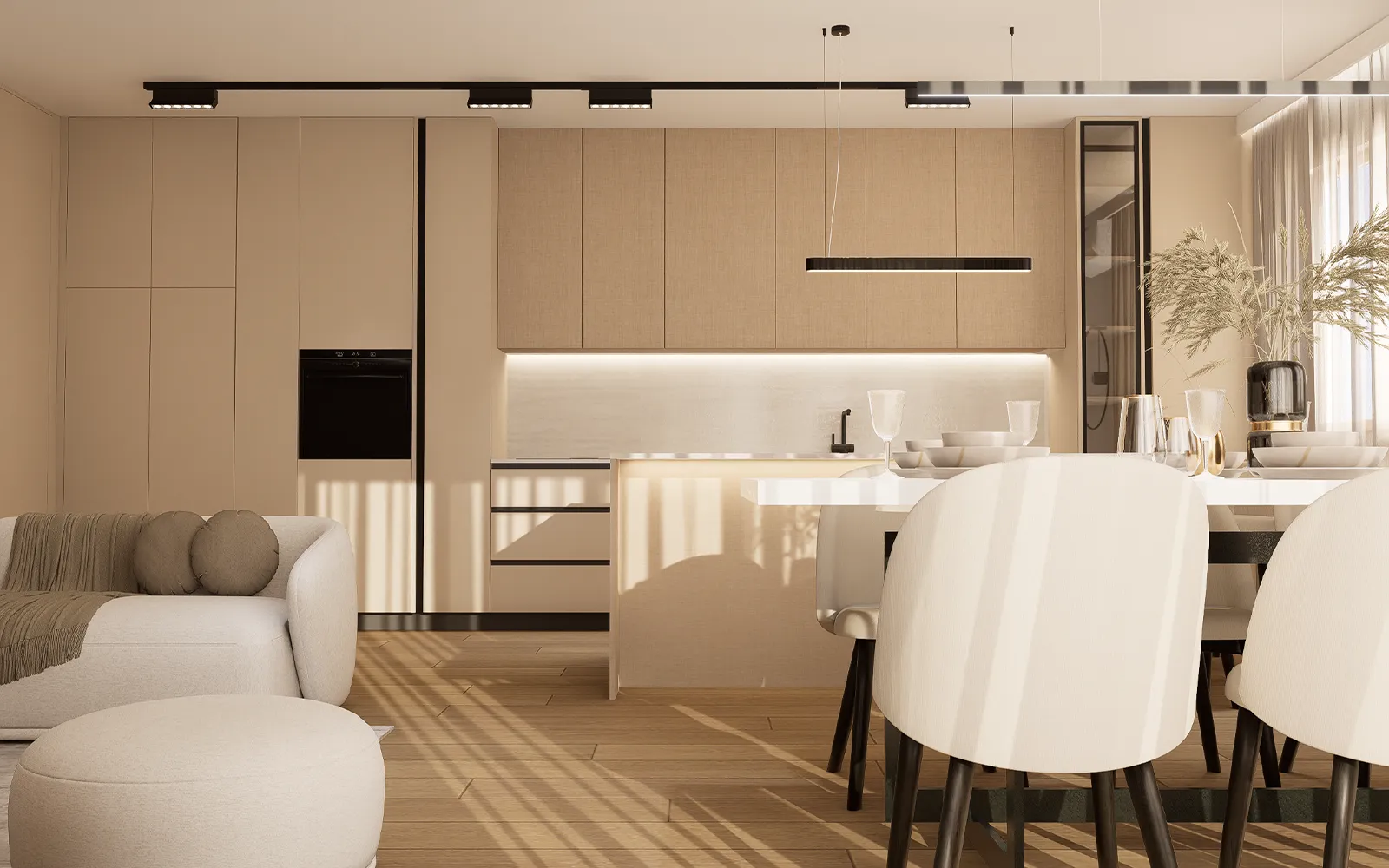Stan je organiziran kao otvoreni koncept koji povezuje dnevni boravak, kuhinju i blagovaonicu. Kako bi se dobila dodatna funkcionalnost i prostor za skladištenje, dio kuhinje je pregrađen te je formirana zatvorena ostava. U ostavu se ulazi kroz skrivena vrata integrirana u kuhinjske elemente, čime je zadržana čista linija i estetika kuhinje bez vidljivih prekida.