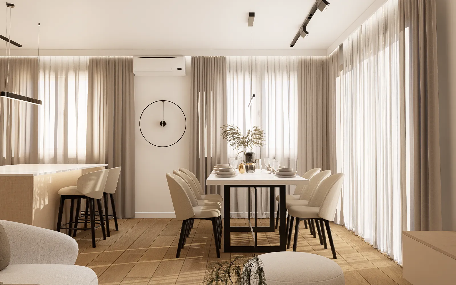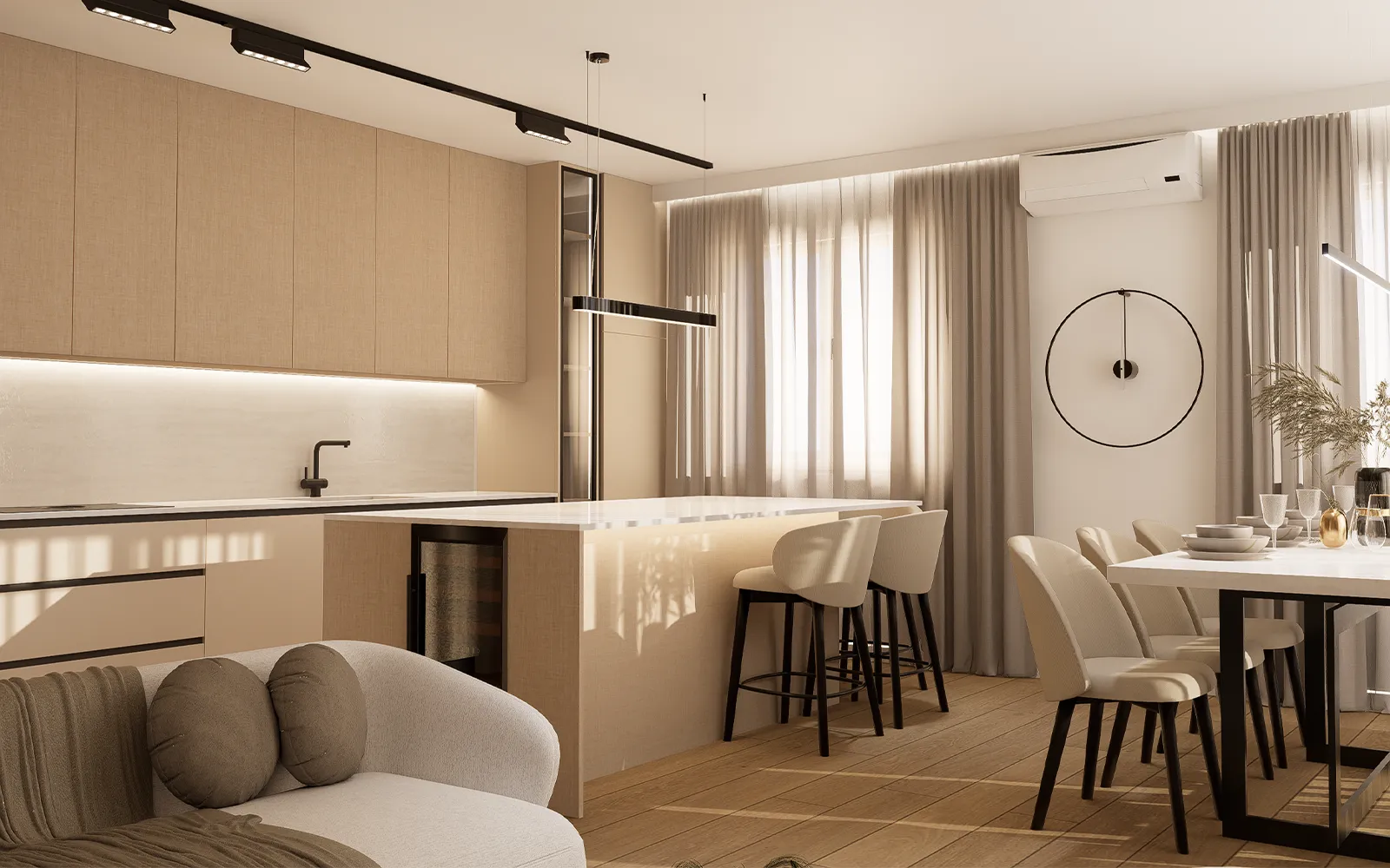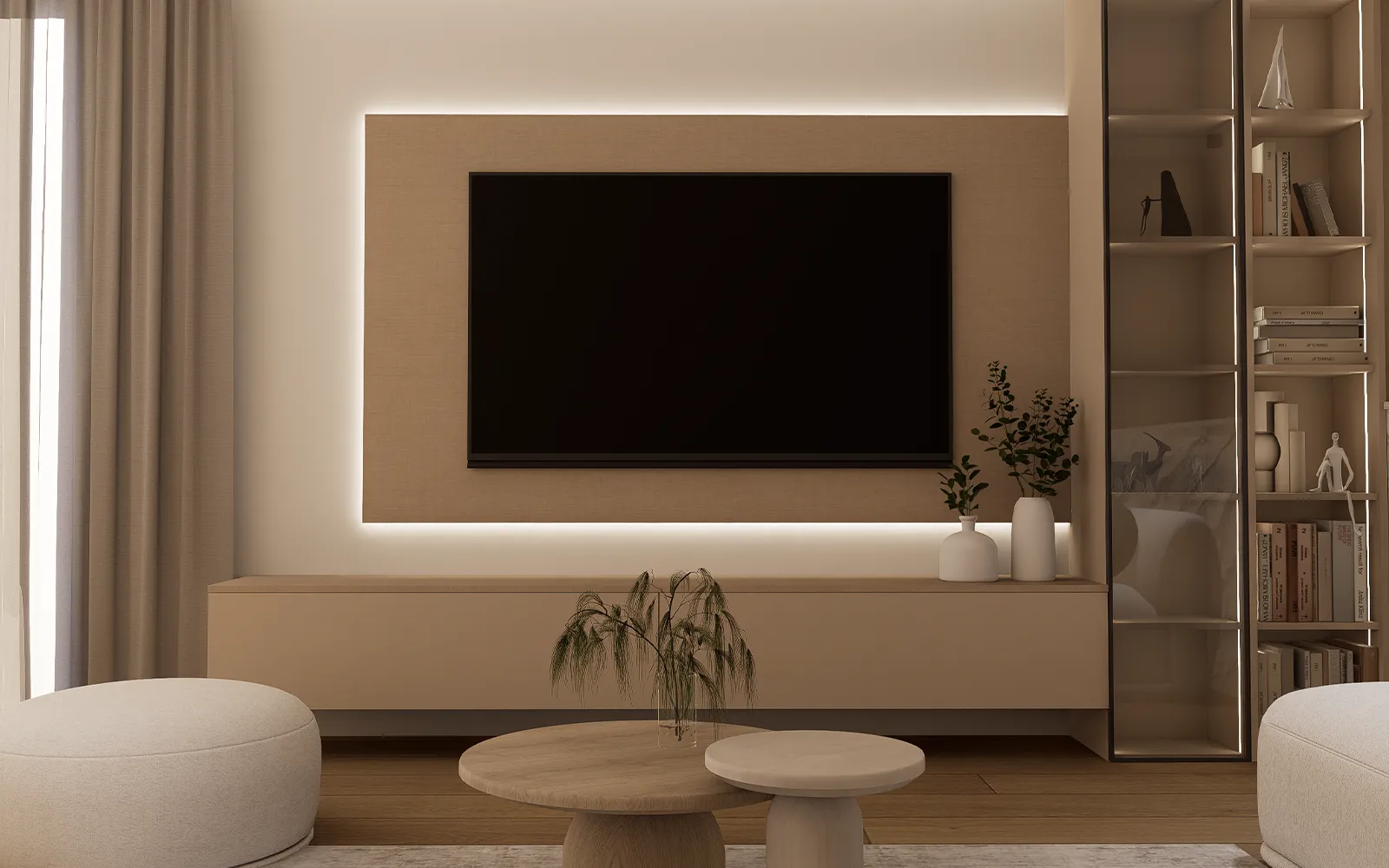 Na svim otvorima u stanu nalaze se zavjese i blackout dekori.Karniše zavjesa skrivene su unutar štukatura iza kojih je postavljena LED ambijentalna rasvjeta.