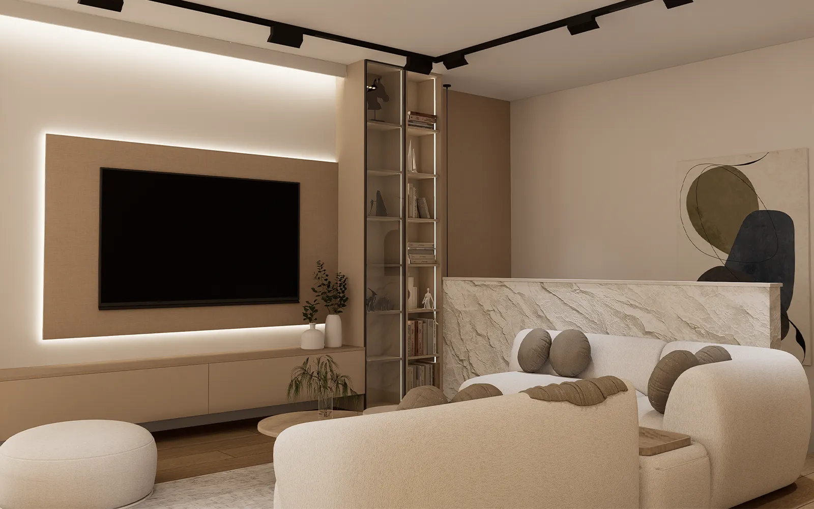 U dnevnom boravku nalazi se velika kutna garnitura zaobljene forme te dva okrugla stolića od masiva. Poseban naglasak u prostoru čini segment zida izveden kao umjetna stijena, koji prostoru daje skulpturalni i dekorativni karakter.