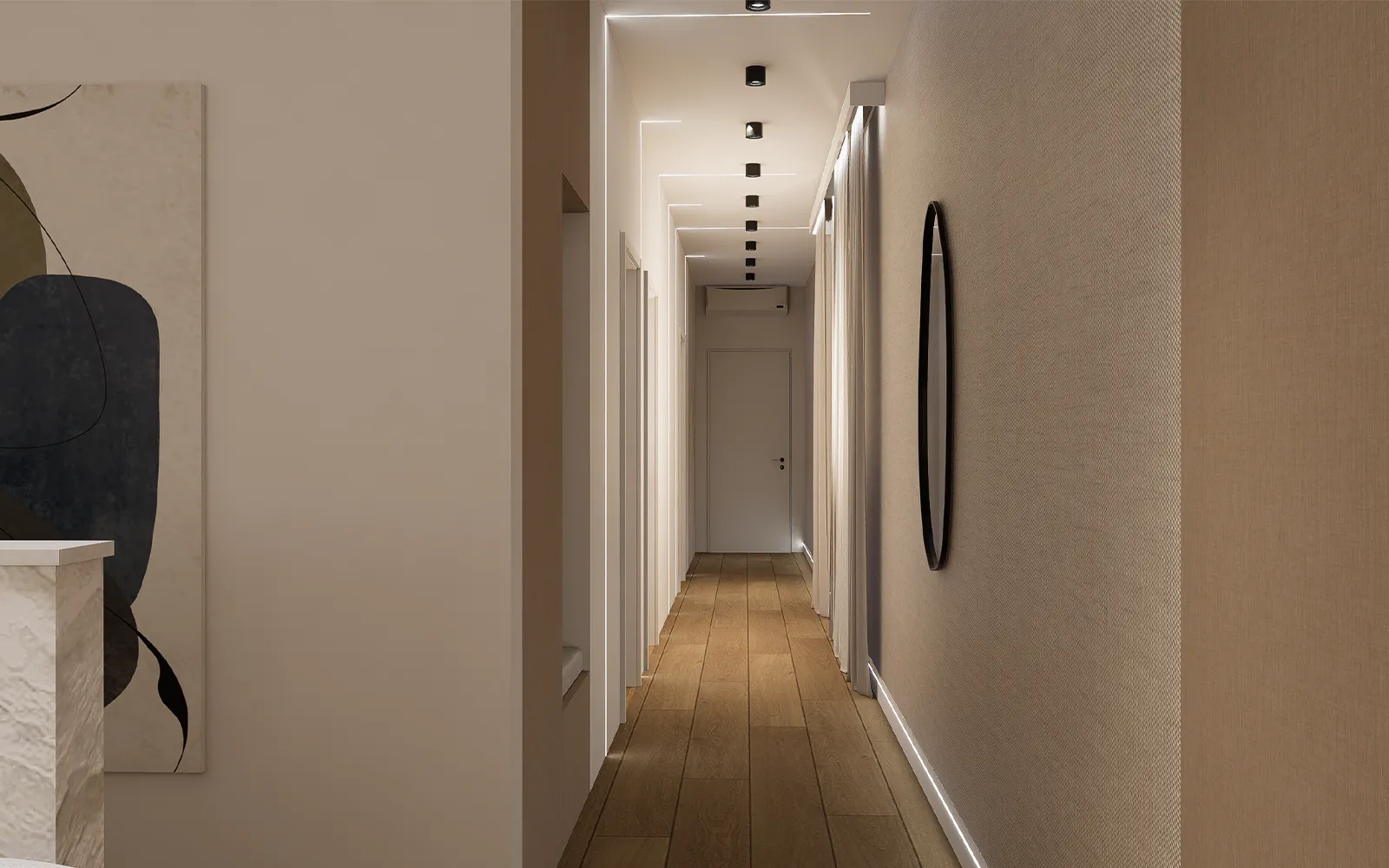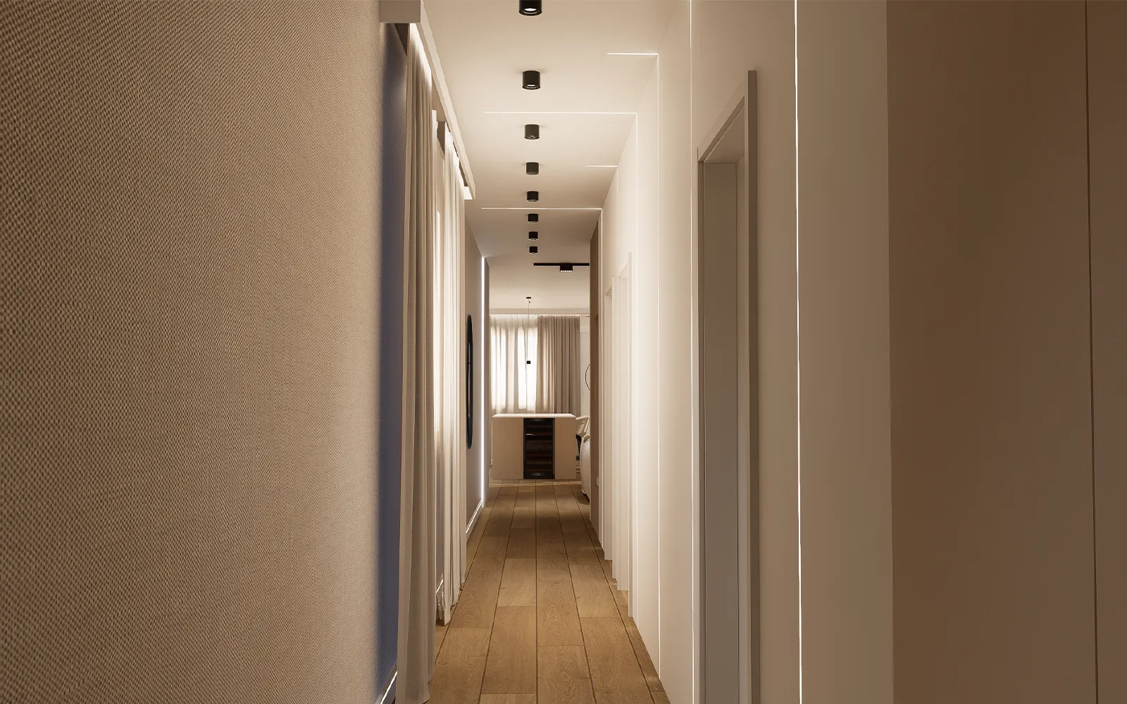 Iz otvorenog dnevnog prostora pruža se dugačak hodnik iz kojeg se ulazi u spavaće sobe i kupaonice. Jedan zid hodnika u potpunosti je obložen tapetom u imitaciji tkanine, dok je na suprotnom zidu integrirana vertikalna LED rasvjeta koja se djelomično nastavlja i na strop. Na taj način hodnik nije samo komunikacijski prostor, već postaje važan dizajnerski element interijera koji stvara ambijent i vizualni identitet stana.