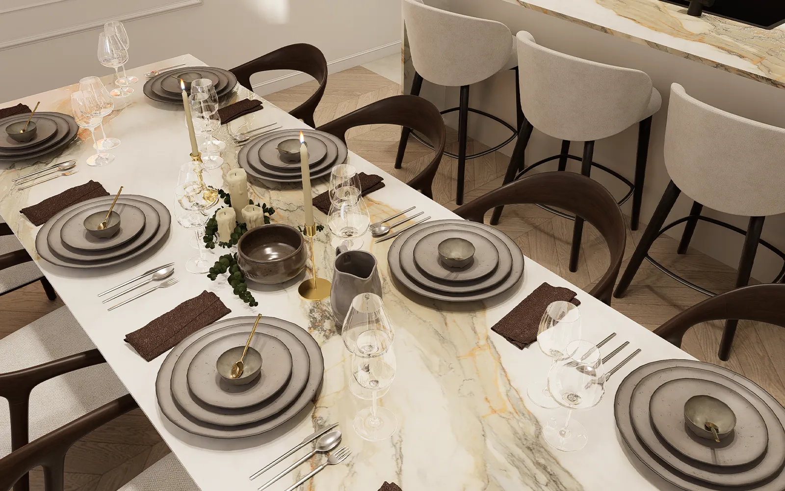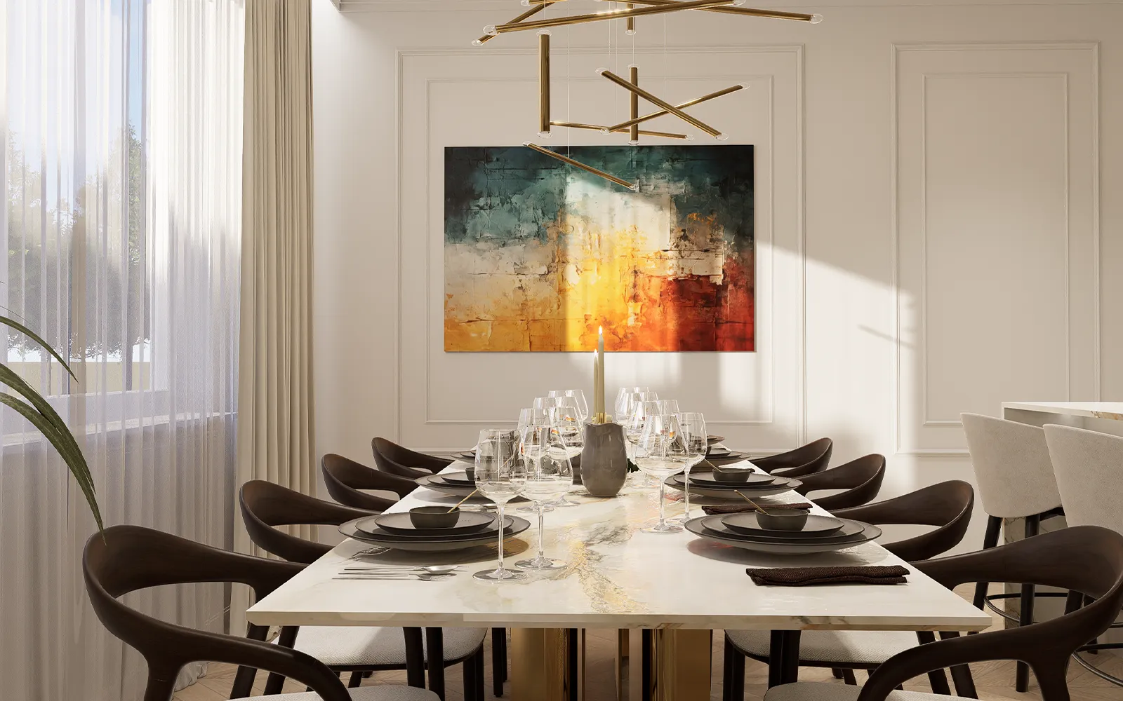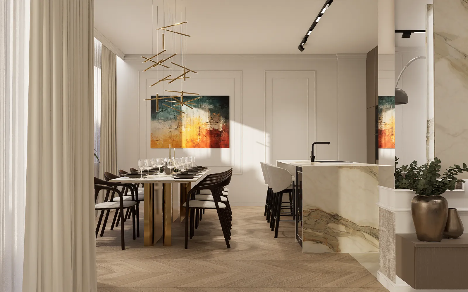 U središtu blagovaonice nalazi se unikatni stol iz vlastitog dizajnerskog potpisa – M1st Design Studio, sa zlatnim nogama koje reflektiraju svjetlo i eleganciju. Iznad stola lebdi skulpturalna kompozicija rasvjete, koja prostoru dodaje dodatnu razigranost i luksuz.