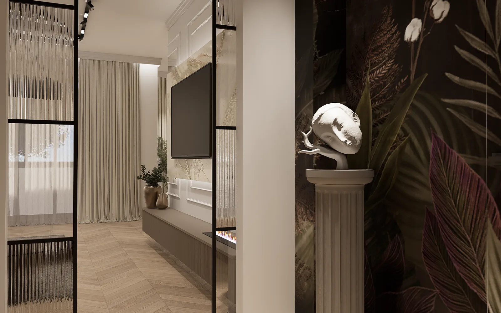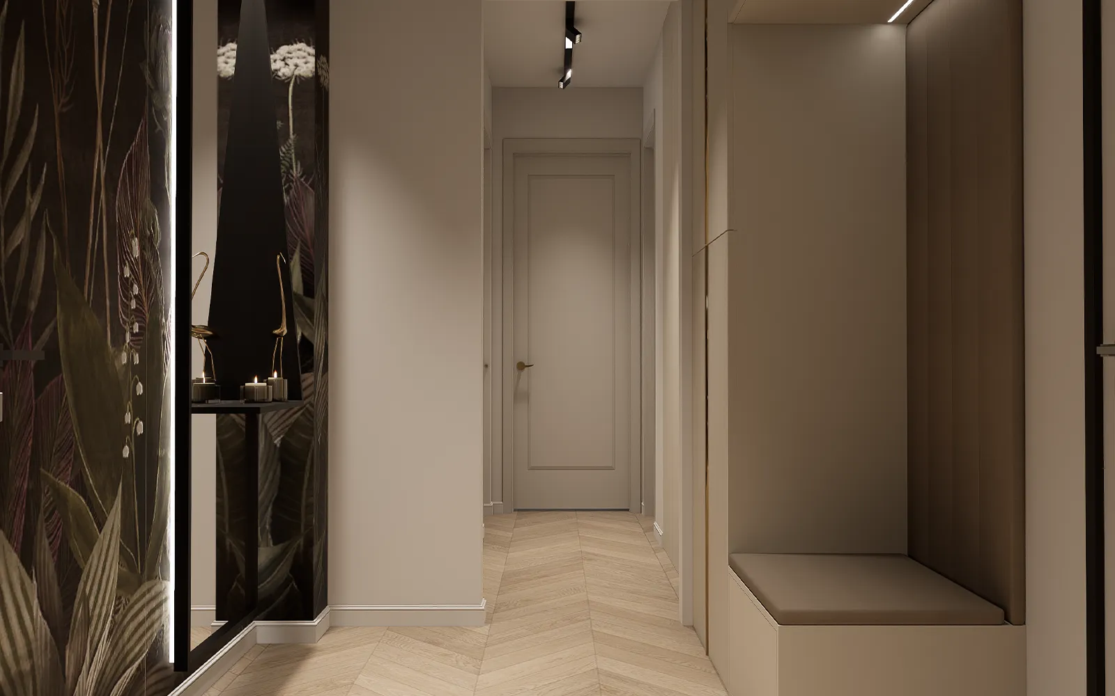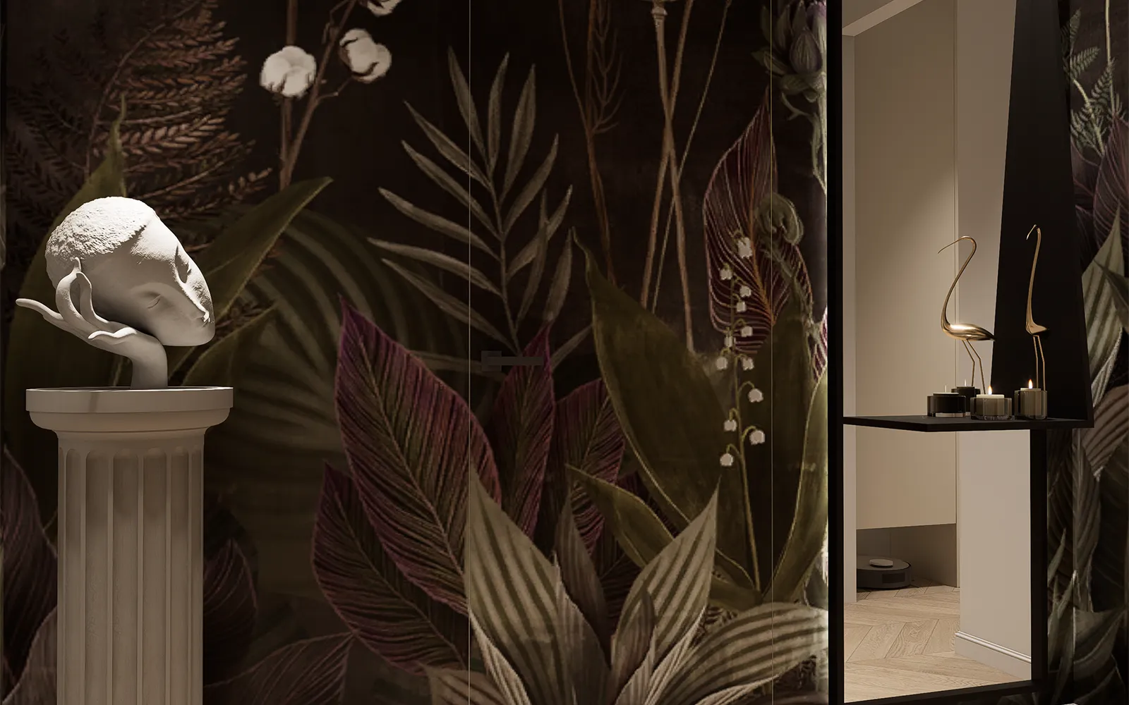 Već pri ulasku u stan, pažnju odmah privlači crna tapeta s cvjetnim motivima. Riječ je o dramatičnom, ali elegantnom statement zidu. On uokviruje vrata sa skrivenim štokovima. Iza tih vrata smještena je glavna spavaća soba. Dok prolazimo hodnikom, pogled se otvara prema prostranom dnevnom prostoru otvorenog koncepta.