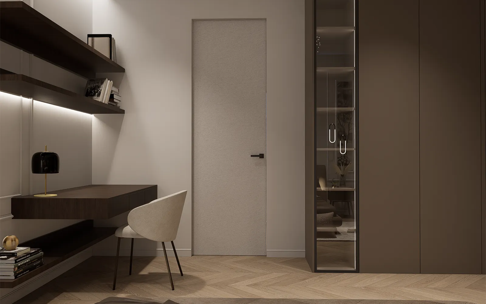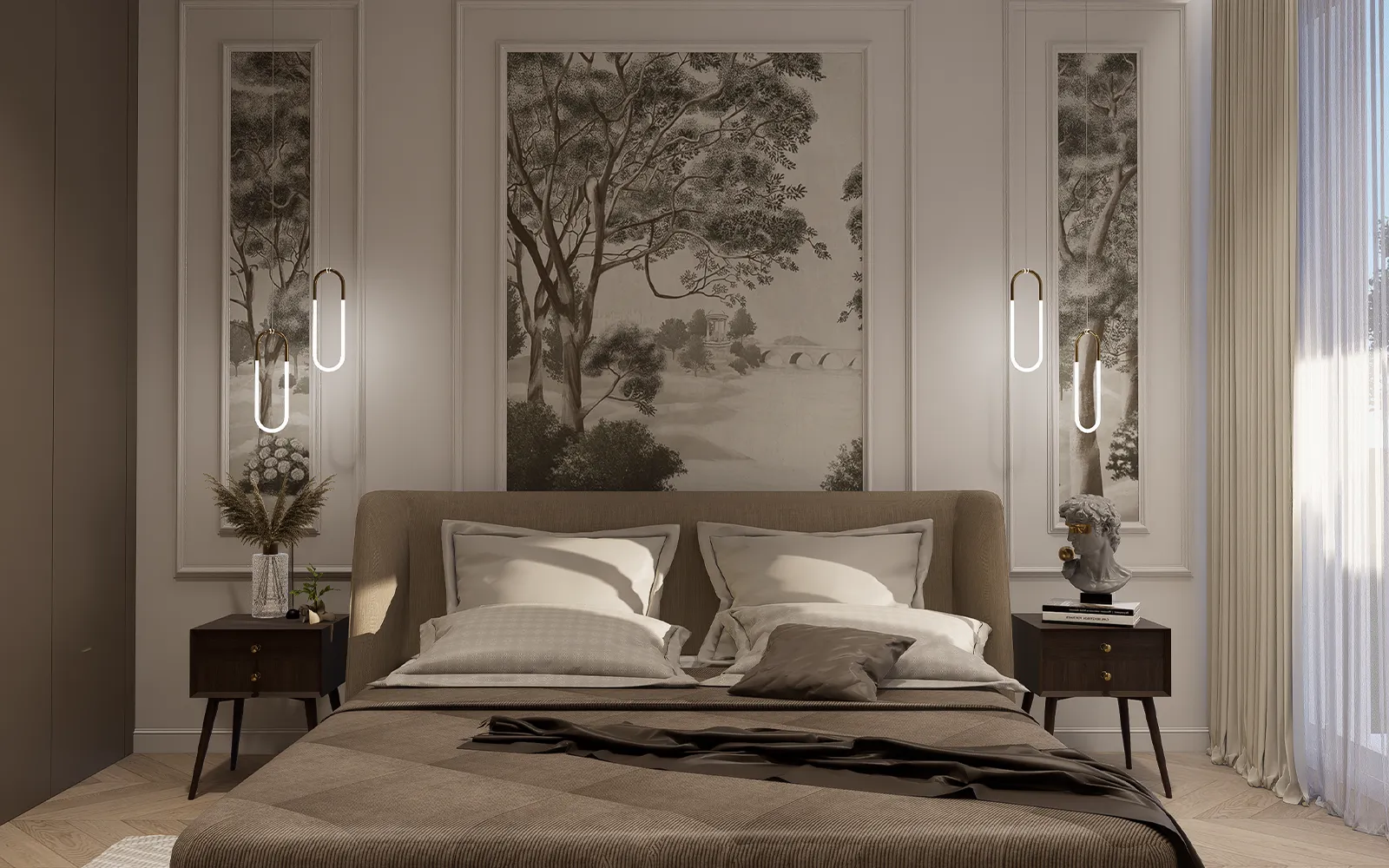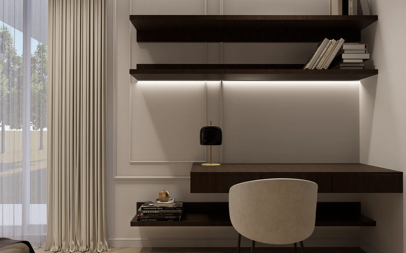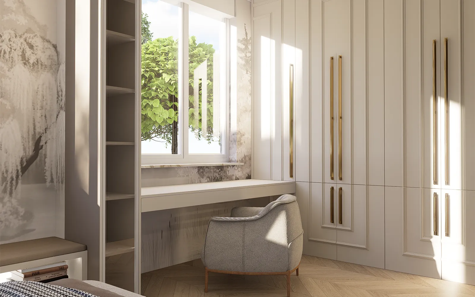 S lijeve strane smješten je ormar u istom svijetlom drvenom dekoru. Pored vrata koja vode na balkon nalazi se radni stol s konzolnim policama od tamnog drveta. U središtu sobe visi zlatni luster koji unosi dašak barokne raskoši. Taj efekt je pažljivo uravnotežen suvremenim linijama ostatka interijera.