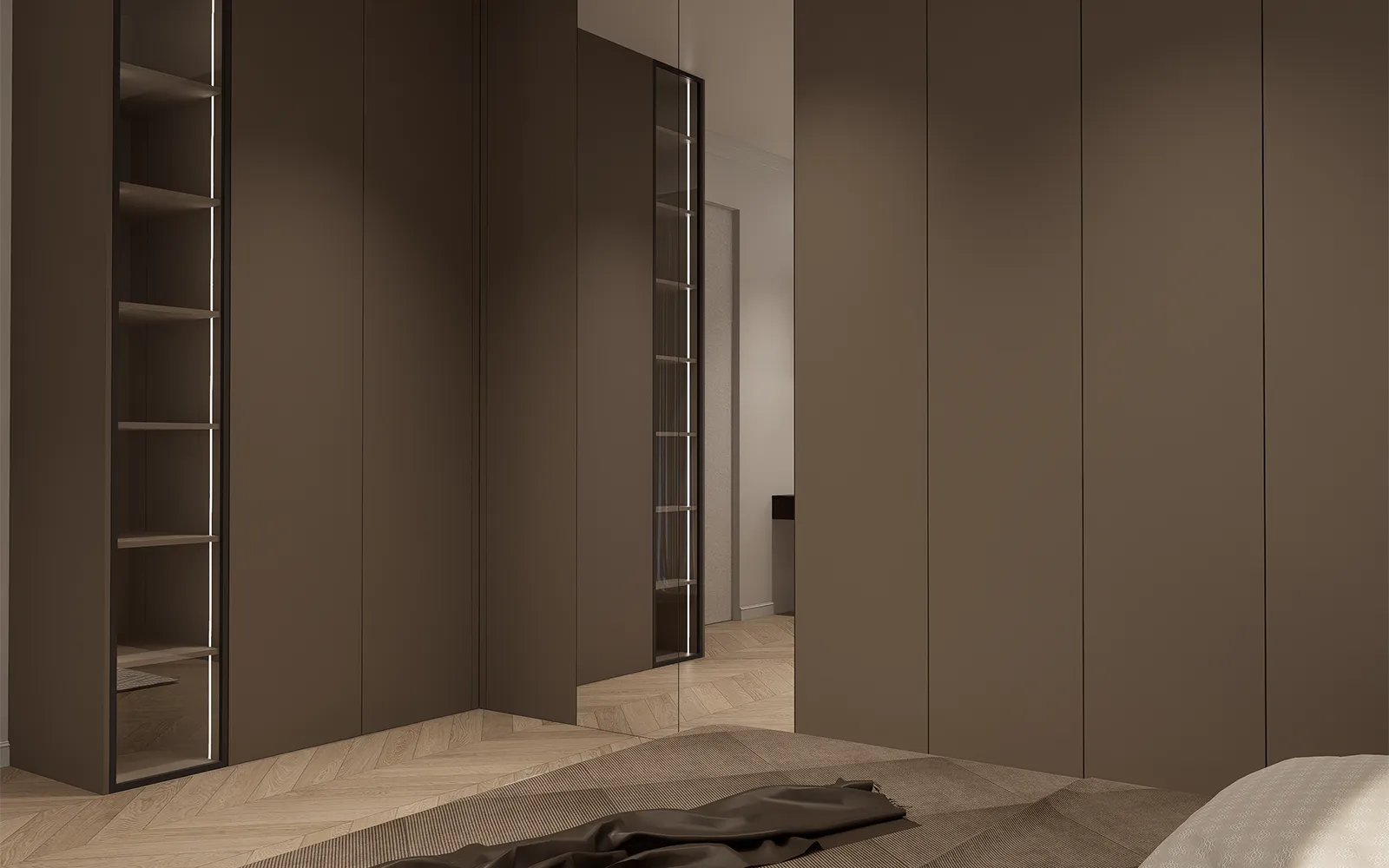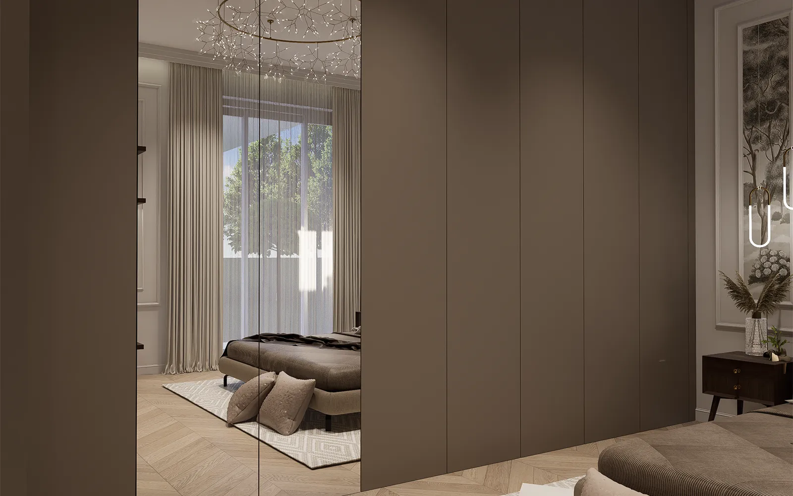 Uz krevet se nalazi klupica, čija je bočna strana osmišljena kao praktična polica za knjige. Nasuprot nje smješten je L-ormar u kašmir i bež tonovima. Ormar je ukrašen štukaturama i zlatnim ručkama, što dodatno naglašava eleganciju prostora.