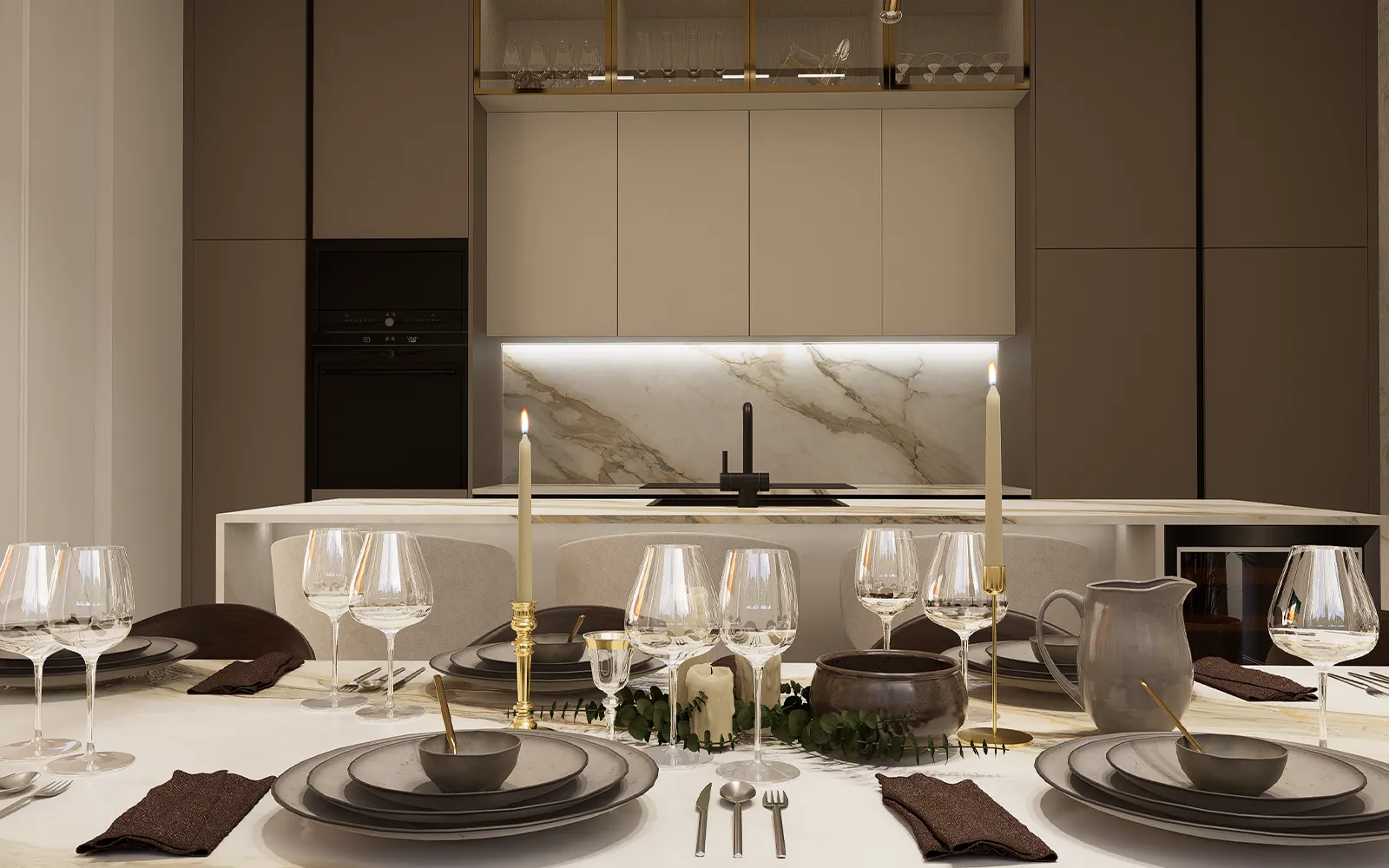 Kuhinja se smjestila uzduž zida, s visokim i donjim elementima u svijetlom drvenom dekoru. Gornji elementi dolaze u suptilnim kašmir tonovima, s nježnim mat završetkom koji prostoru daje dodatnu mekoću. U središtu kuhinje nalazi se otok koji uključuje sudoper i perilicu posuđa. Funkcionalnost je pažljivo usklađena s estetikom, čime se postiže skladan i promišljen dizajn.