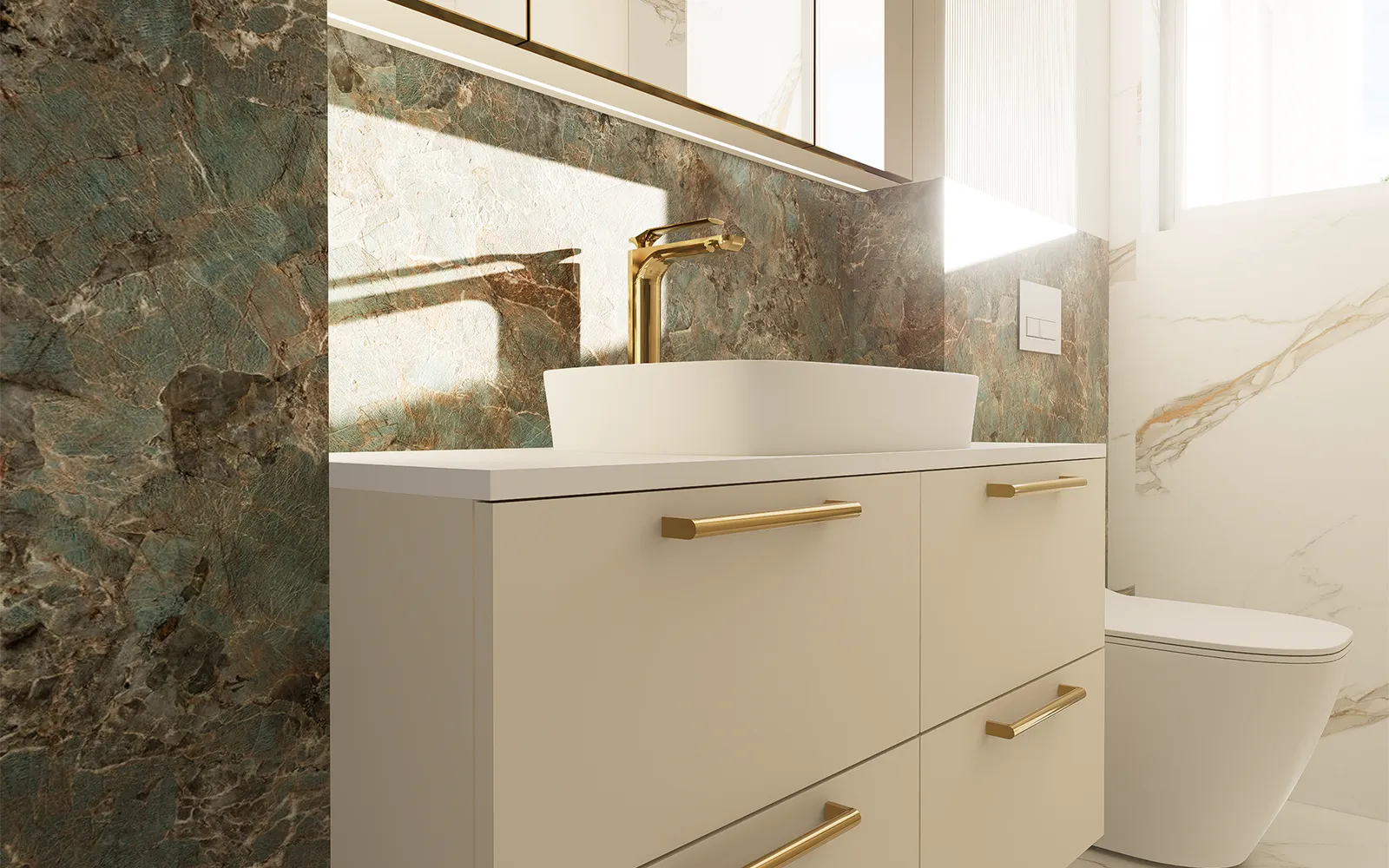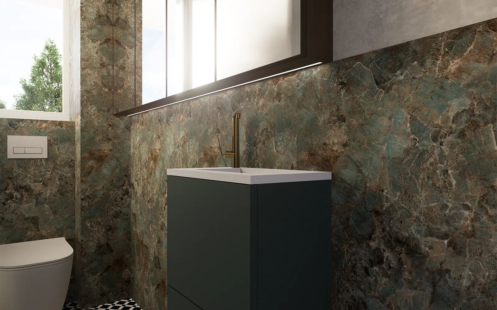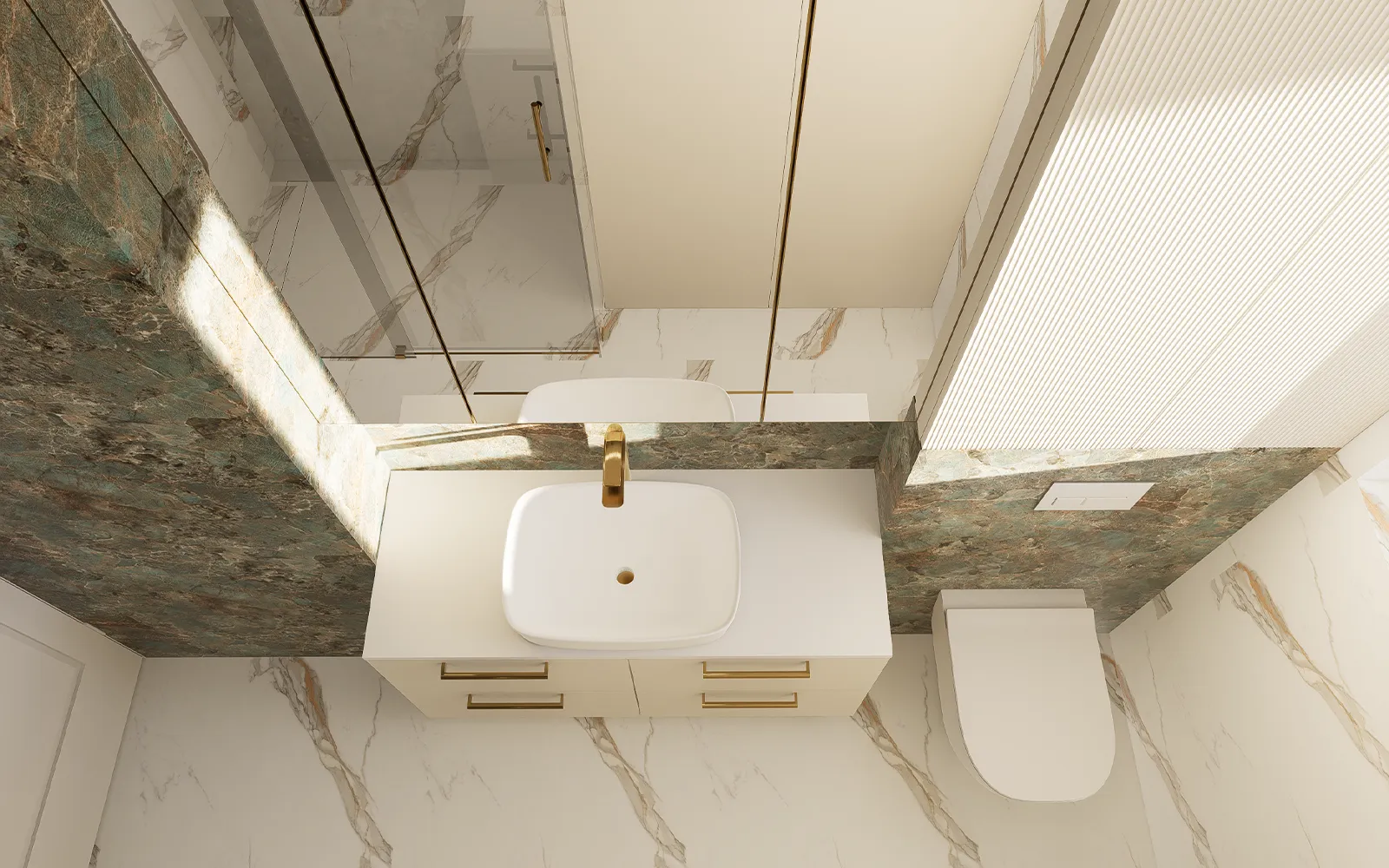 Obložena je bijelim mramorom sa zlatno-sivim žilama, dok je jedan naglašeni zid u zelenom mramoru sa zlatnim detaljima, na kojem se nalazi umivaonik u obliku zdjele i element s ogledalnim frontama. Zlatne pipe i detalji dodatno podižu dojam luksuza.