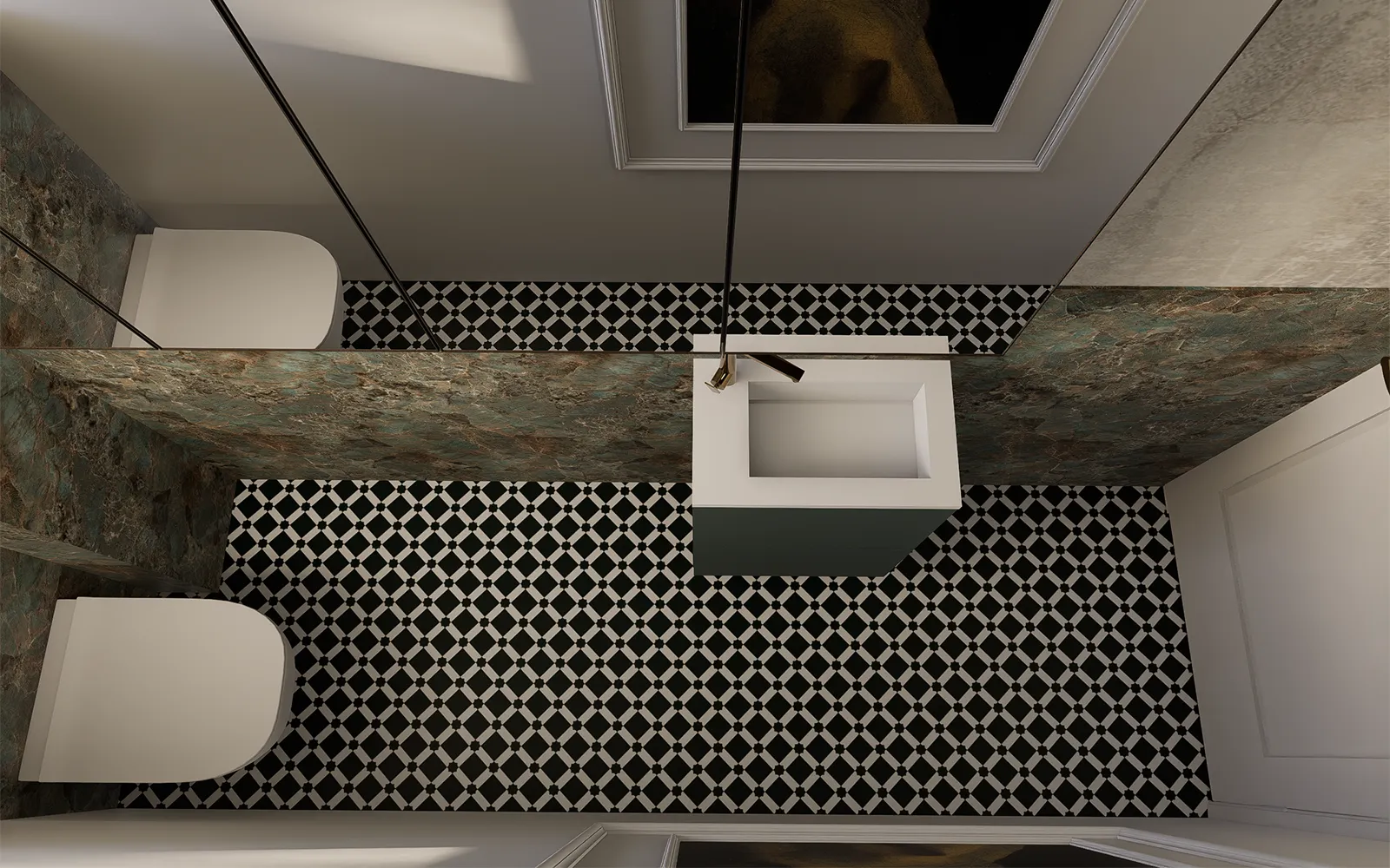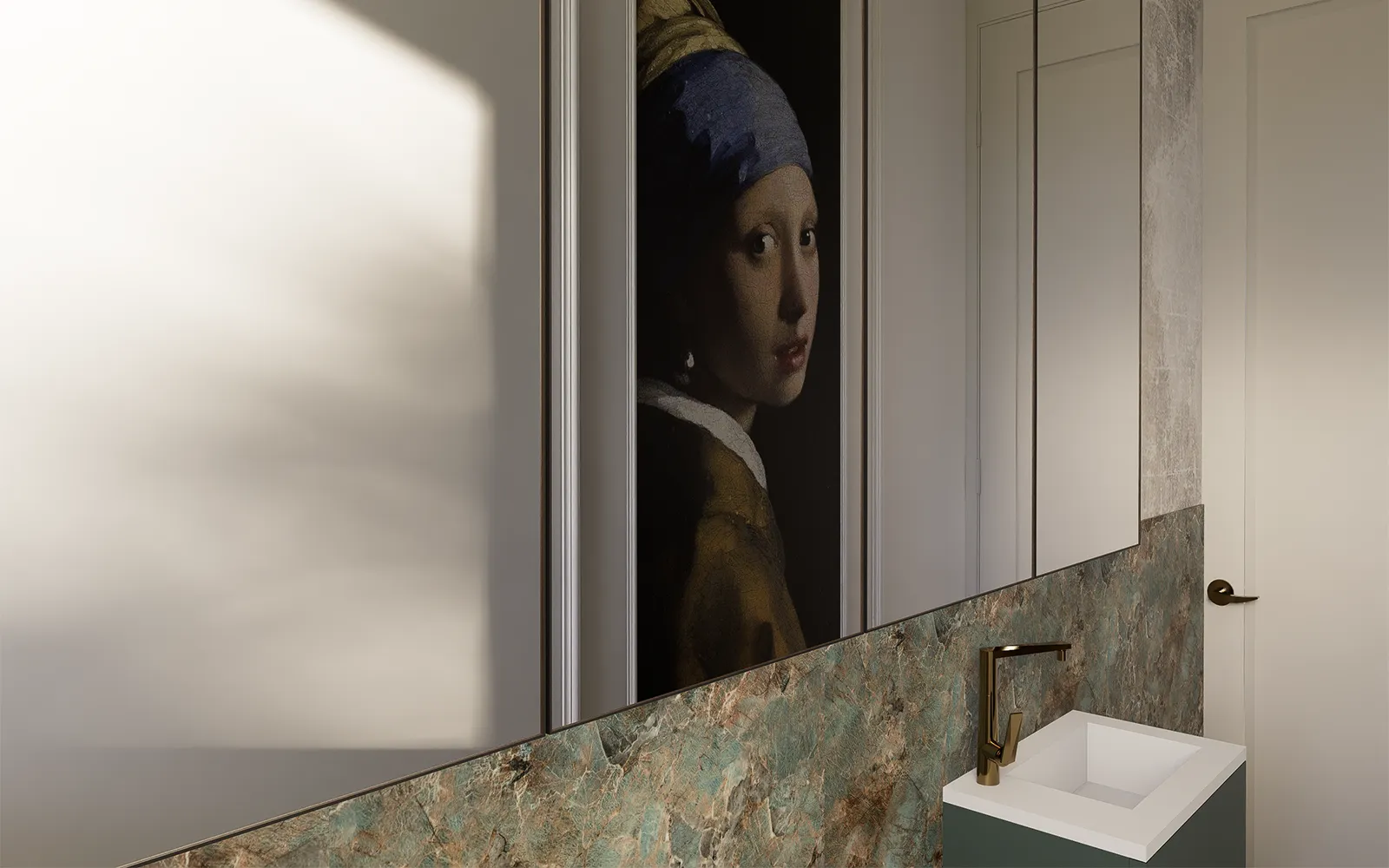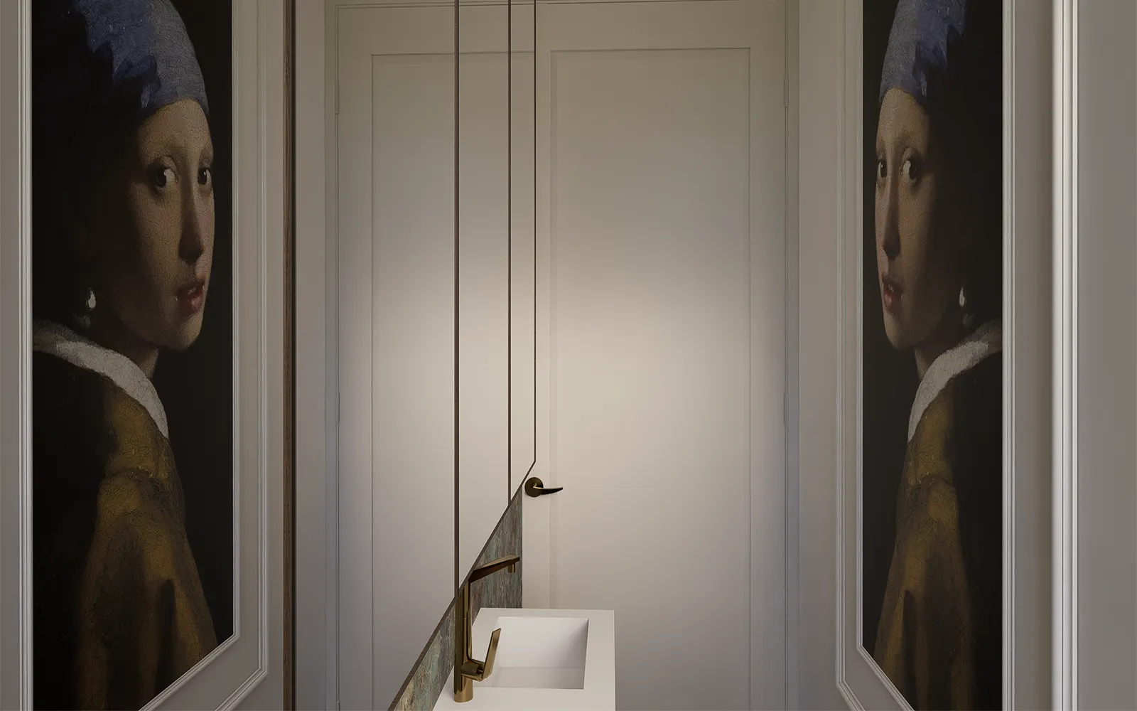 Inspiriran retro estetikom – pod prekriven crno-bijelim pločicama, dok su zidovi u zelenom mramoru. Polovinu zida zauzima veliko ogledalo, koje reflektira zid nasuprot s poznatim motivom: Djevojka s bisernom naušnicom, uokvirenu štukaturama.