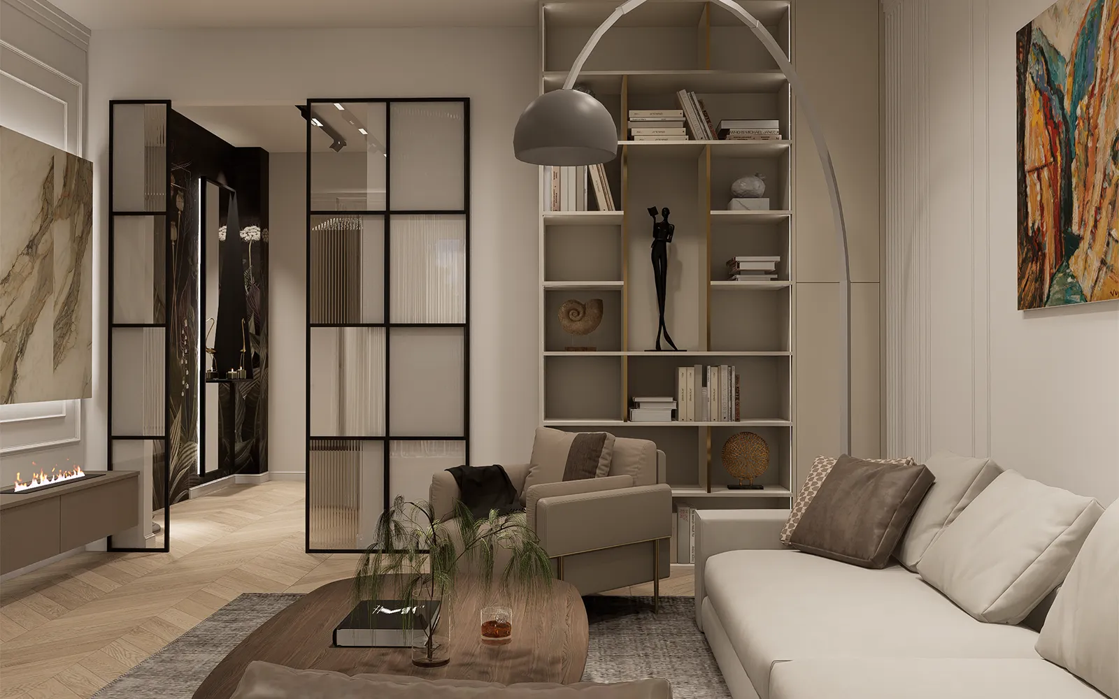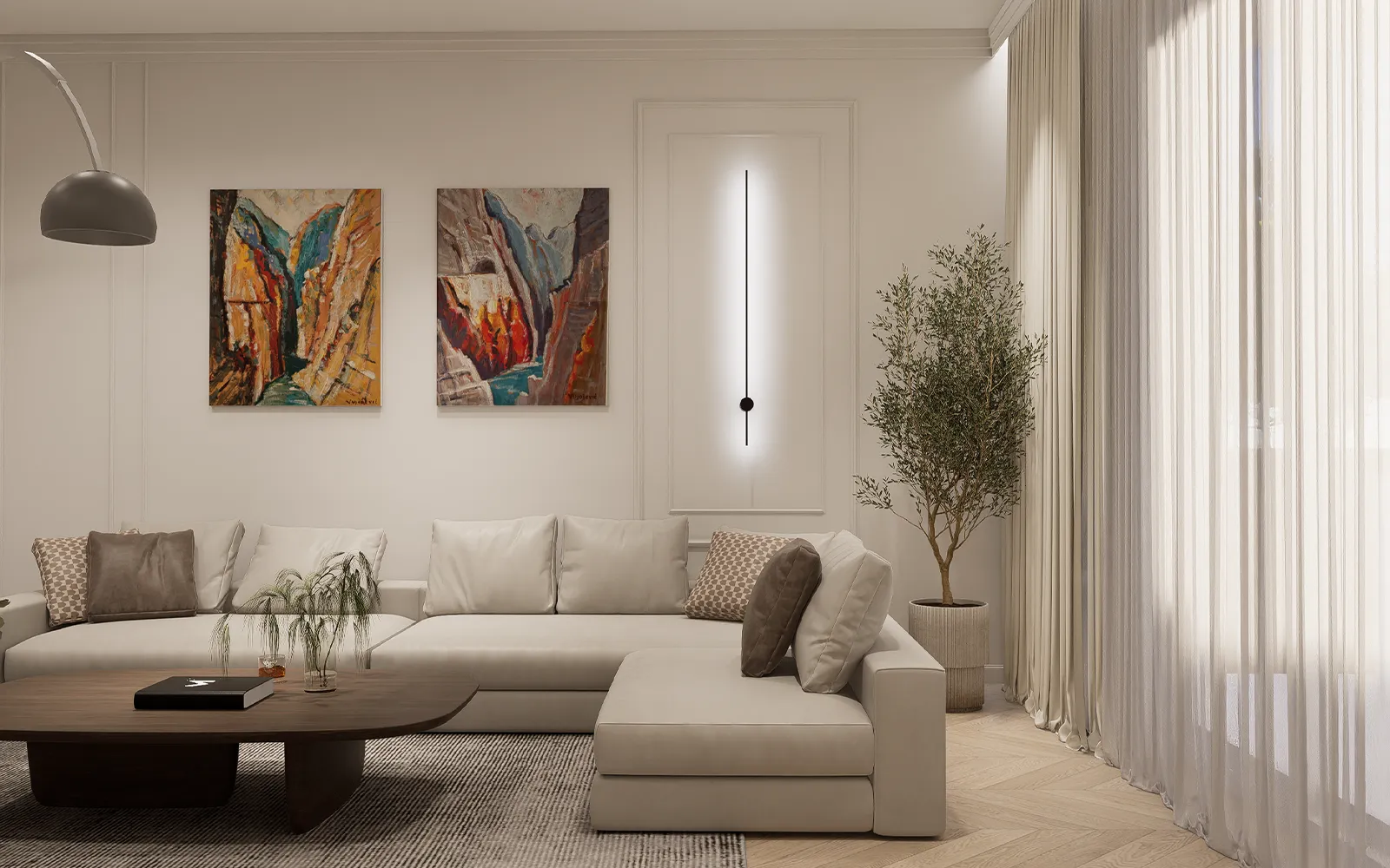 Dominantni element dnevne zone, uređene u duhu francuskog stila, je velika bež kutna garnitura. Pozicionirana je uz zid obrubljen pravokutnim štukaturama, unutar kojih se nalaze apstraktne umjetnine u žarkim bojama. Zidna rasvjeta, smještena između štukatura, dodatno naglašava dinamiku i dubinu prostora. Tako se stvara atmosfera sofisticirane elegancije, karakteristična za francuski stil interijera.