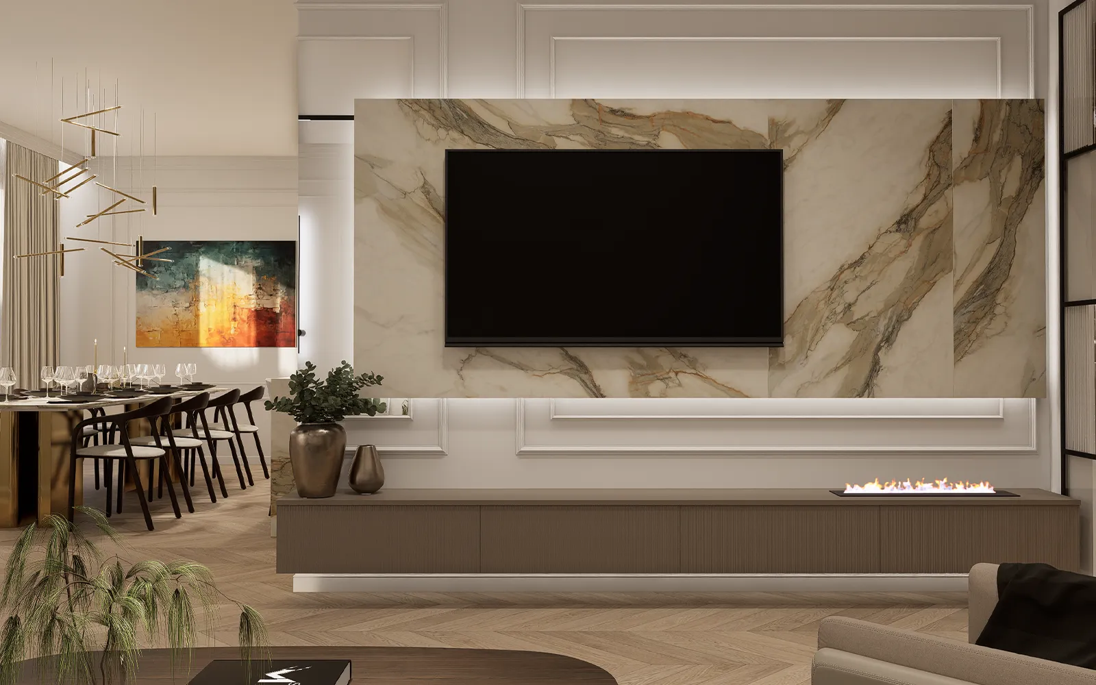 Nasuprot garniture nalazi se konzolna komoda s integriranim električnim kaminom. Iznad nje je mramorni panel s TV-om, naglašen indirektnom LED rasvjetom. Isti mramorni materijal proteže se kroz blagovaonski stol, kuhinjski otok i radnu plohu. Na taj način stvara se snažna vizualna i materijalna povezanost svih zona.
