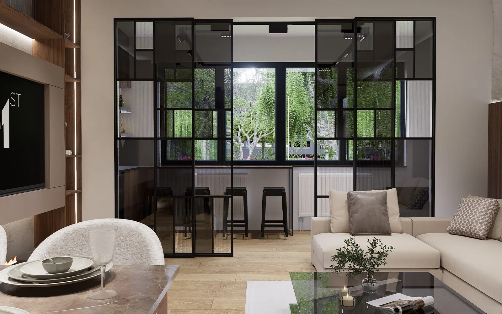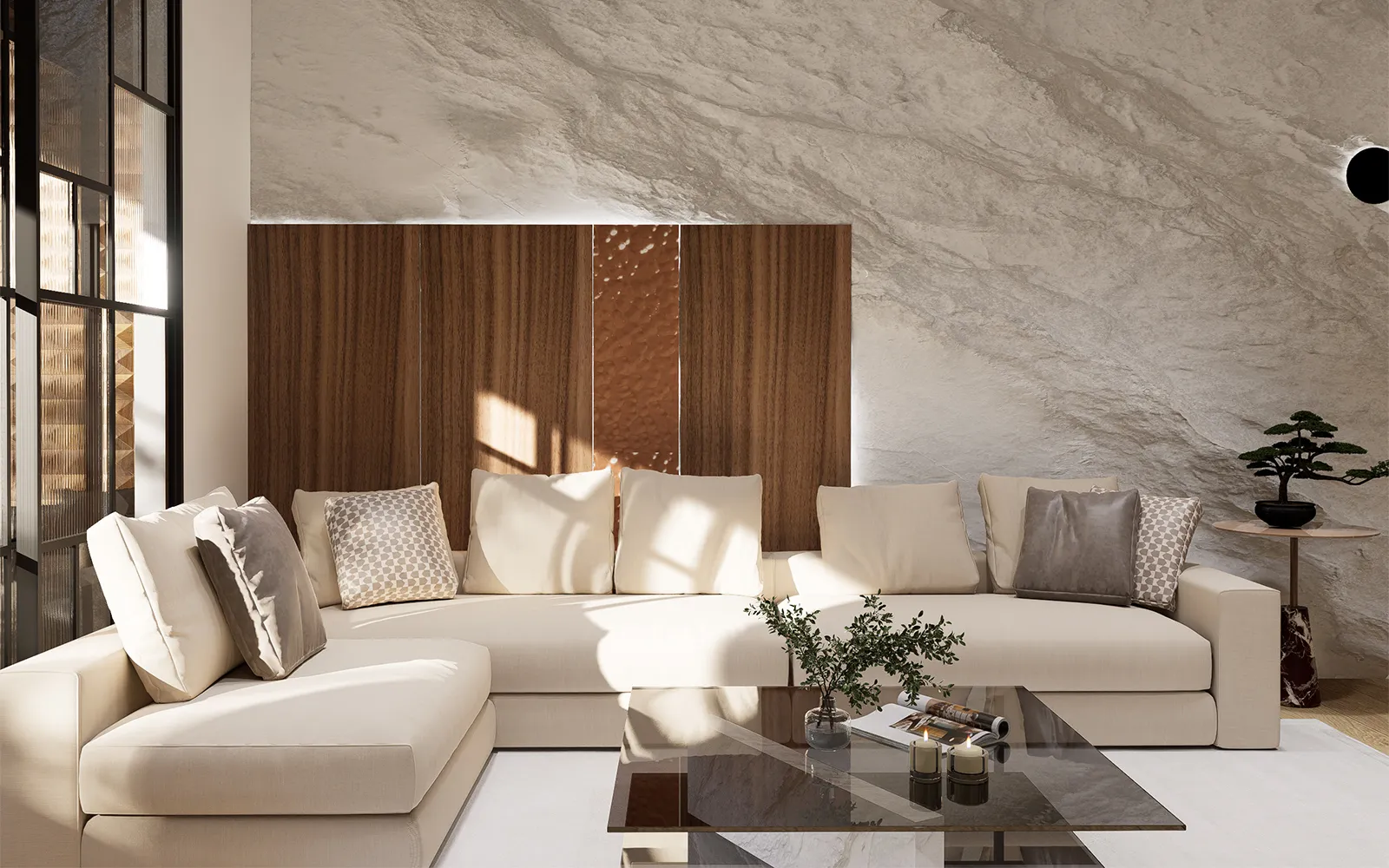 U dnevnom boravku dominira L-garnitura u bež tonu, uz drvene i bakrene panele te umjetnu stijenu koja se nadovezuje na hodnik. TV kompozicija obložena tapetom u betonskom efektu upotpunjuje suvremen izgled.