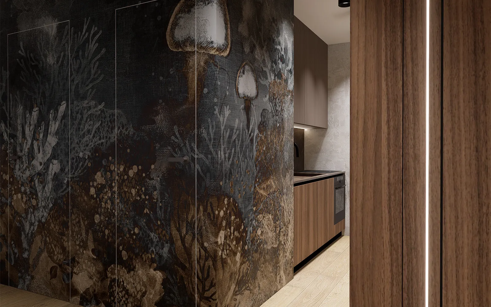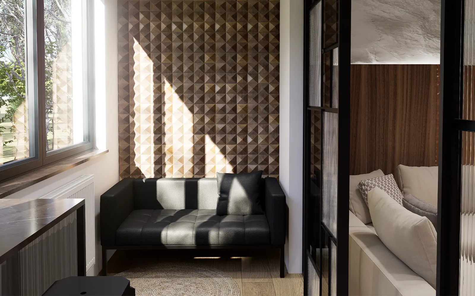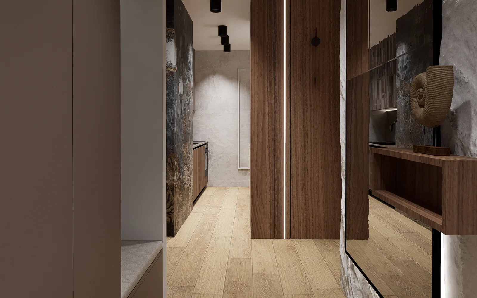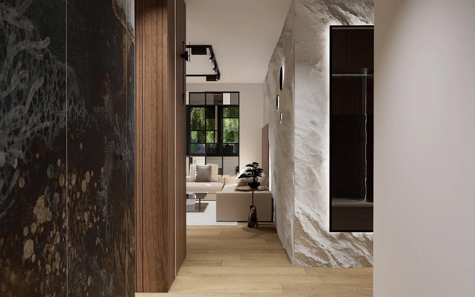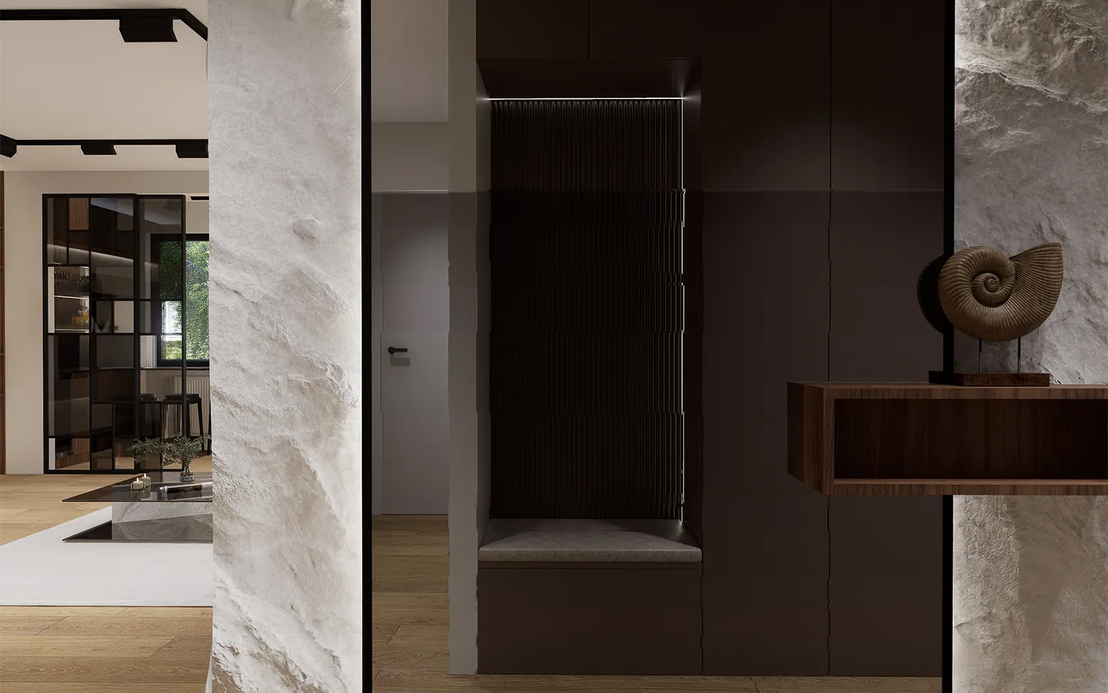 Prostor već na ulazu stvara snažan dojam. Garderobni ormar u toploj smeđoj boji i klupica za preobuvanje pružaju praktičnost, dok crno ogledalo s metalnim okvirom reflektira prostor i naglašava dubinu. Uz konzolu koja unosi eleganciju, zid obogaćuje dekoracija umjetne stijene – motiv koji se nastavlja prema dnevnom boravku.