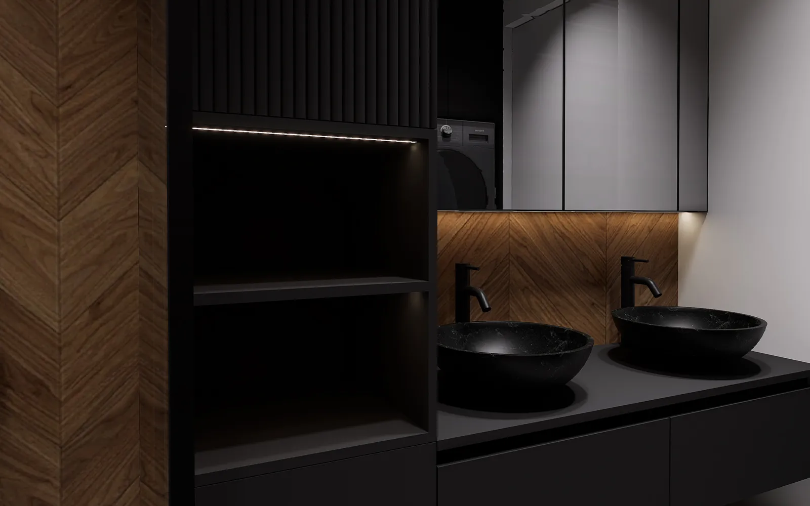 Za razliku od njega, kupaonica odiše snažnim kontrastima: crno-bijele pločice u obliku rombova kombinirane s drvenim pločicama u chevron uzorku stvaraju atraktivan vizualni ritam. Namještaj u antracit sivom tonu i umivaonici u efektu crnog mramora podižu dojam luksuza.
