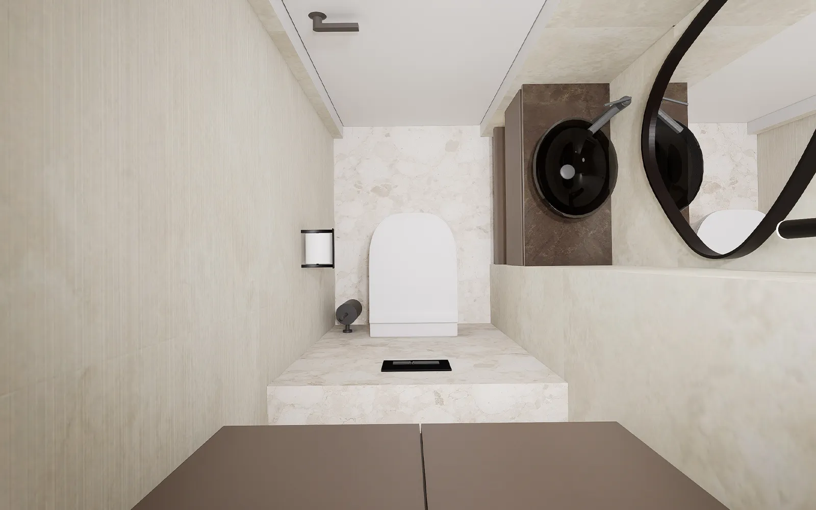 WC je svijetao, prozračan i suvremen – terrazzo pločice i betonska imitacija oplemenjene su detaljima u smeđoj boji. Stakleni umivaonik i nepravilno ogledalo naglašavaju modernost.