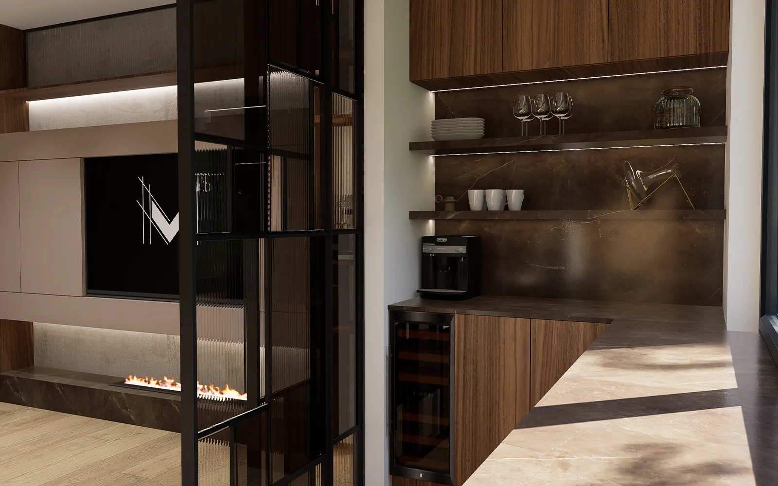 Kuhinja je oblikovana u imitaciji tamnog drva, s radnim plohama od porculana u efektu mramora. Rebraste fronte gornjih elemenata u smeđoj boji daju dinamiku, dok poluotok u istim materijalima dodatno naglašava snagu dizajna. Produžetak poluotoka čini staklena vitrina od poda do stropa, s integriranom LED rasvjetom, dok u nastavku prostor krasi stol za četvero – spoj drva, reljefnog stakla i bakra. Upravo se bakar, kao detalj, provlači kroz cijeli prostor, od vitrine do panela u dnevnom boravku.