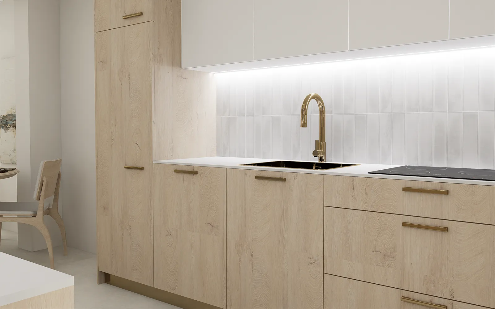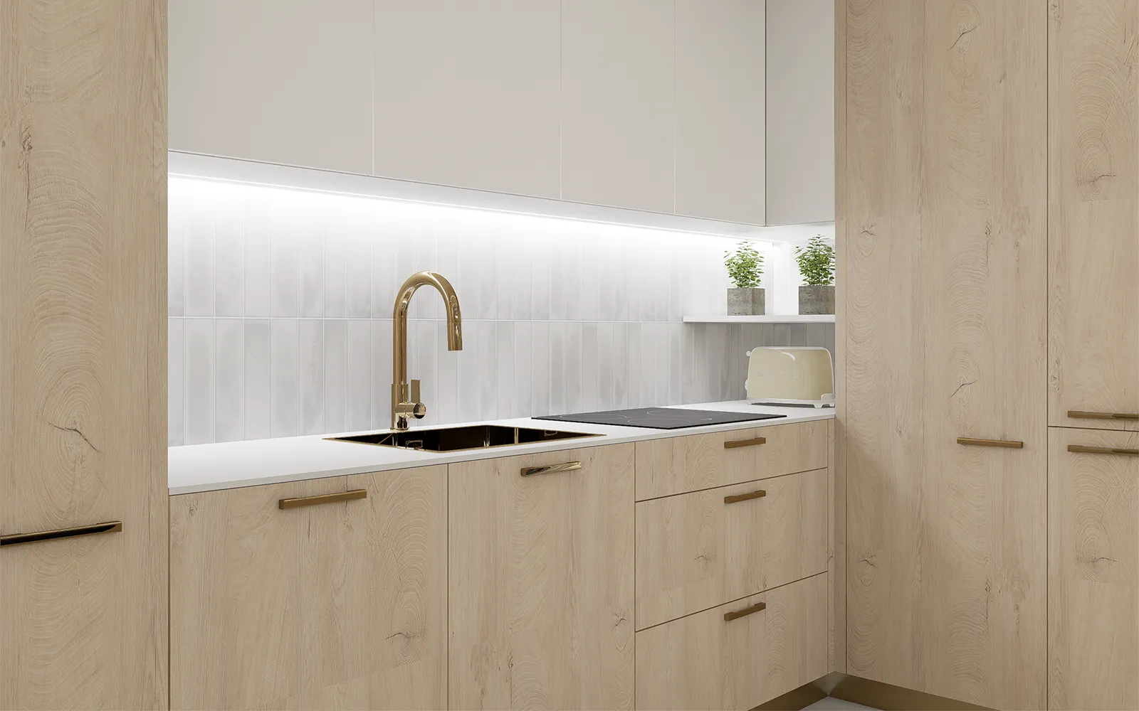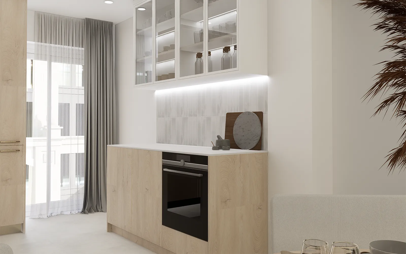 Kuhinja od poda do stropa, izrađena u toplom drvenom furniru s bijelom kvarcnom radnom plohom, unosi eleganciju i praktičnost u ovaj dizajn interijera. Integrirana LED rasvjeta diskretno je ugrađena u spušteni strop, pružajući ambijentalno svjetlo koje dodatno naglašava čistoću linija i minimalizam prostora.