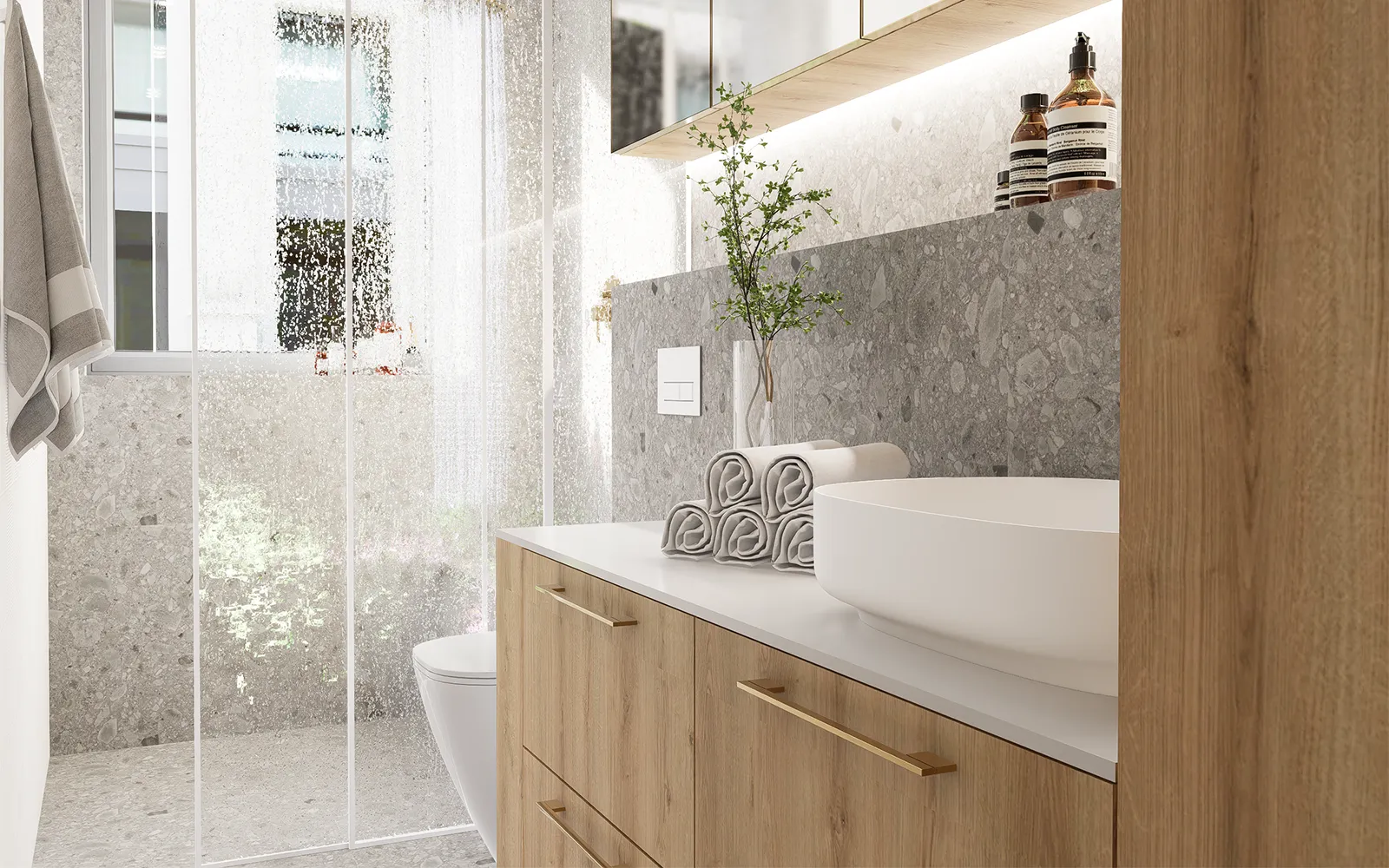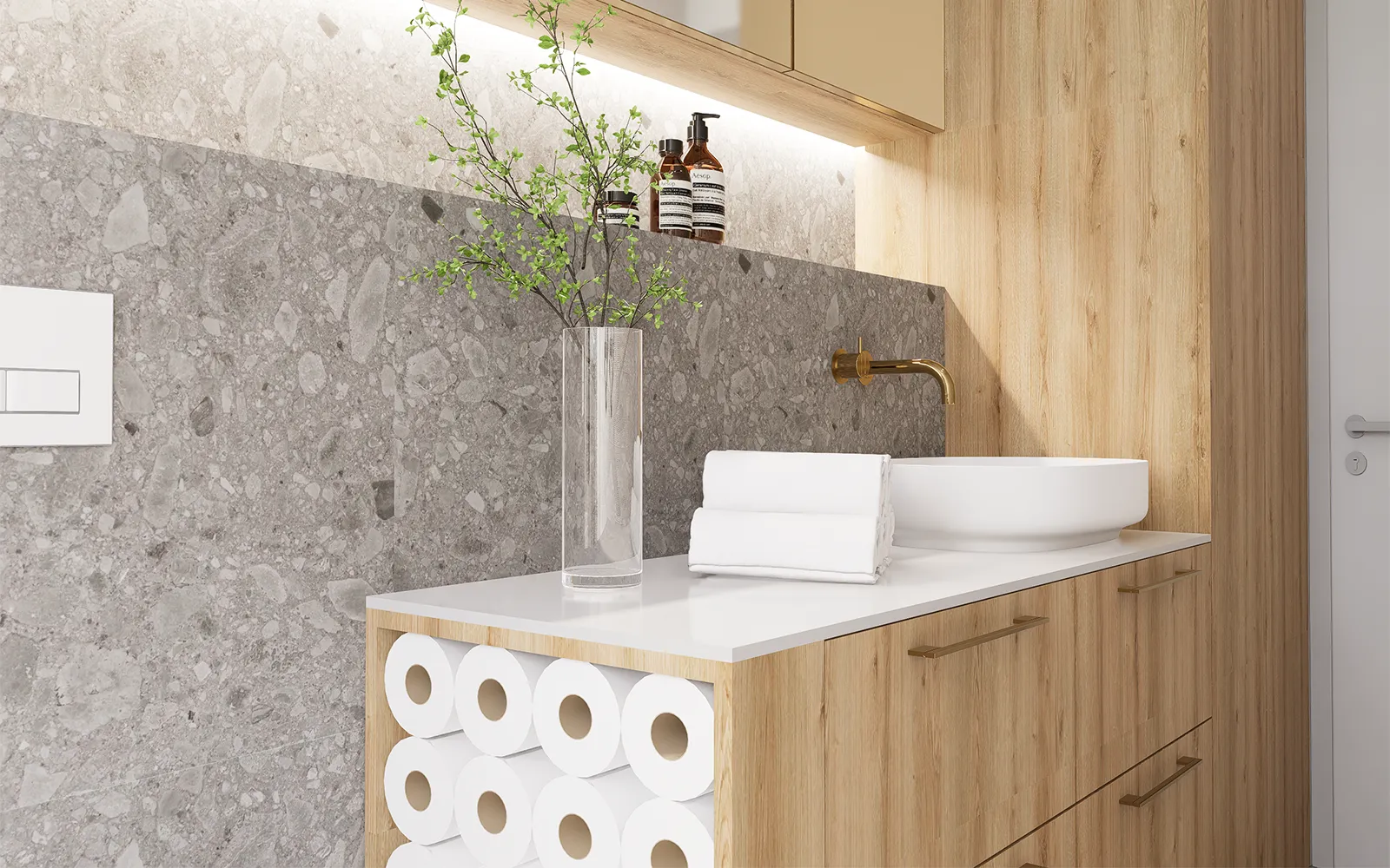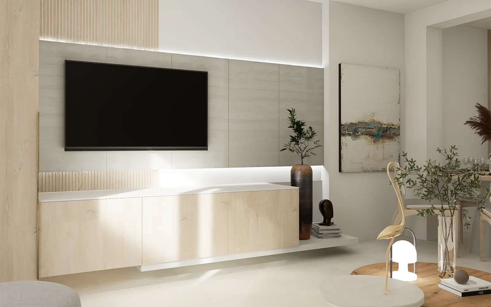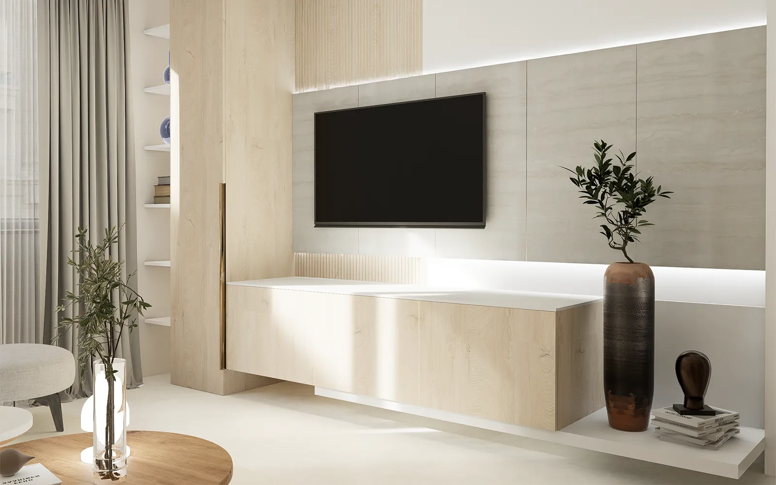 Kuhinja od poda do stropa, izrađena u toplom drvenom furniru s bijelom kvarcnom radnom plohom, unosi eleganciju i praktičnost u ovaj dizajn interijera. Integrirana LED rasvjeta diskretno je ugrađena u spušteni strop, pružajući ambijentalno svjetlo koje dodatno naglašava čistoću linija i minimalizam prostora.