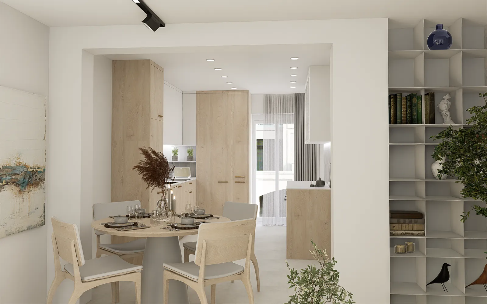 U ovom projektu skandinavski stil dizajna interijera karakterizira otvoreni koncept koji spaja kuhinju, dnevni boravak i blagovaonicu. Tako se stvara fluidan i prostran prostor, idealan za život i druženje.