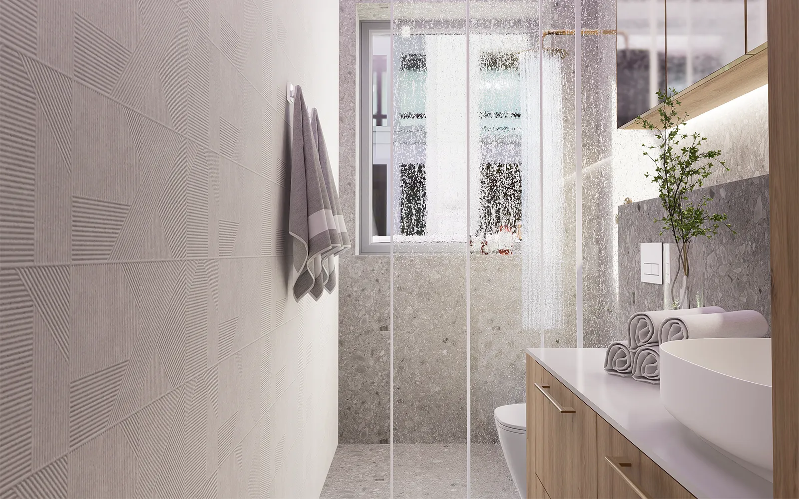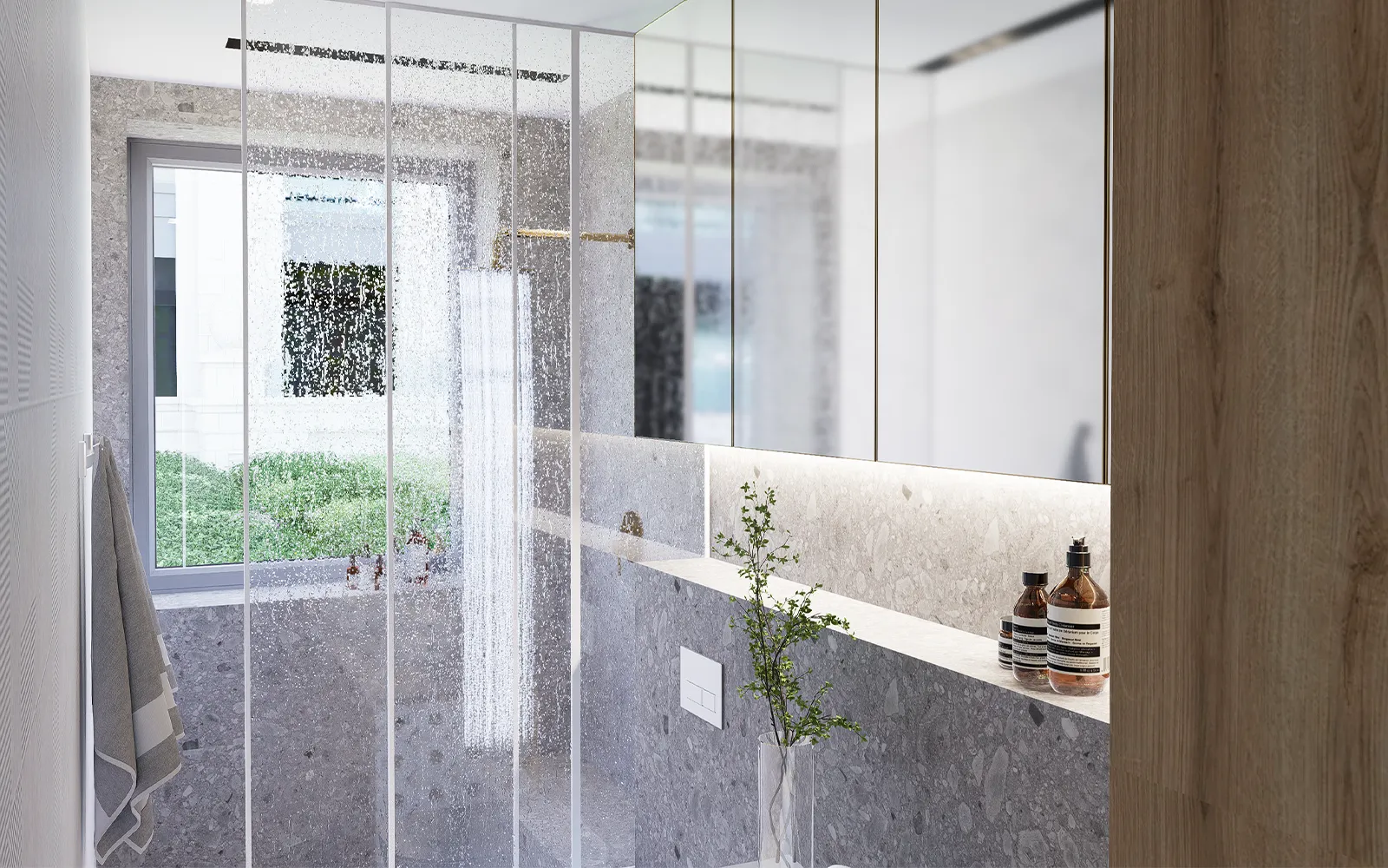 Podovi u cijelom stanu prekriveni su keramikom velikog formata, koja doprinosi vizualnoj koheziji prostora, dok je istovremeno praktična za održavanje. Kombinacija svijetlih tonova i prirodnih tekstura stvara osjećaj kontinuiranosti, čineći ovaj dizajn interijera jedinstvenim.