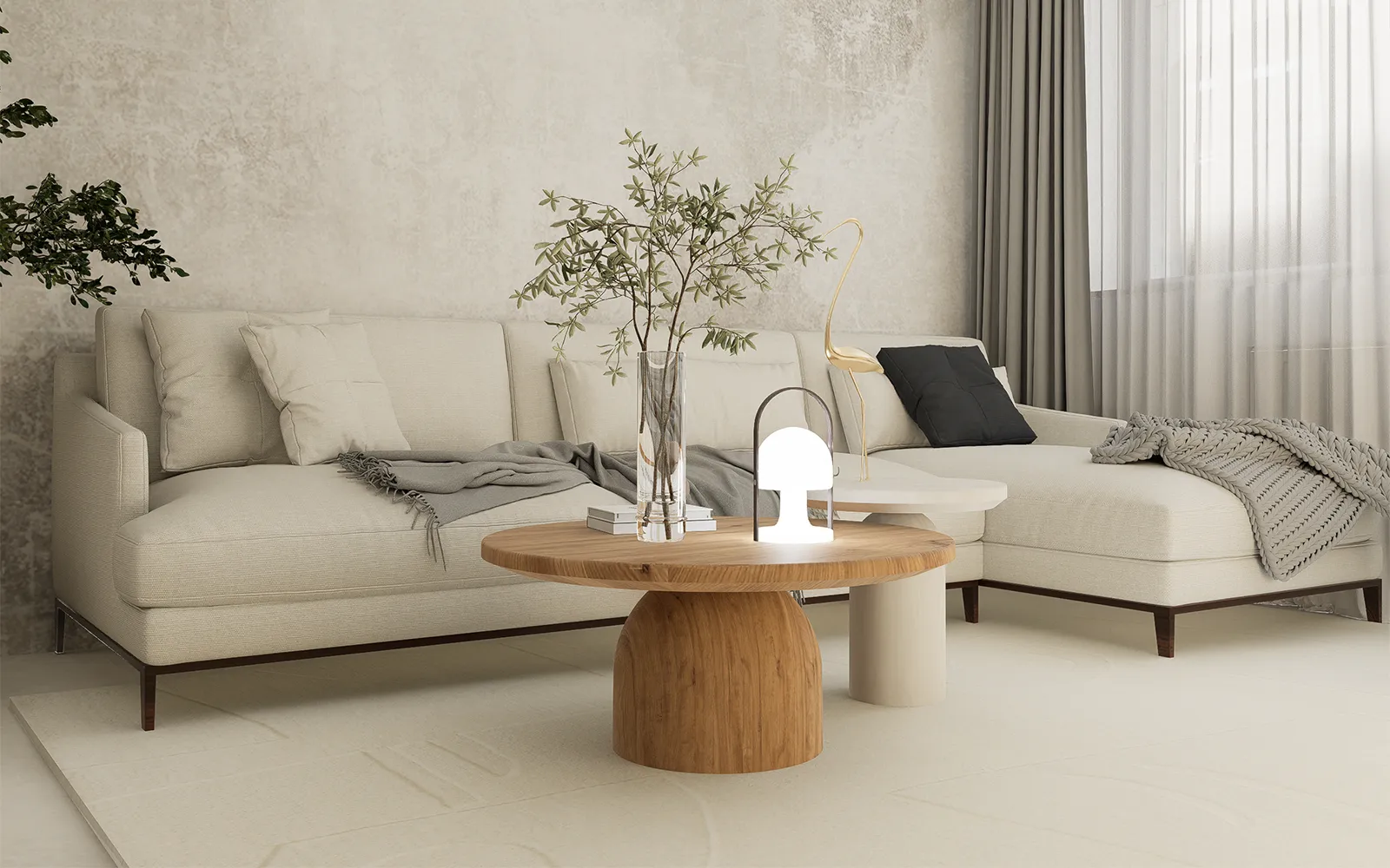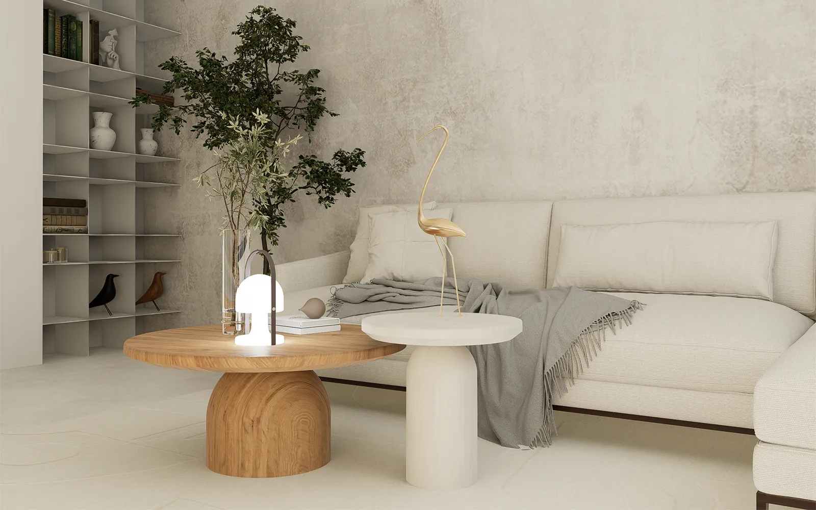 Dnevni boravak opremljen je udobnim bež kaučem na razvlačenje, koji nudi fleksibilnost i dodatni prostor za spavanje. Akcentna tapeta iza kauča tonovima prati ostatak interijera, dodajući dubinu i karakter prostoru. Drveni stolići različitih dimenzija i završnih obrada savršeno se uklapaju u ovaj dizajn interijera, pružajući dodatnu funkcionalnost uz estetski dojam.