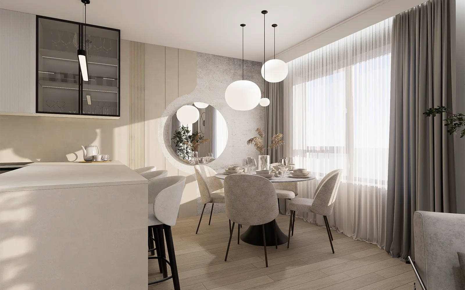 Obloga se nastavlja i u blagovaonicu, formirajući polukružnu zonu s dekorativnim okruglim ogledalom, koje je usklađeno s okruglim blagovaonskim stolom i visećim rasvjetnim tijelima iznad njega.