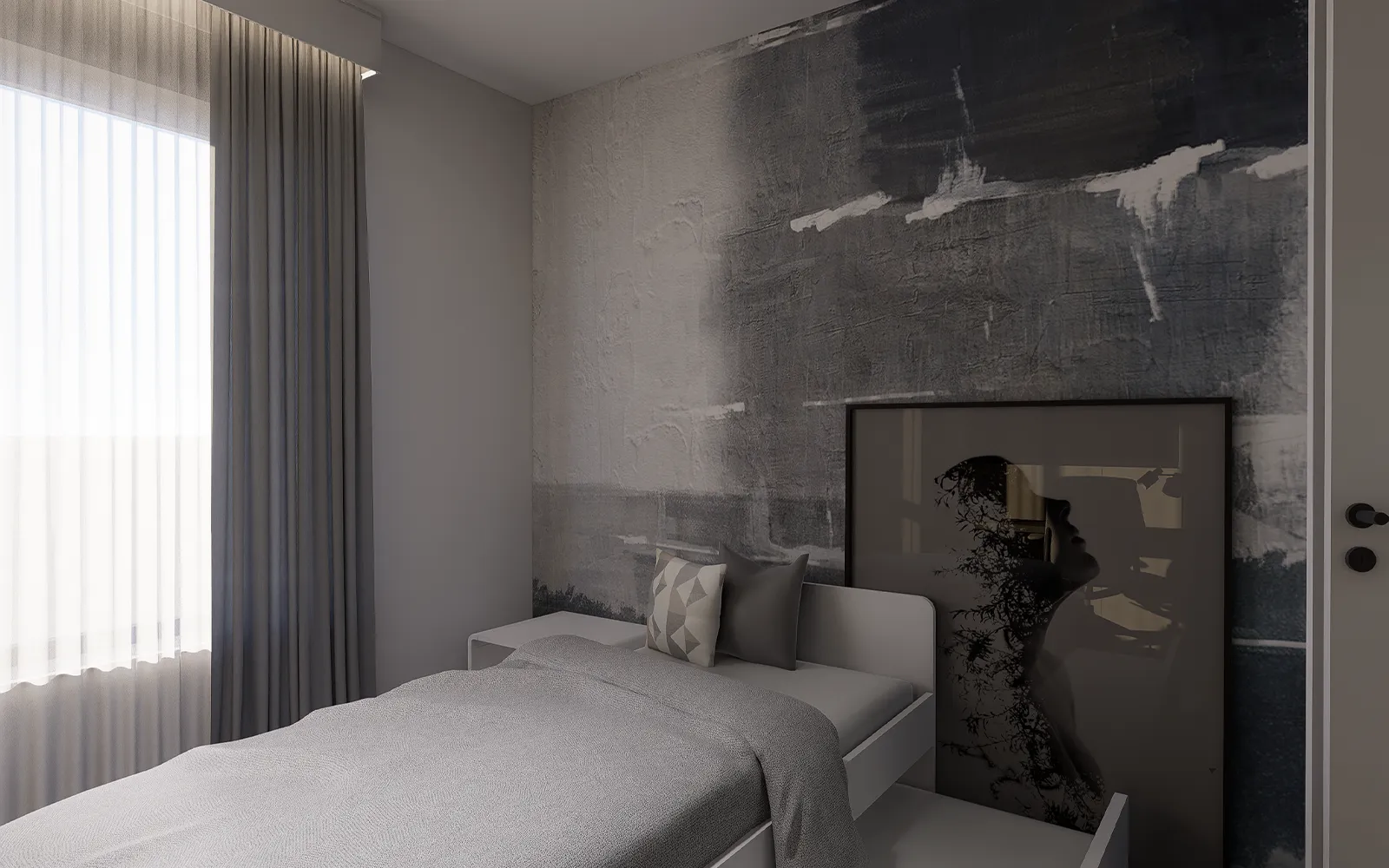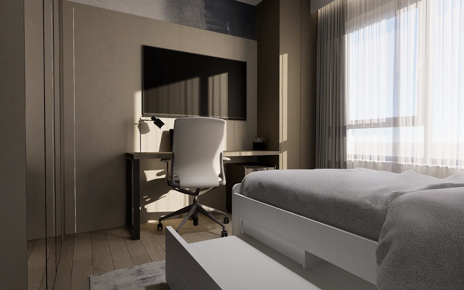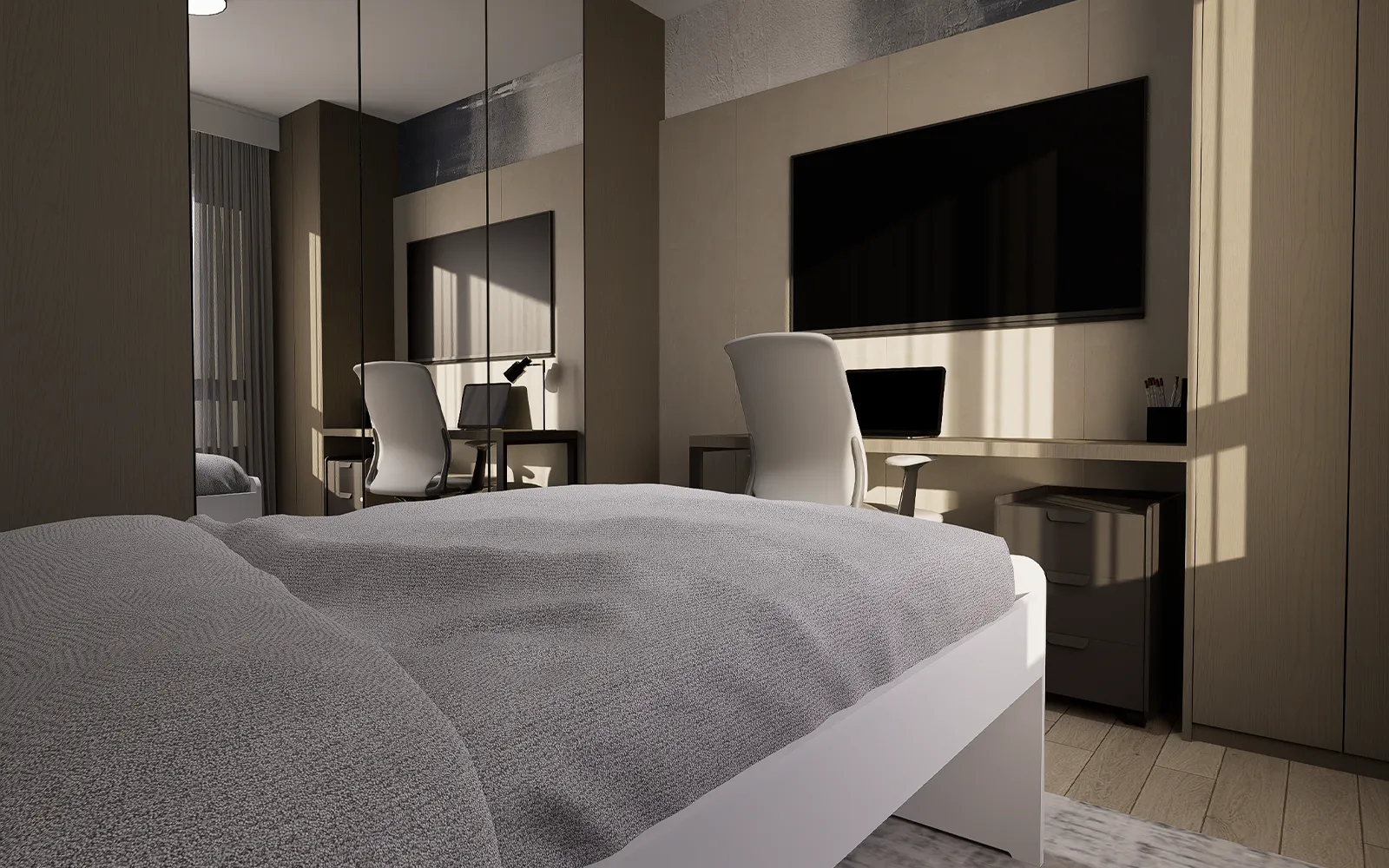 Dizajnirana za jednu osobu, ova soba u stanu Blato uključuje krevet s dodatnim ležajem, savršen za goste ili fleksibilno korištenje. Zid iza kreveta krasi tapeta u sivo-plavim tonovima, dok su ormari i zidne obloge u toploj drvenoj teksturi. Dio fronti izrađen je s ogledalima koja reflektiraju svjetlost i daju prostoru osjećaj prozračnosti.