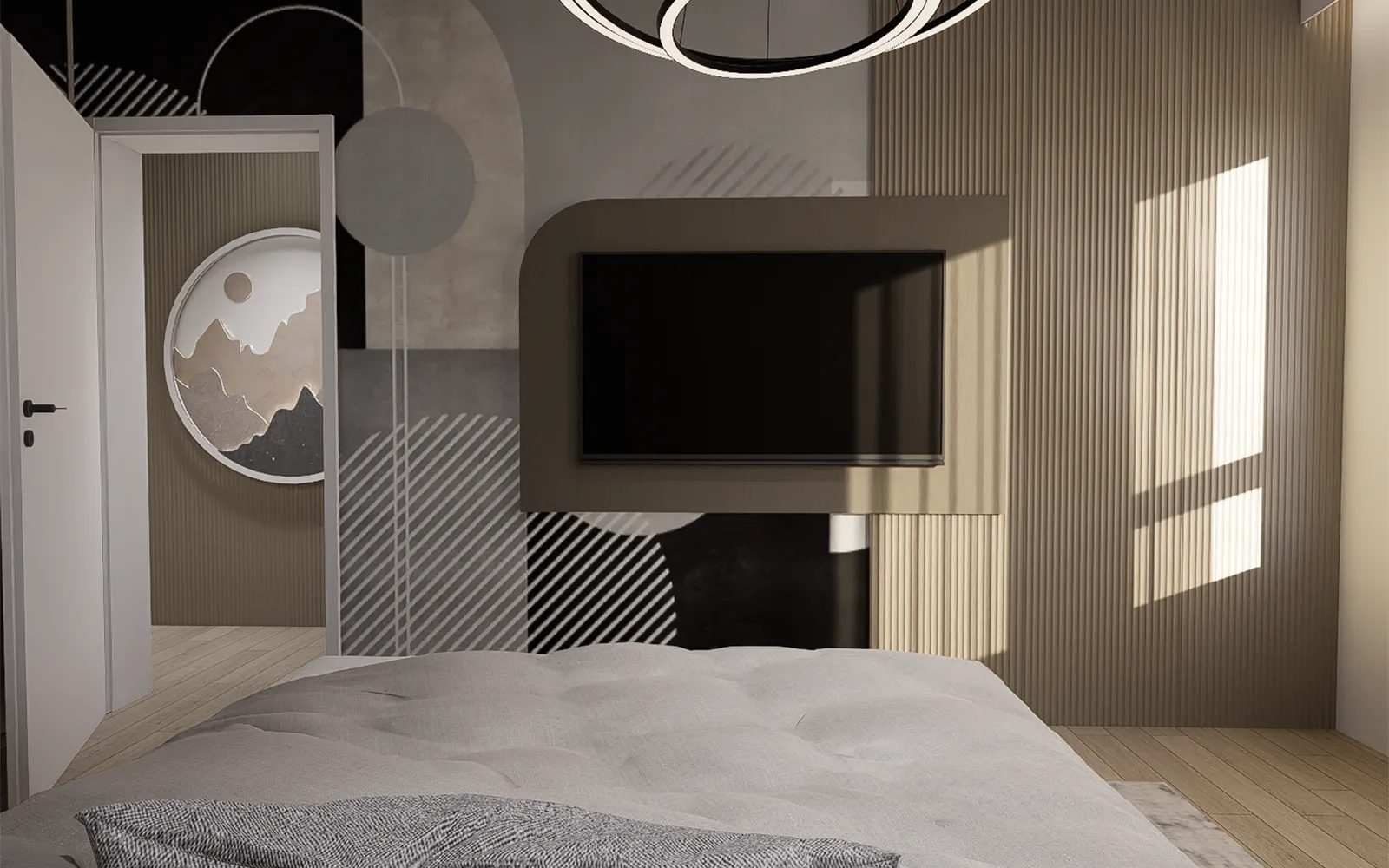Nasuprot krevetu, zid je dizajnerski osmišljen s reljefnim panelima, polukružnim elementom iza TV-a i tapetom s geometrijskim kružnim uzorcima, stvarajući balans između dekorativnog i funkcionalnog.