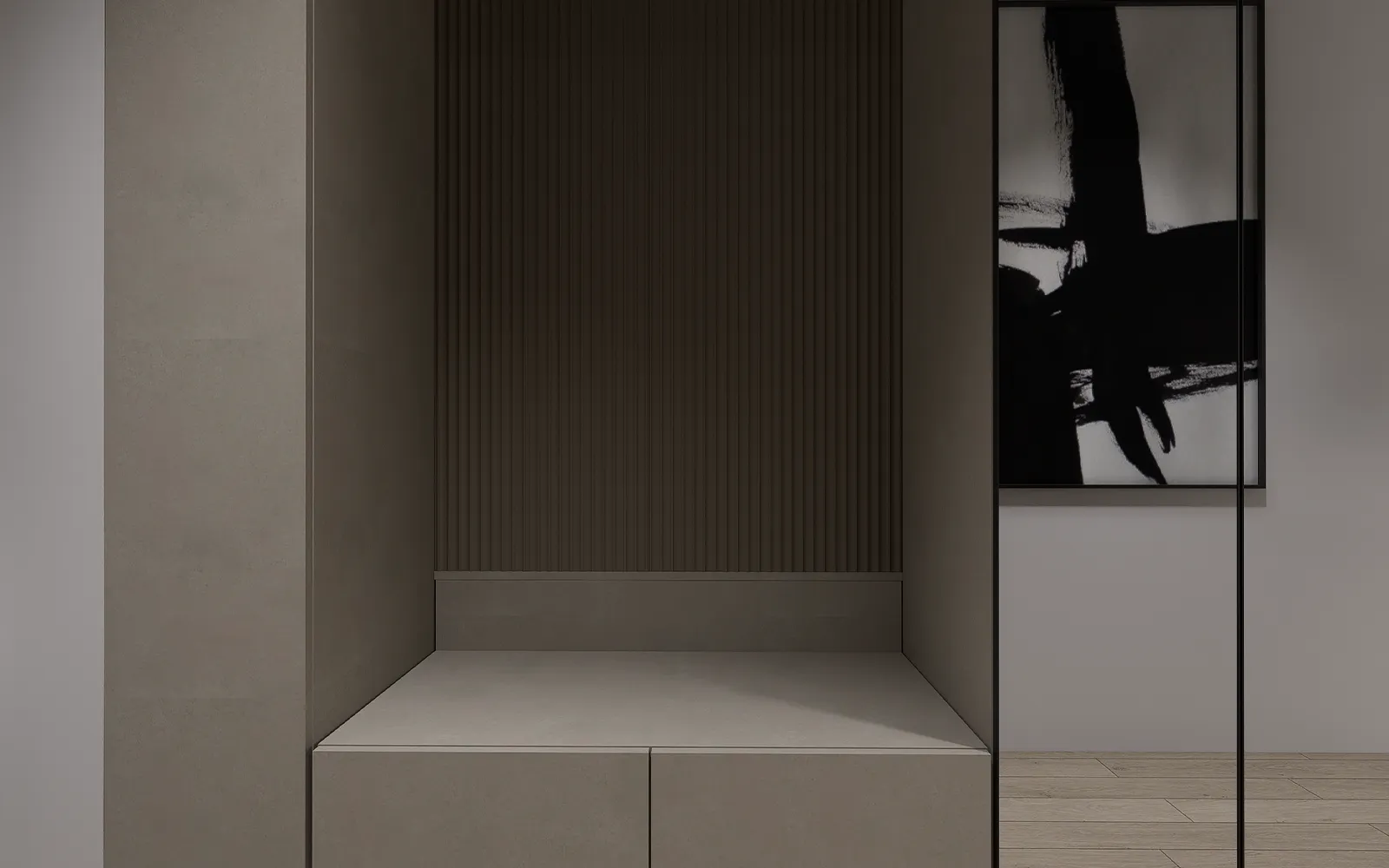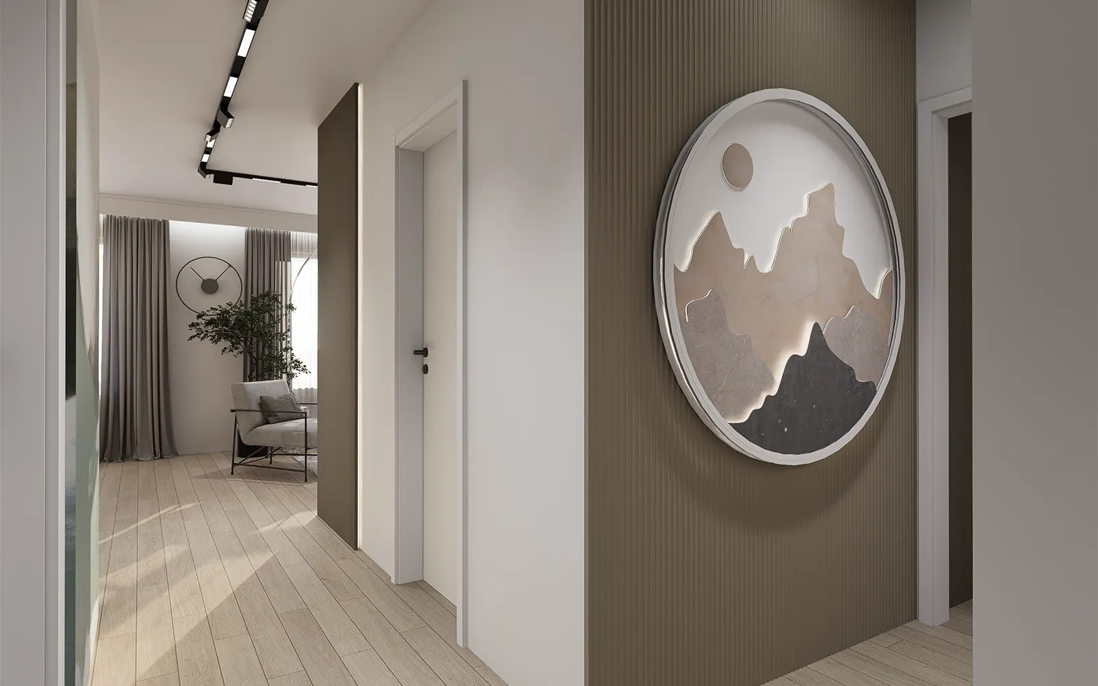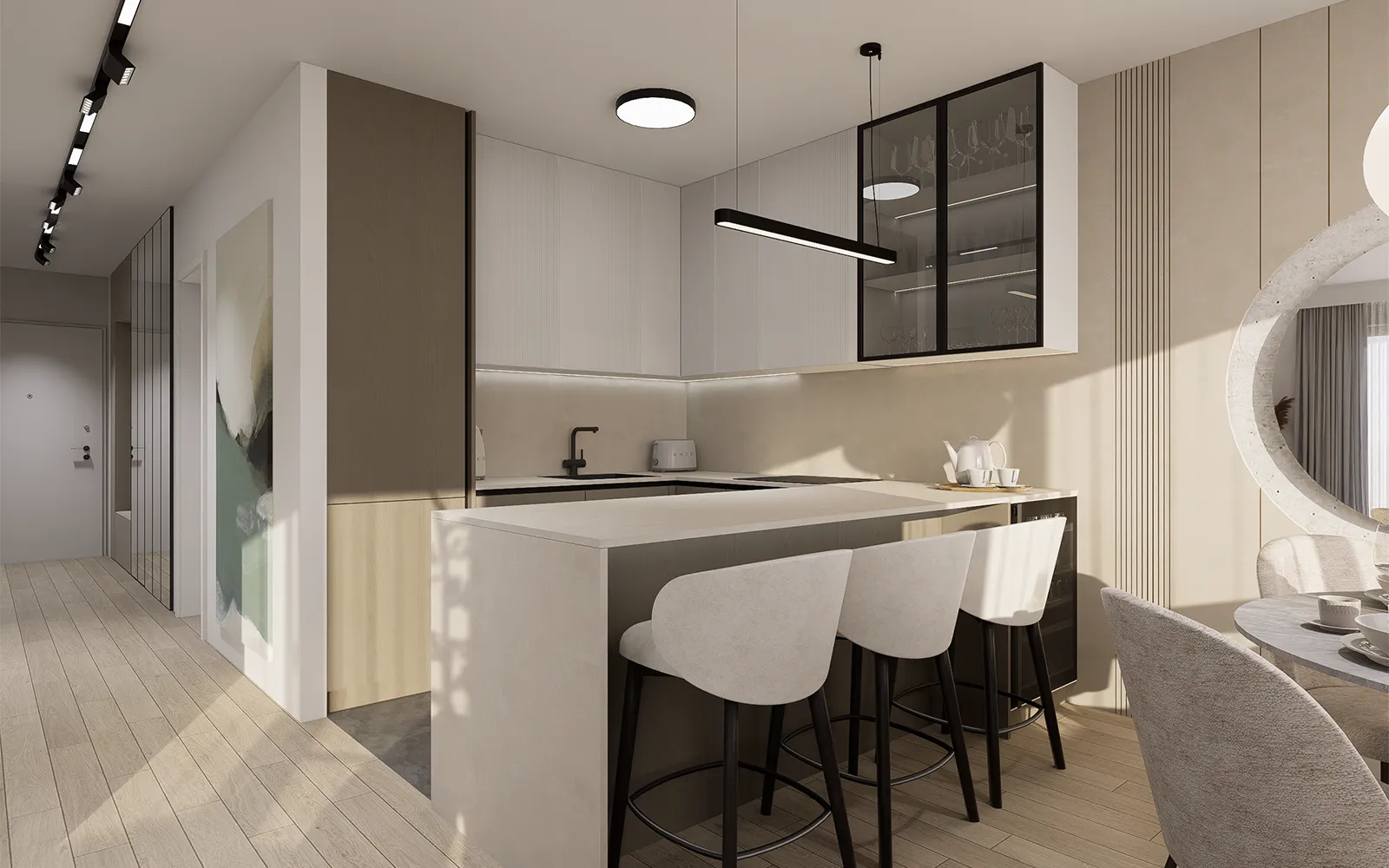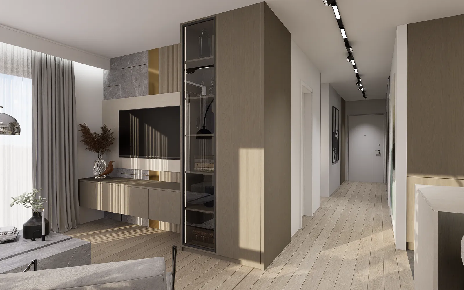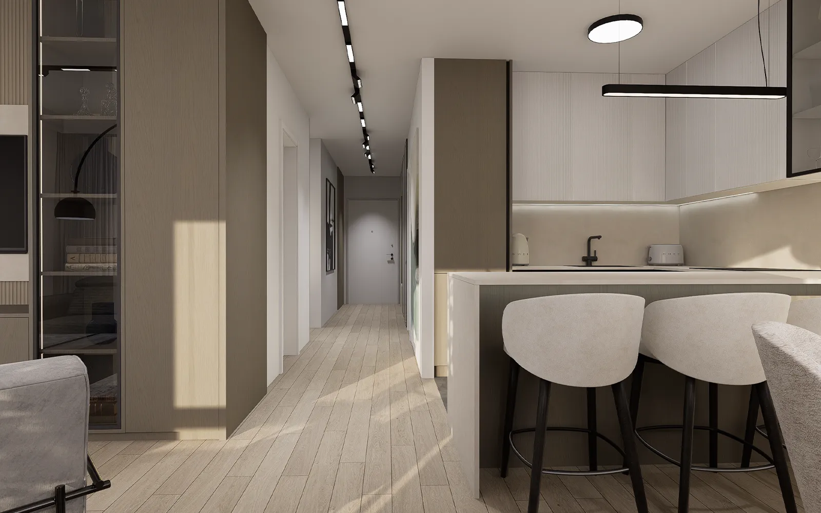 Po ulasku u stan, dočekuje vas dugi hodnik s čiste linije i pametno integriranim funkcionalnim rješenjima. S lijeve strane, uvučena niša s garderobnim ormarom i klupicom za sjedenje nudi idealno mjesto za svakodnevnu organizaciju, dok crna magnetna rasvjeta duž stropa stvara profinjen kontrast s toplim kašmir i bež tonovima koji prevladavaju u stanu.