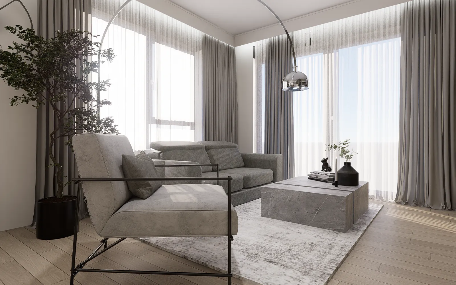Udobna siva kutna garnitura i fotelja, dvoredne zavjese u bijeloj i sivoj tkanini, te velika podna lampa U-oblik zaokružuju atmosferu elegantne opuštenosti.