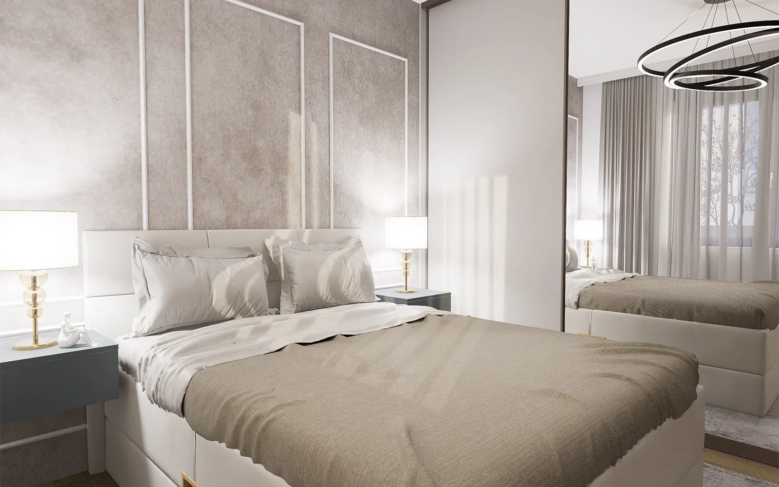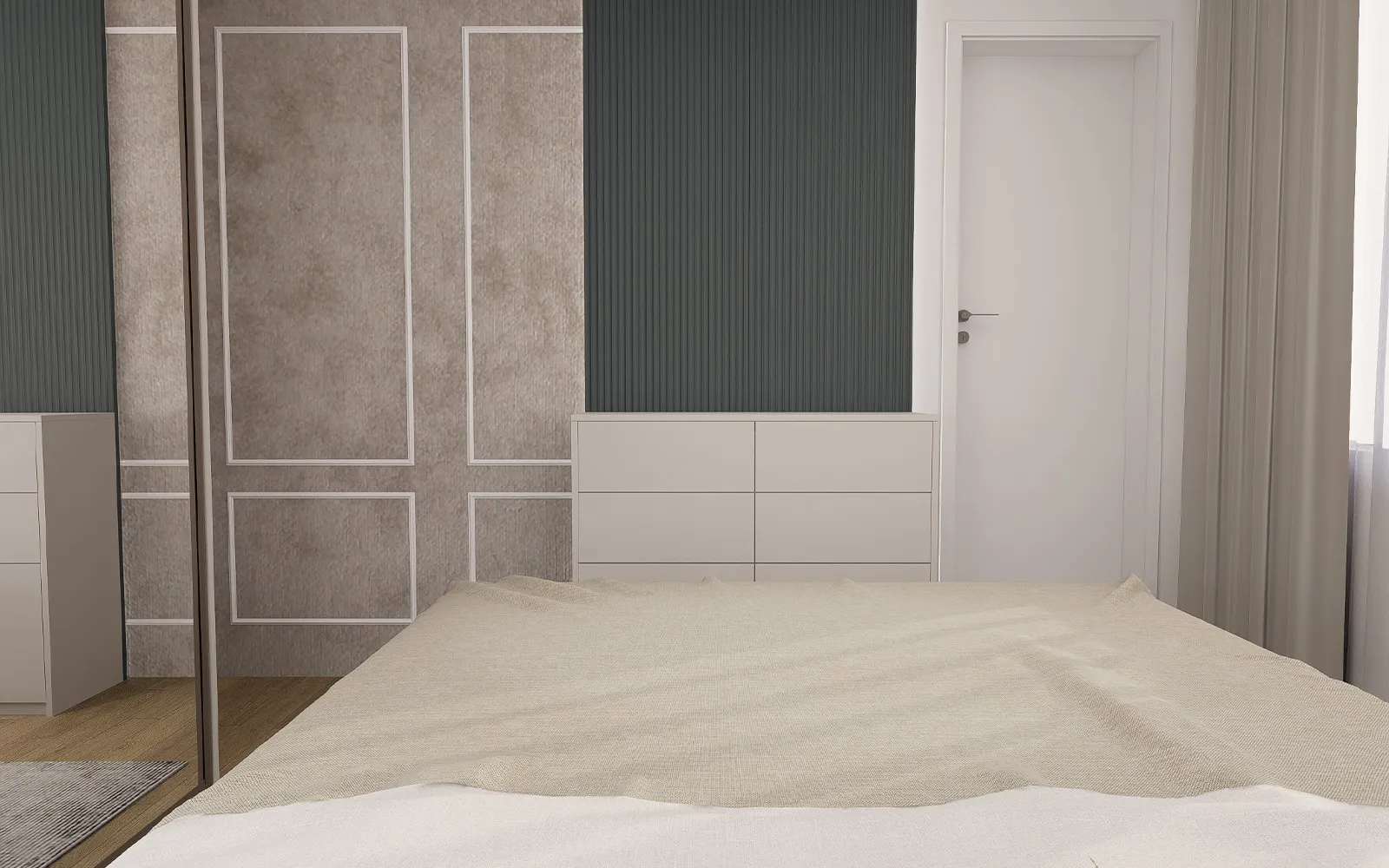 Master spavaća soba osmišljena je kao utočište. Zid iza kreveta definiran je tapetom u toplim tonovima i štukaturama, dok prostor naglašavaju tirkizni noćni ormarići i rebrasti panel preko puta kreveta. Veliki ormar i komoda daju praktičnost, a privatna kupaonica u travertinu s kadom zaokružuje luksuz master suitea.