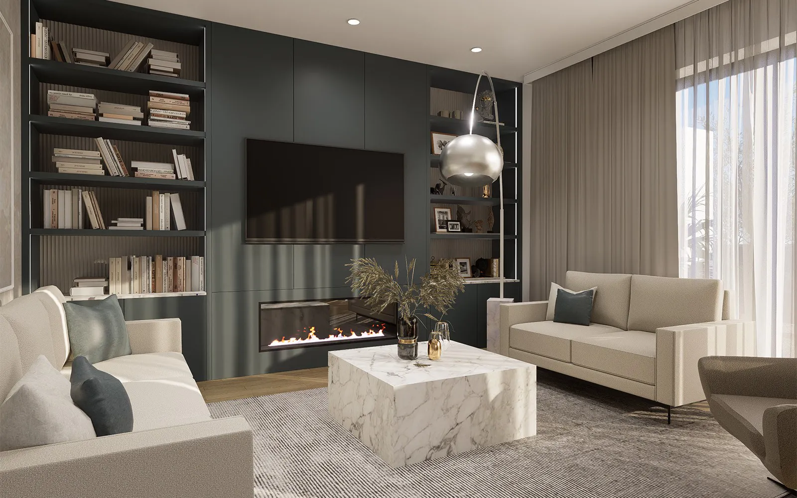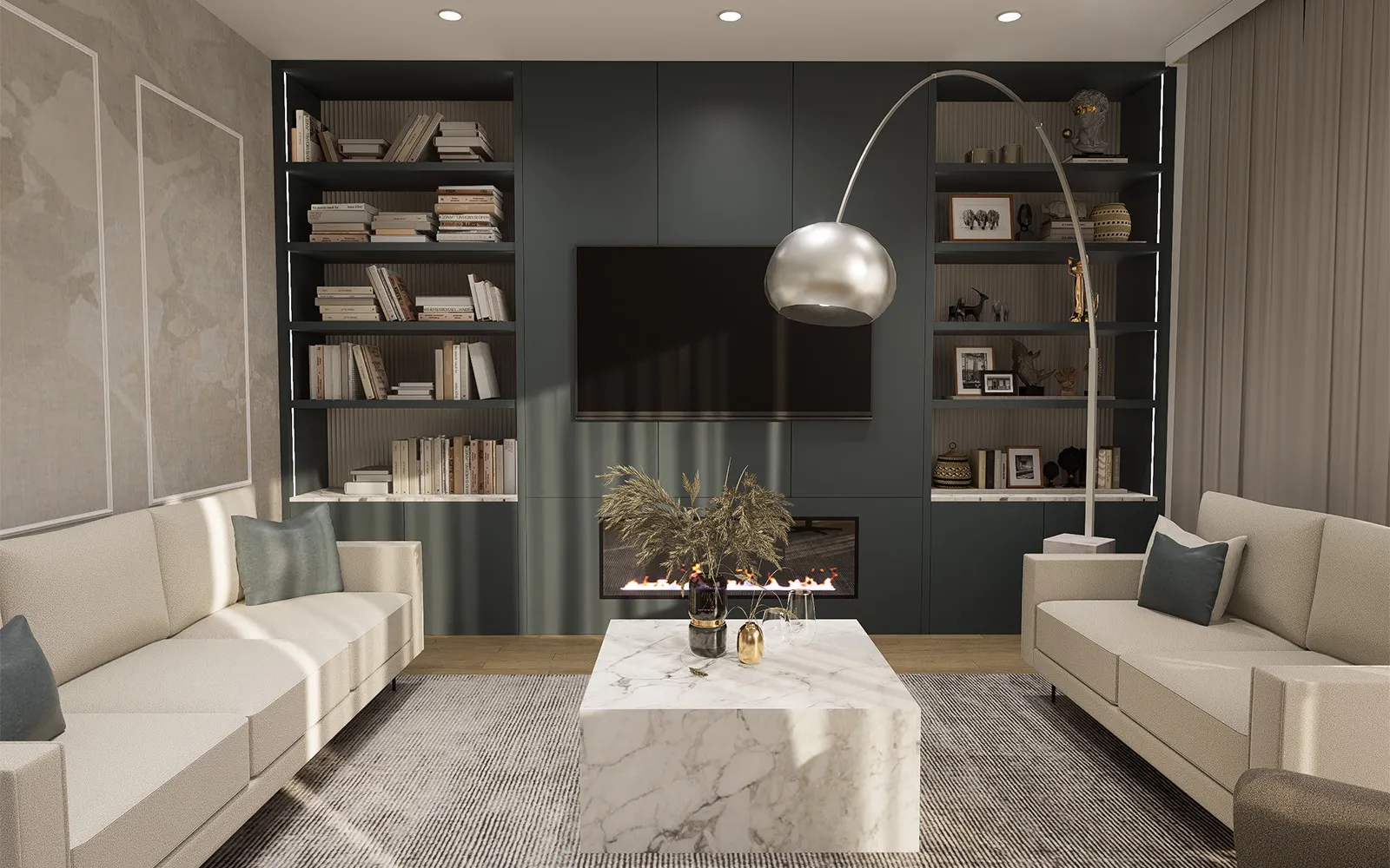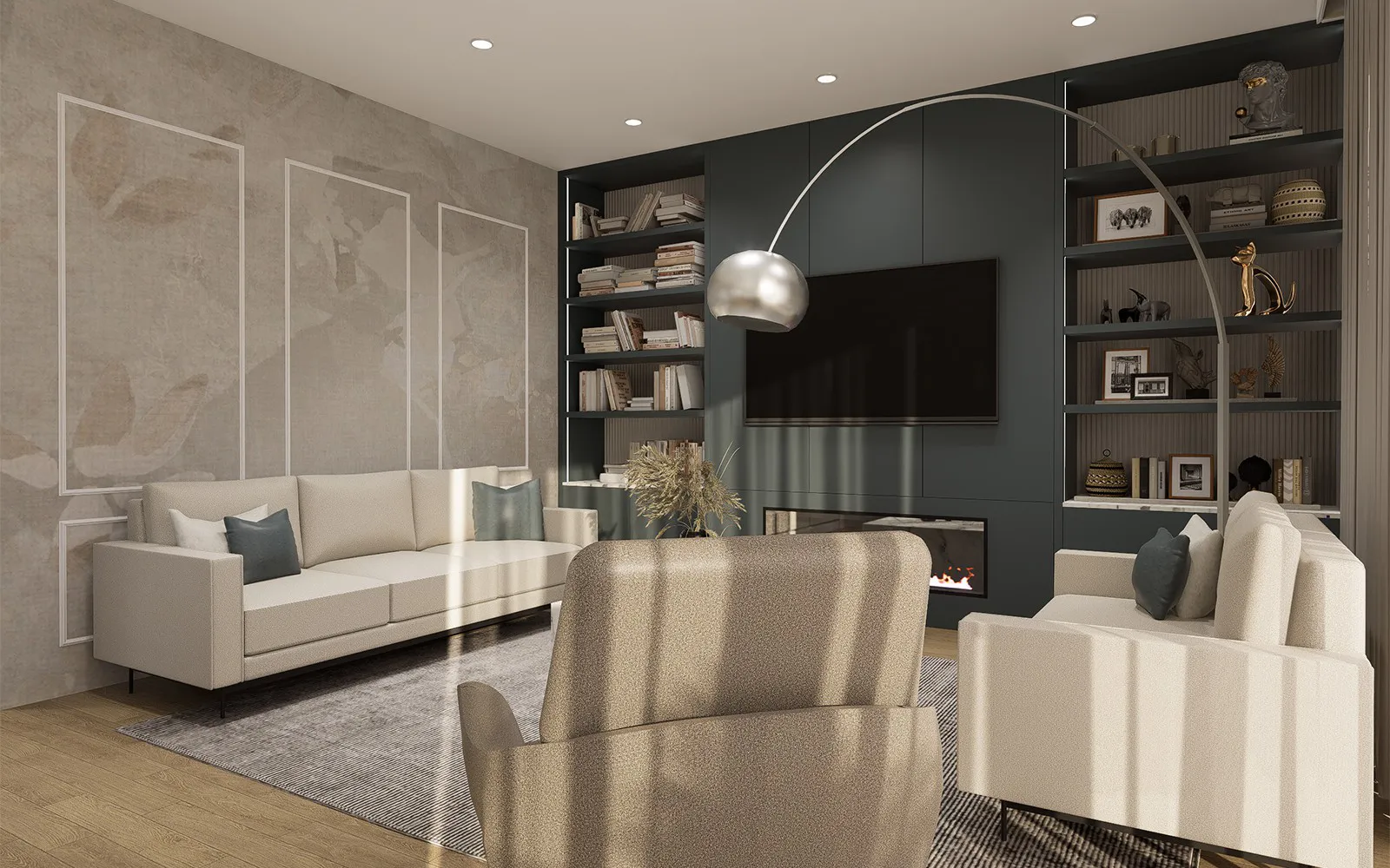Boravak je zamišljen kao prostor opuštanja i zajedništva. Dvosjed i trosjed u bež tonovima, uparen s tamnijom foteljom, oblikuju intimnu atmosferu za razgovor i druženje. Posebnu prostornu dinamiku daje impozantna biblioteka s integriranom komodom u tirkiznom materijalu, koja u sebi objedinjuje TV, električni kamin i police naglašene LED rasvjetom. Zid iza trosjeda krase pastelne tapete s dekorativnim štukaturama, dok velika staklena stijena sa zavjesama od poda do stropa propušta obilje prirodnog svjetla i stvara luksuznu kulisu.