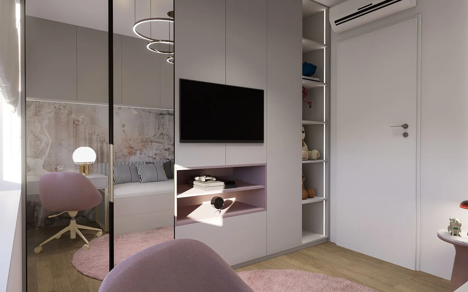 Soba za djevojčicu odiše nježnošću. Kašmir i ružičasti tonovi, tapecirani krevet s mostom i integriranom LED rasvjetom te radni stol oblikuju prostor prilagođen djetinjstvu i budućem školskom dobu. Zid s motivom balerine dodaje poetičnu notu. Ormar je koncipiran kao kombinacija ogledalnih fronti, otvorenih polica i prostora za TV.