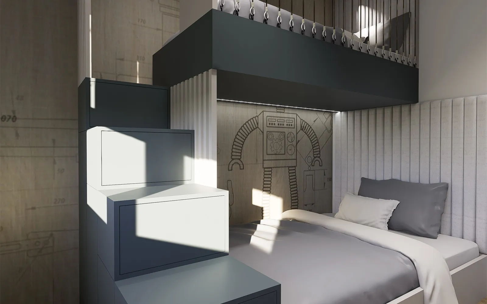 Soba za dva dječaka donosi potpuno drugačiju energiju – bež i tamno plavi tonovi, kreveti na kat s kubus stepenicama koje služe i kao ormari te zid s tapetom robota i tehničkih nacrta. Prostor je dizajniran da bude i funkcionalan i razigran.