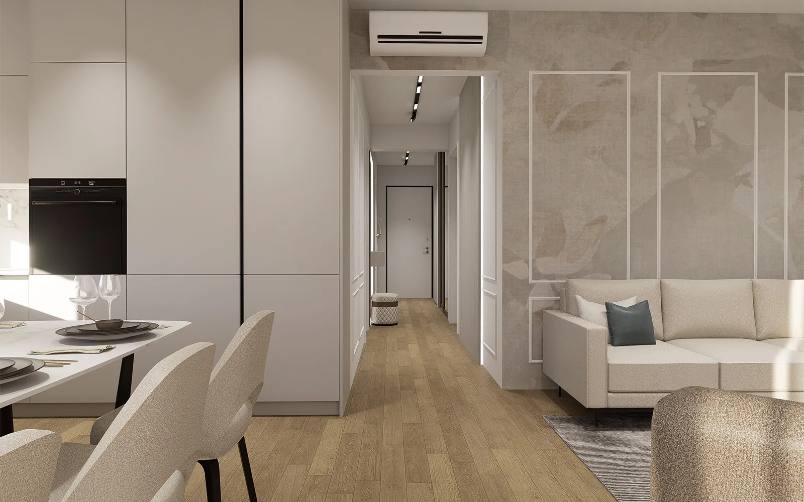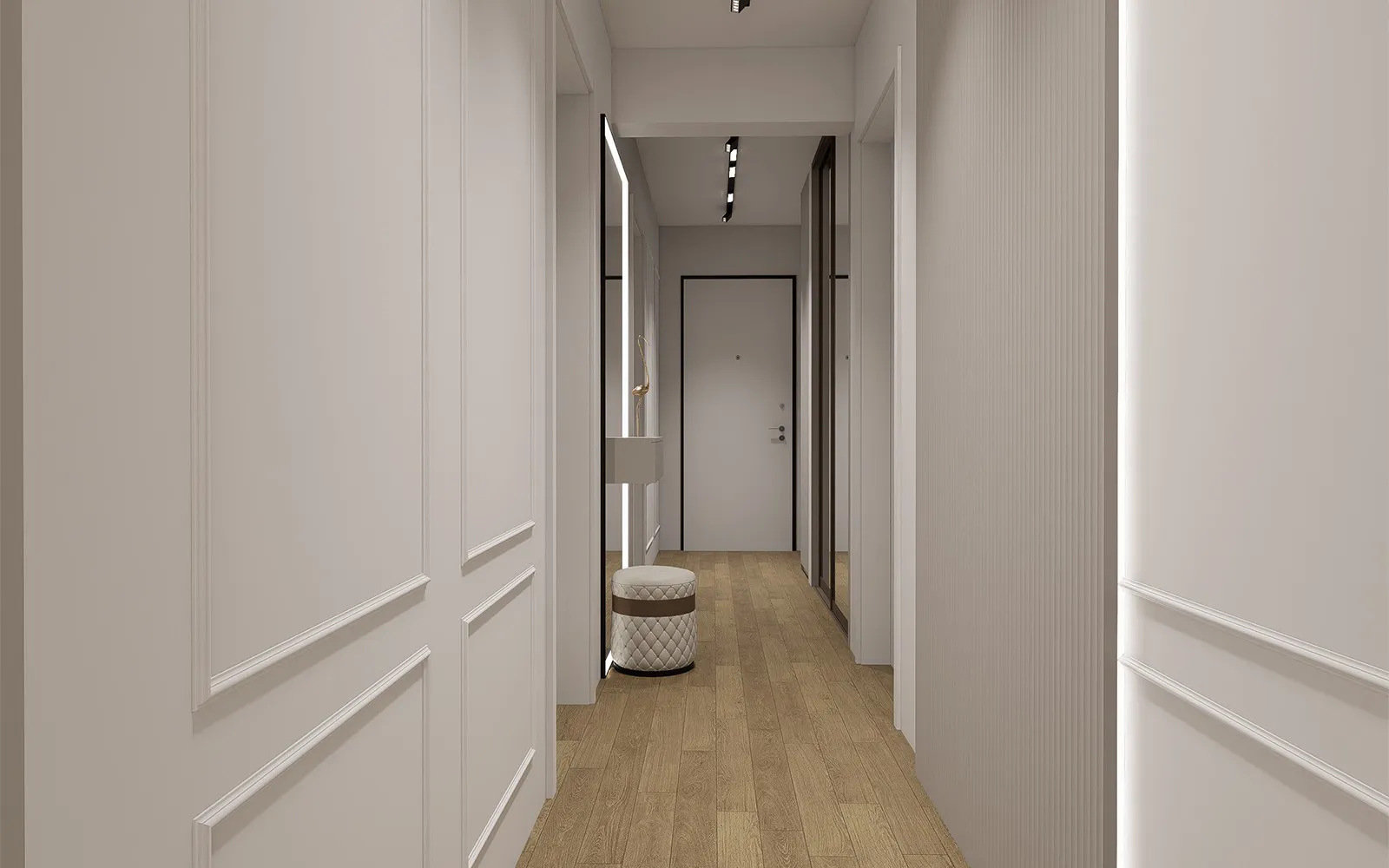 Ulaskom u stan, posjetitelja dočekuje dugi reprezentativni hodnik – zamišljen gotovo kao scenografski okvir. Bijeli zidovi naglašeni su štukaturama i zidnim panelima iza kojih se krije ambijentalna LED rasvjeta, stvarajući igru svjetla i sjene. Ogledalne fronte garderobnog ormara i veliko zidno ogledalo dodatno reflektiraju prostor, dajući mu veću dubinu i prozračnost. Duž cijelog hodnika proteže se magnetna šinska rasvjeta koja vodi pogled prema središnjem dijelu stana – otvorenom dnevnom prostoru.