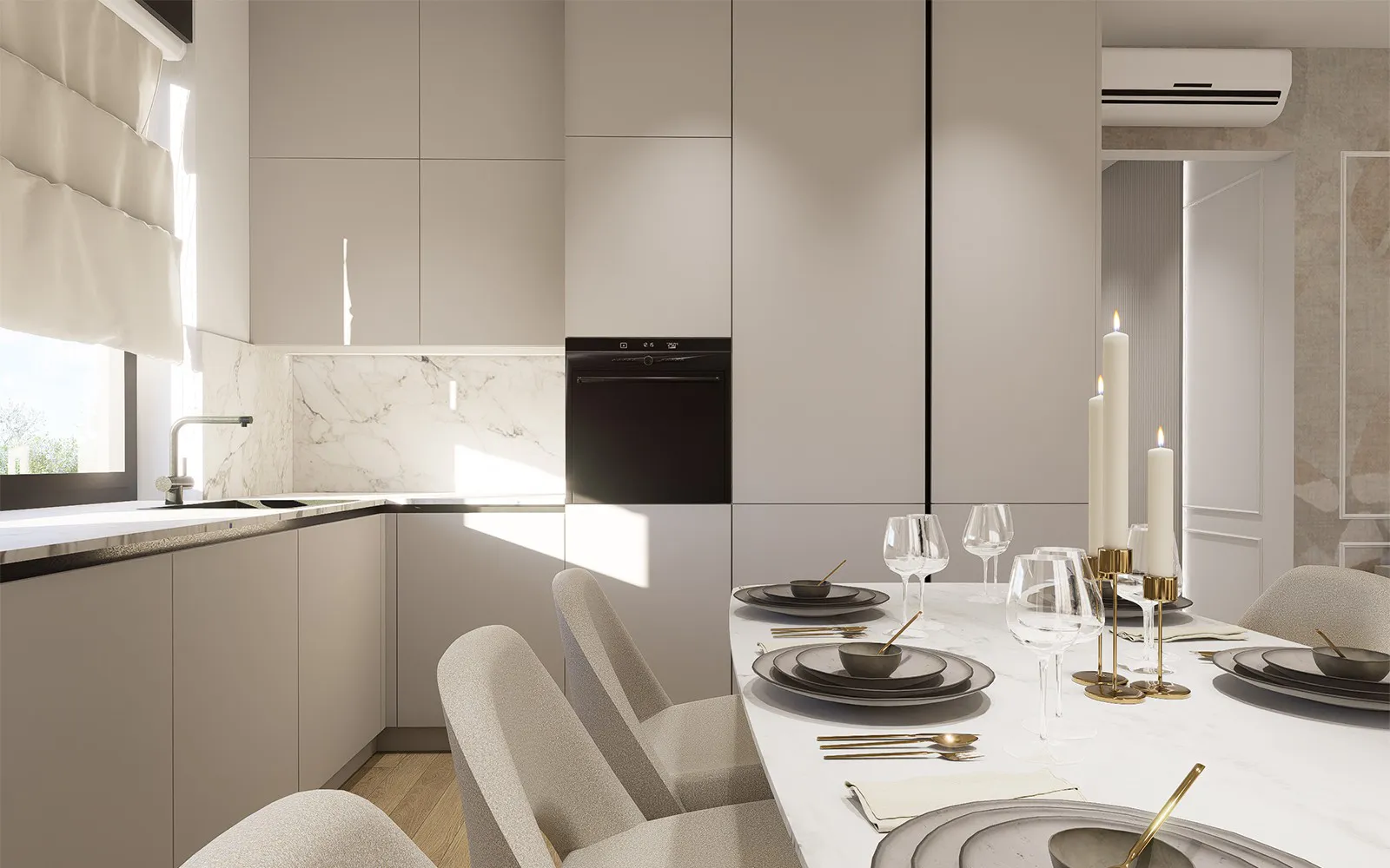 Kuhinja u kašmir tonovima djeluje profinjeno i smireno. Porculanska ploča u imitaciji bijelog mramora sa zlatno-smeđim žilama istovremeno unosi luksuz i kontinuitet, jer se pojavljuje i na backsplashu te blagovaonskom stolu.