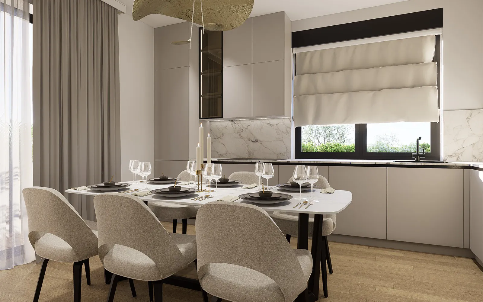Blagovaonica je zamišljena kao centralno okupljalište obitelji. Stol skulpturalnog, valovitog oblika naglašen je monumentalnom metalnom visilicom u bijelo-zlatnoj kombinaciji, dok stolice u bež tkanini i tamnim drvenim nogama donose toplinu.