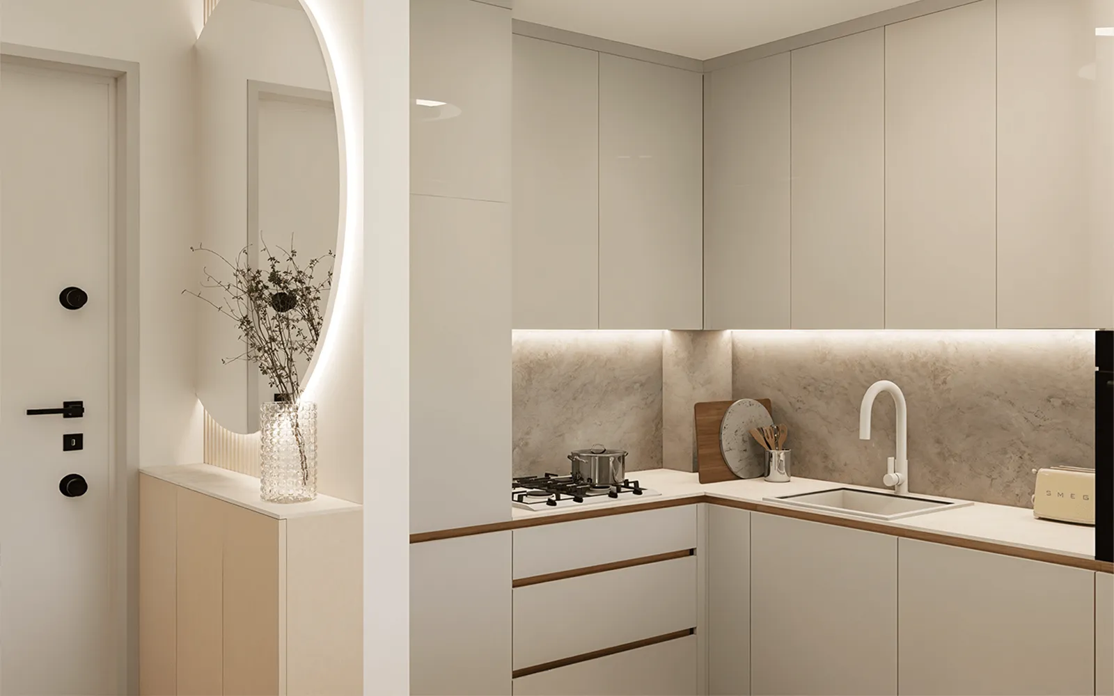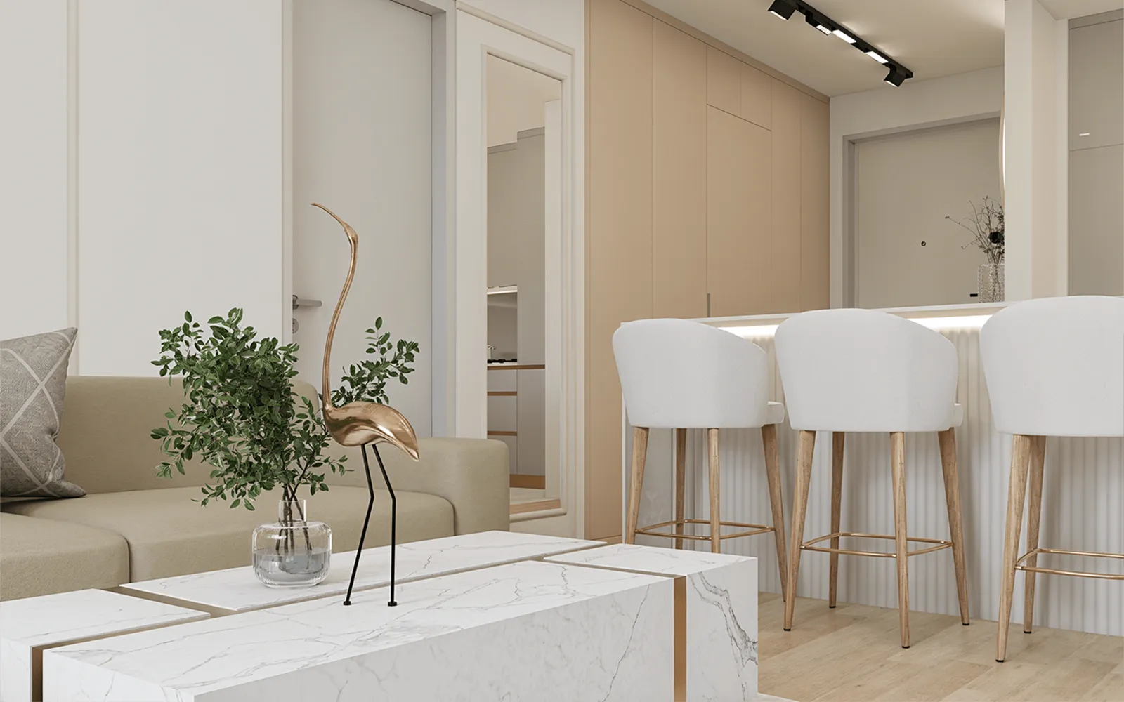 Stan u novogradnji, površine 55 m², oličenje je moderne estetike i minimalizma, gdje svijetli tonovi stvaraju ugodnu i prozračnu atmosferu, dok zlatni detalji unose dozu glamura i luksuza.