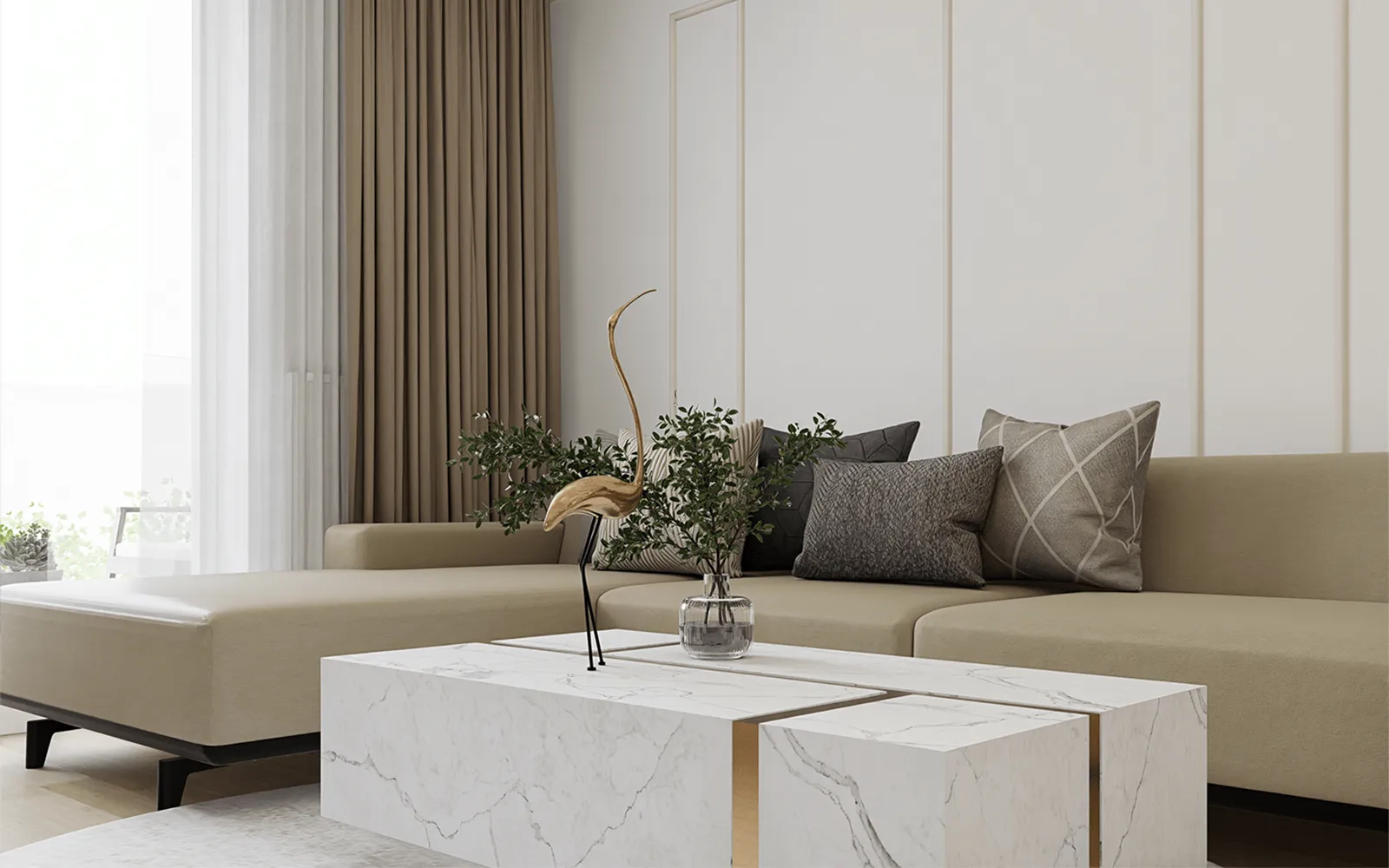 Slijedi iste tonove i dizajnerske smjernice kao kuhinja, stvarajući skladan prostor koji odiše jednostavnošću i elegancijom. Stolić u dnevnom boravku izrađen je od iste ploče kao i kuhinja, čime se postiže kontinuitet u dizajnu. Luksuzna kožna kutna garnitura doprinosi sofisticiranosti ovog interijera, dok zidne štukature, postavljene u zanimljivom i nesvakidašnjem rasteru, oplemenjuju zidove.