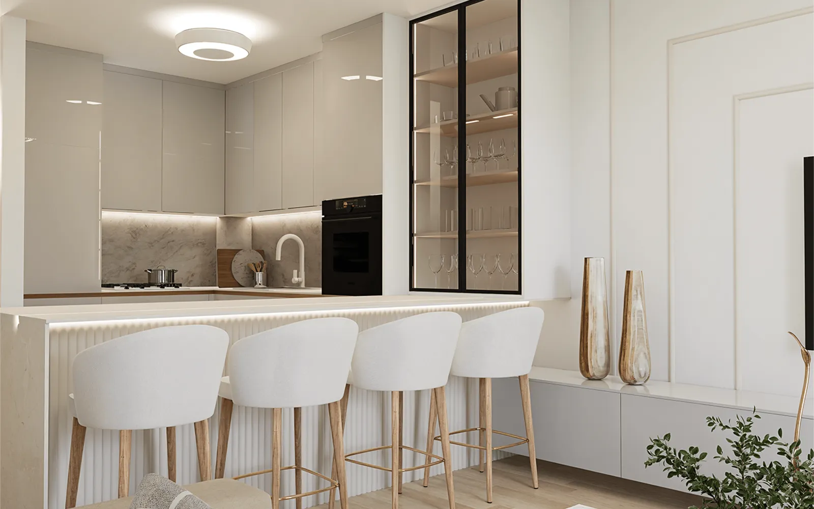 Kuhinja je pravi dragulj ovog interijera. Visoki sjaj bijelih površina kombiniran je sa zlatnim detaljima kao što su ‘gola’ profili i soklovi, koji unose dozu elegancije i luksuza. Bijela mramorna radna ploča pridonosi sofisticiranosti, dok zidna obloga od bež ploča stvara suptilni kontrast i naglašava moderni dizajn kuhinje. Umjesto klasičnog blagovaonskog stola, poluotok nastavlja liniju kuhinje, služeći kao središnji prostor za okupljanje. Njegova reljefna dizajnerska obloga dodatno je naglašena diskretnom LED rasvjetom, koja osvjetljava prostor suptilnim sjajem.