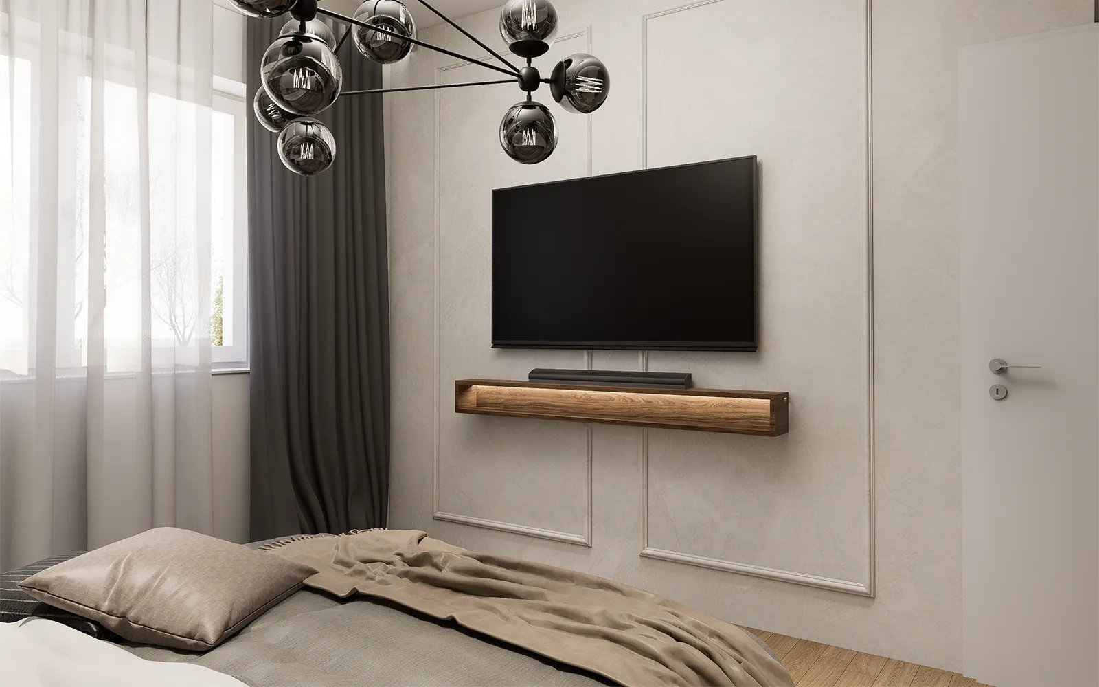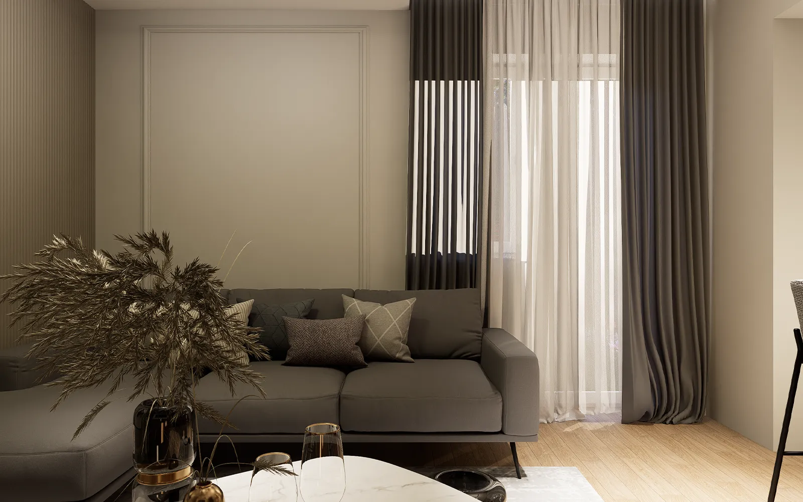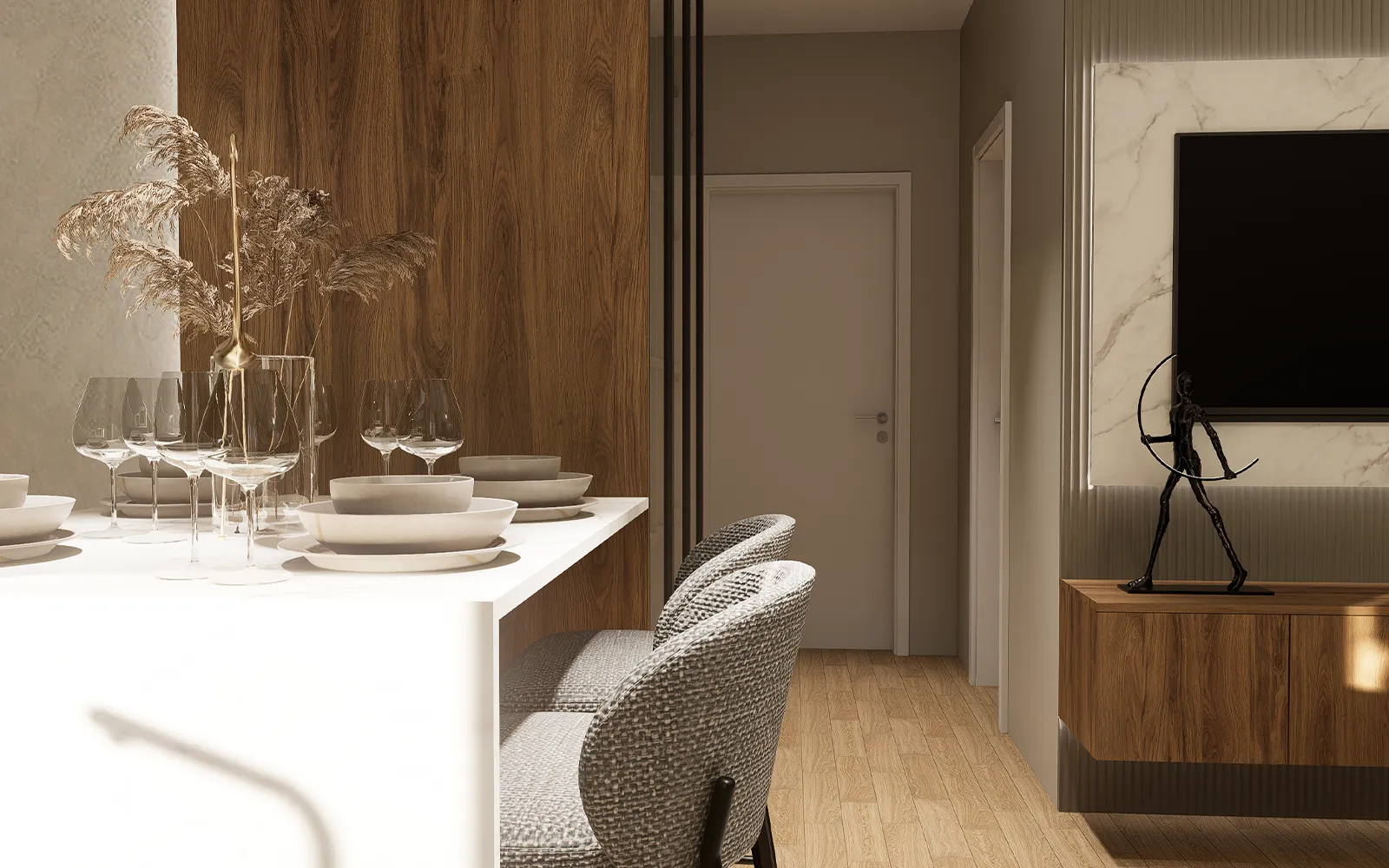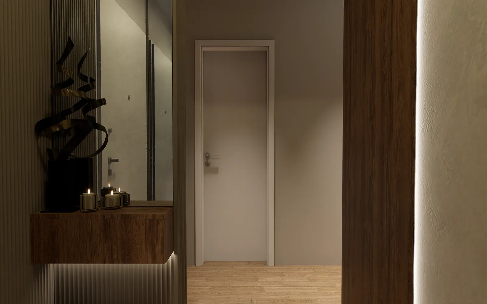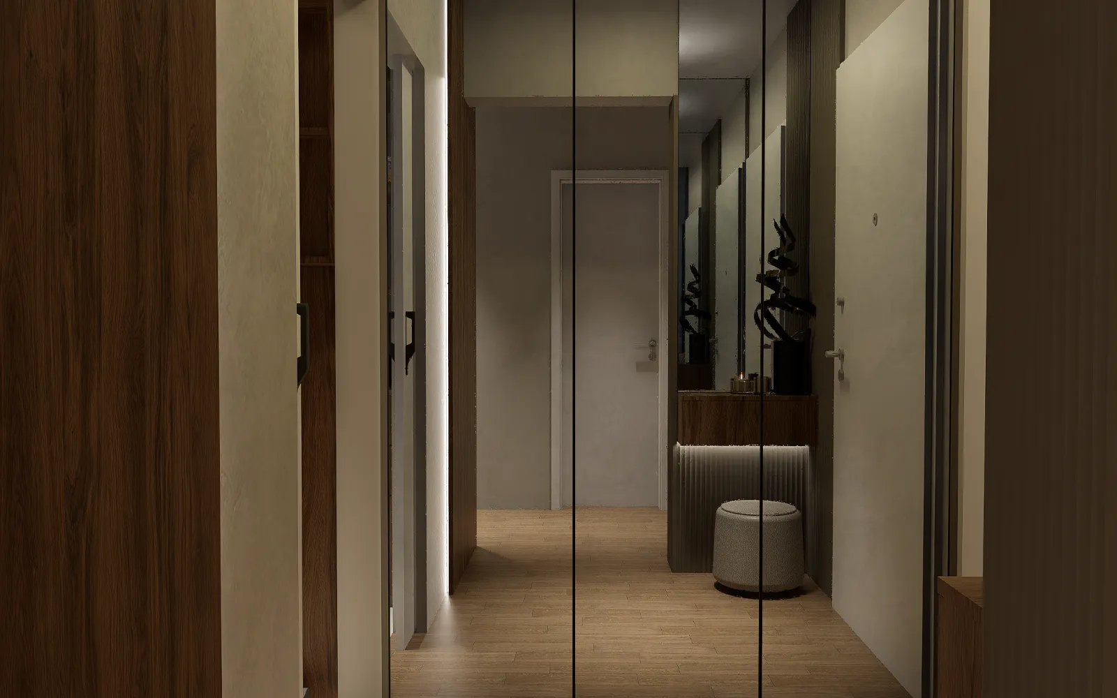 Od prvog trenutka, stan odiše profinjenošću i nenametljivom elegancijom. Veliki garderobni ormar s ogledalima ne samo da reflektira svjetlost i vizualno povećava prostor, već i naglašava suptilnu estetiku Tihog luksuza. Zid s dekorativnim panelima i diskretnom LED rasvjetom dodaje osjećaj topline i sofisticiranosti, dok pomno birani detalji upotpunjuju atmosferu luksuznog dizajna interijera.