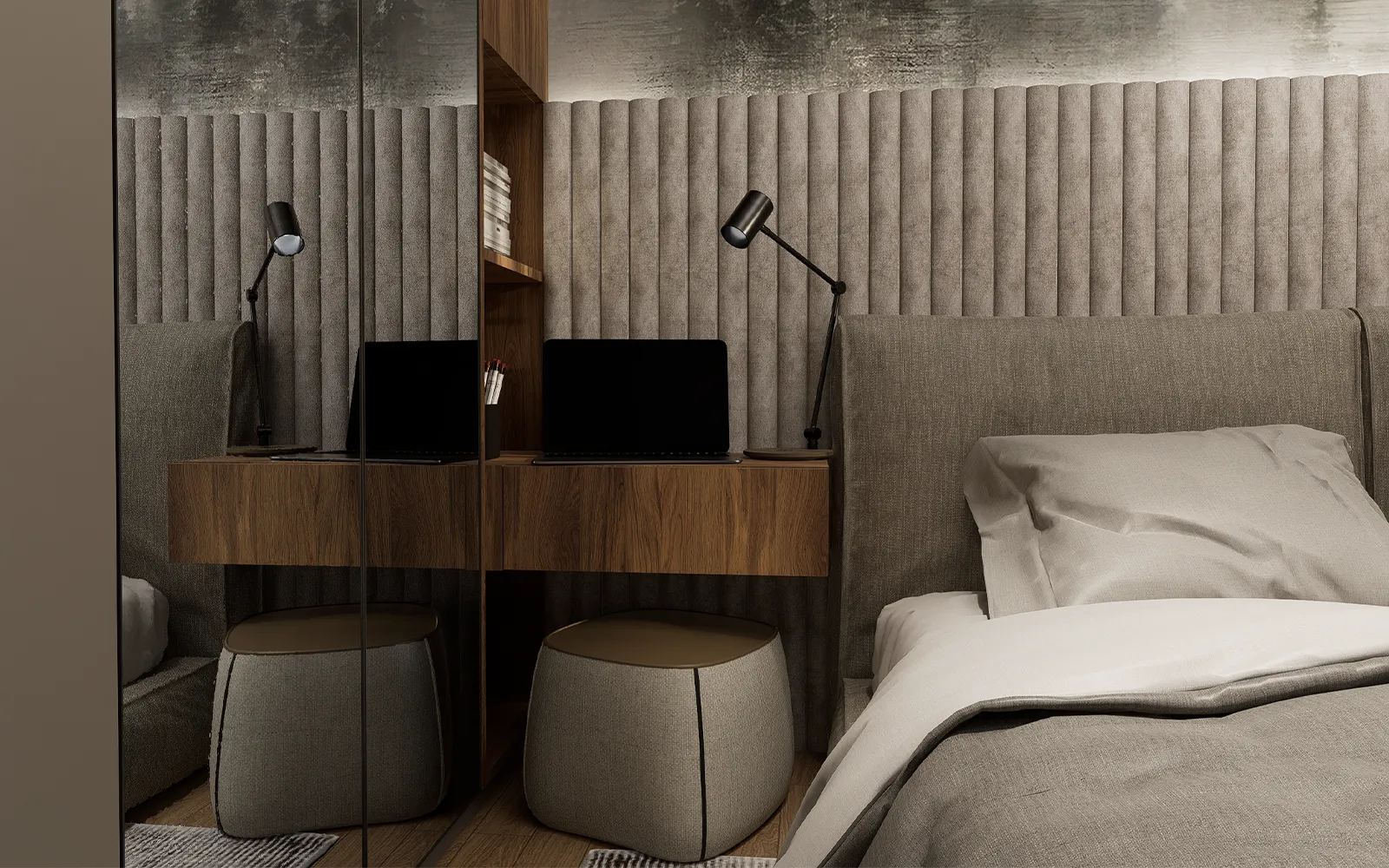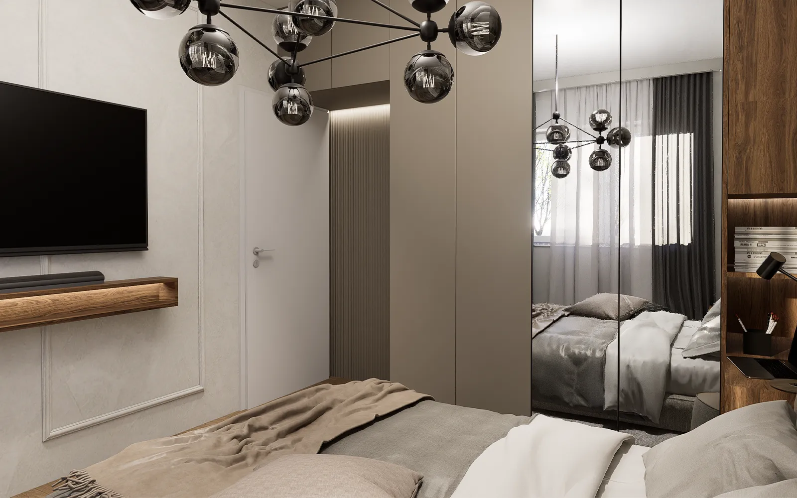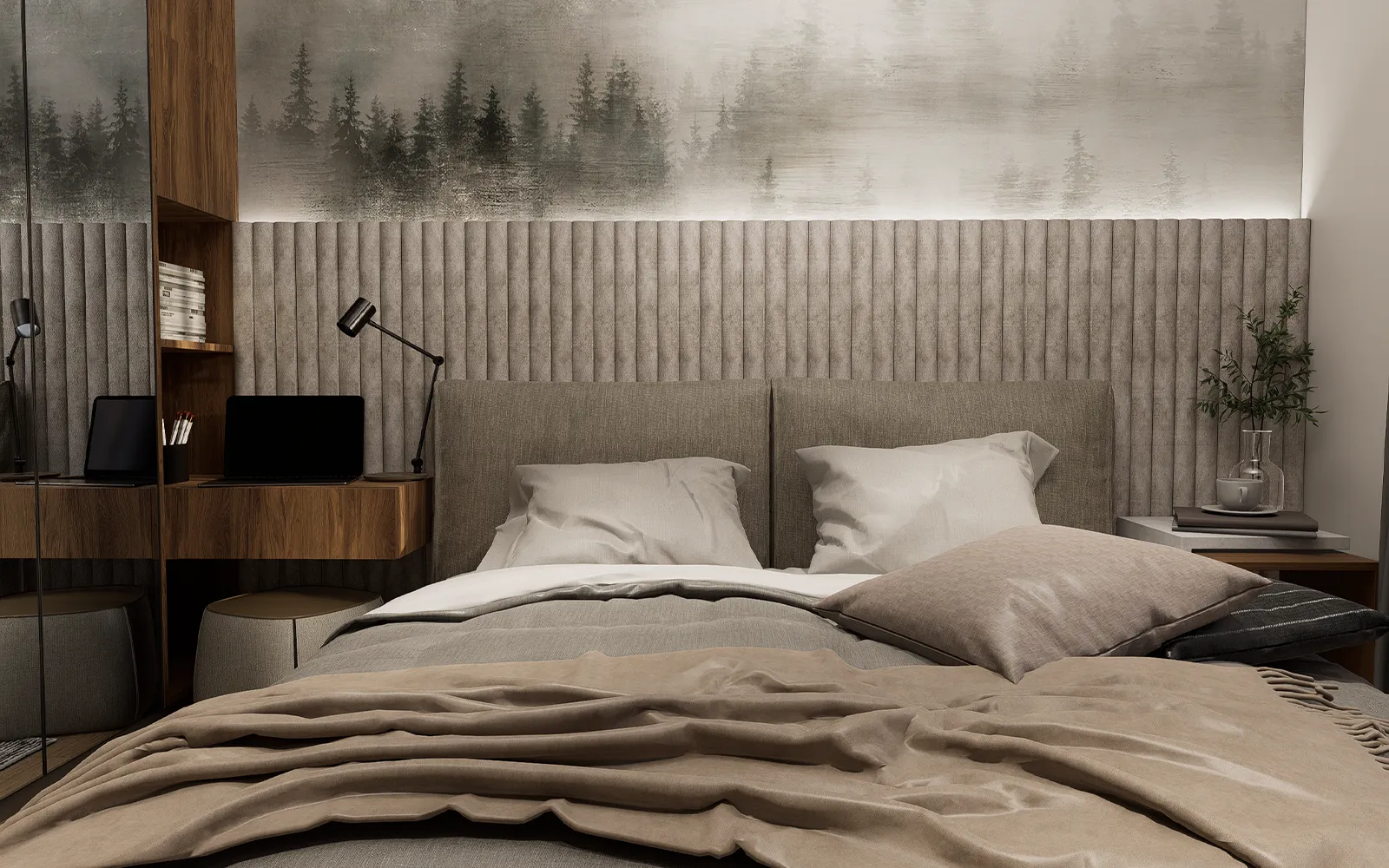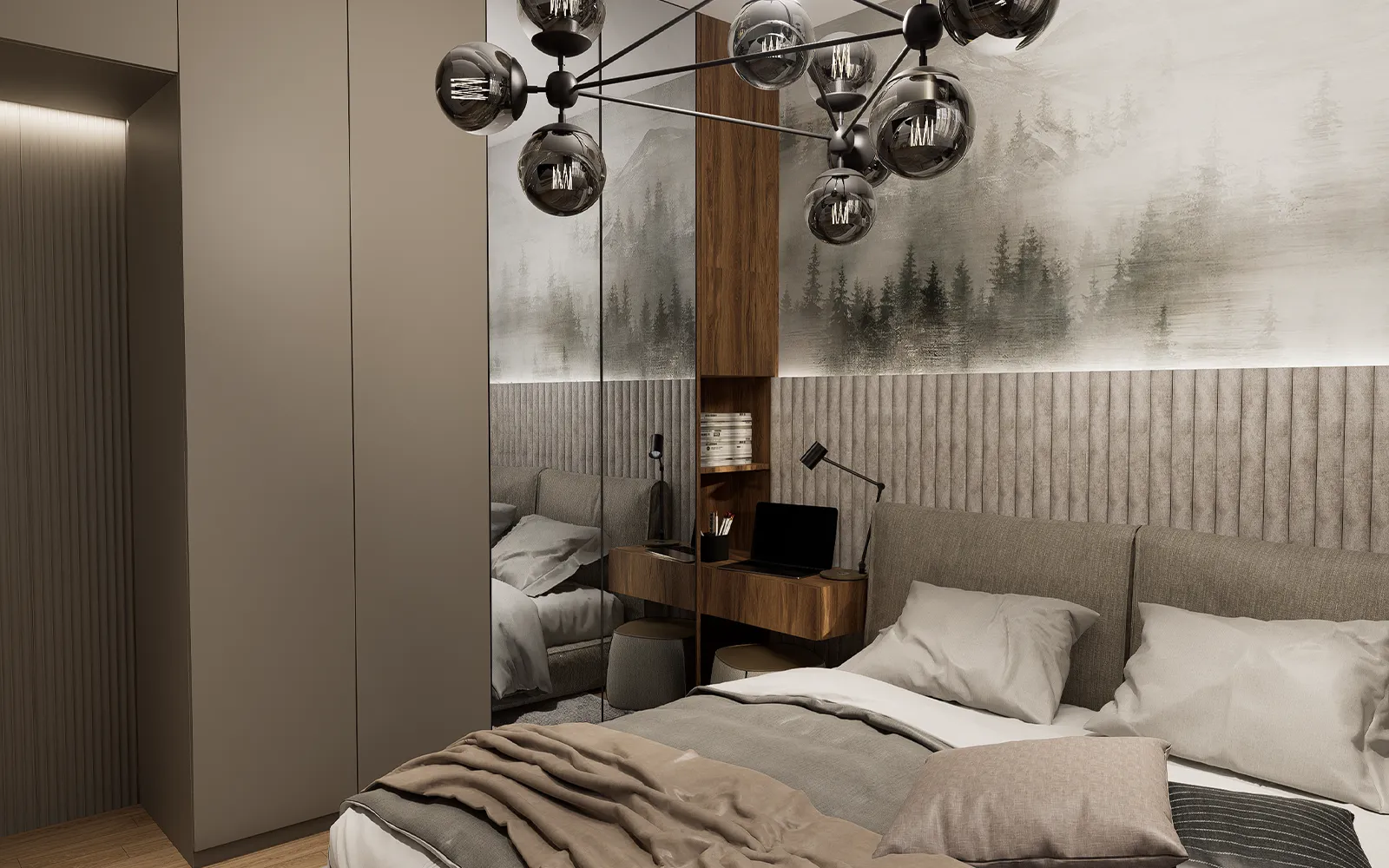 Spavaća soba odiše suptilnom elegancijom i funkcionalnošću. Ormar od poda do stropa s ogledalima reflektira svjetlost i doprinosi osjećaju prostranosti. Krevet, tapeciran u nježnoj bež tkanini, upotpunjen je uzglavljem koje se proteže cijelim zidom. LED rasvjeta iznad uzglavlja dodatno naglašava Tihi luksuz, dok apstraktna tapeta s motivima drveća i planina unosi osjećaj mira i harmonije.