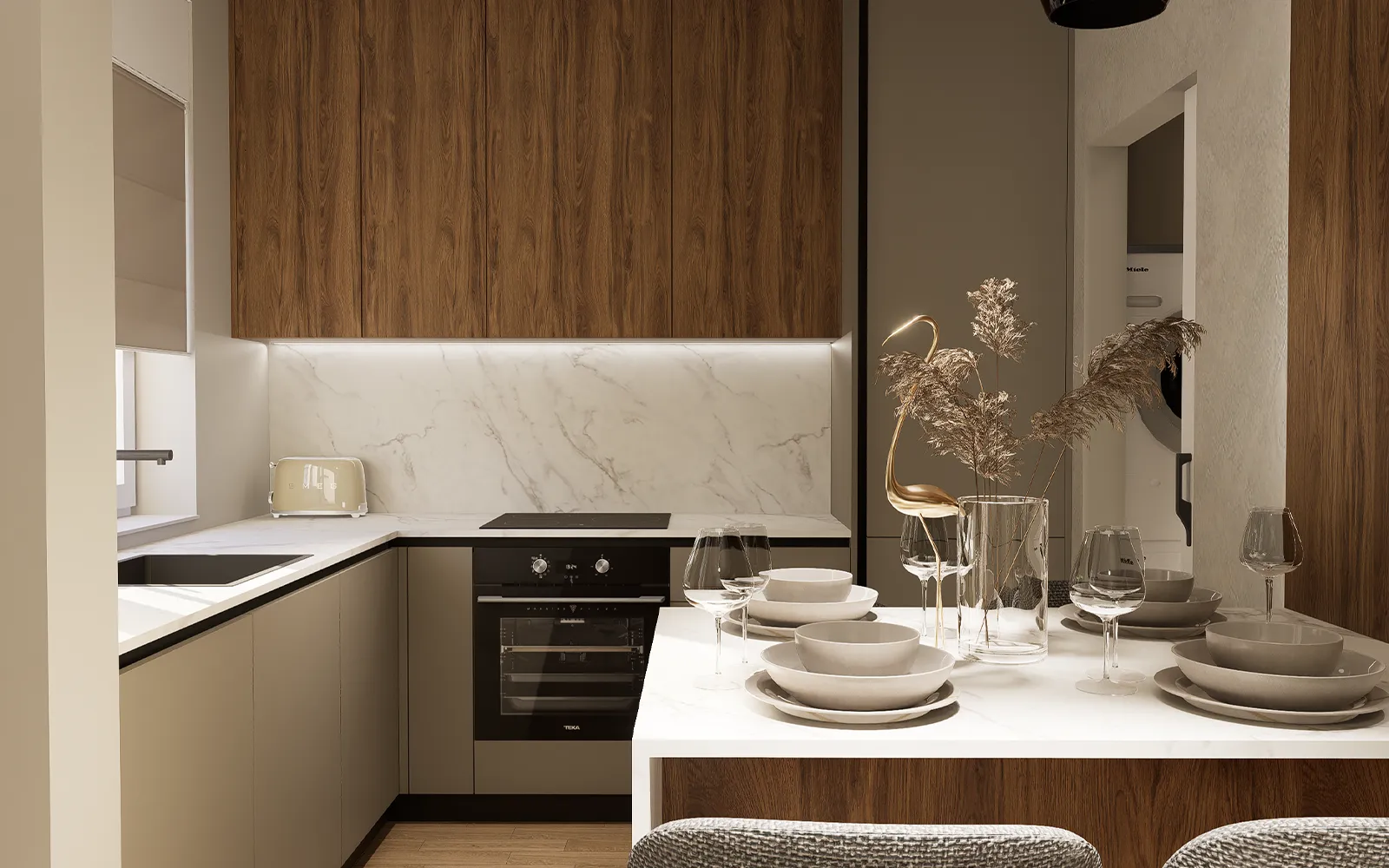 Na prijelazu između dnevnog boravka i kuhinje nalazi se polubarski stol od bijelog mramora sa sivim žilama, koji se savršeno nadovezuje na kuhinjsku radnu ploču. Kuhinja je dizajnirana u L-konfiguraciji, s kombinacijom kašmir bež donjih elemenata, drvenih gornjih elemenata i mramorne radne ploče. Skriveni mehanizmi poput gola profila i push-pull sustava omogućuju nenametljiv i profinjen izgled, što je ključno obilježje Tihog luksuza.