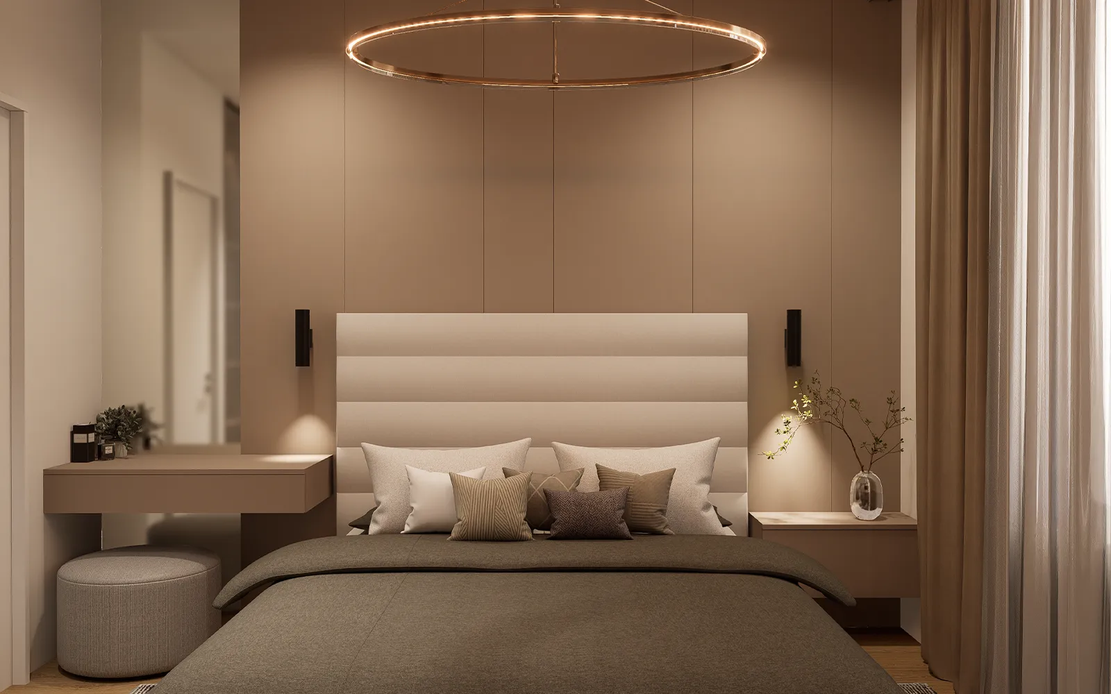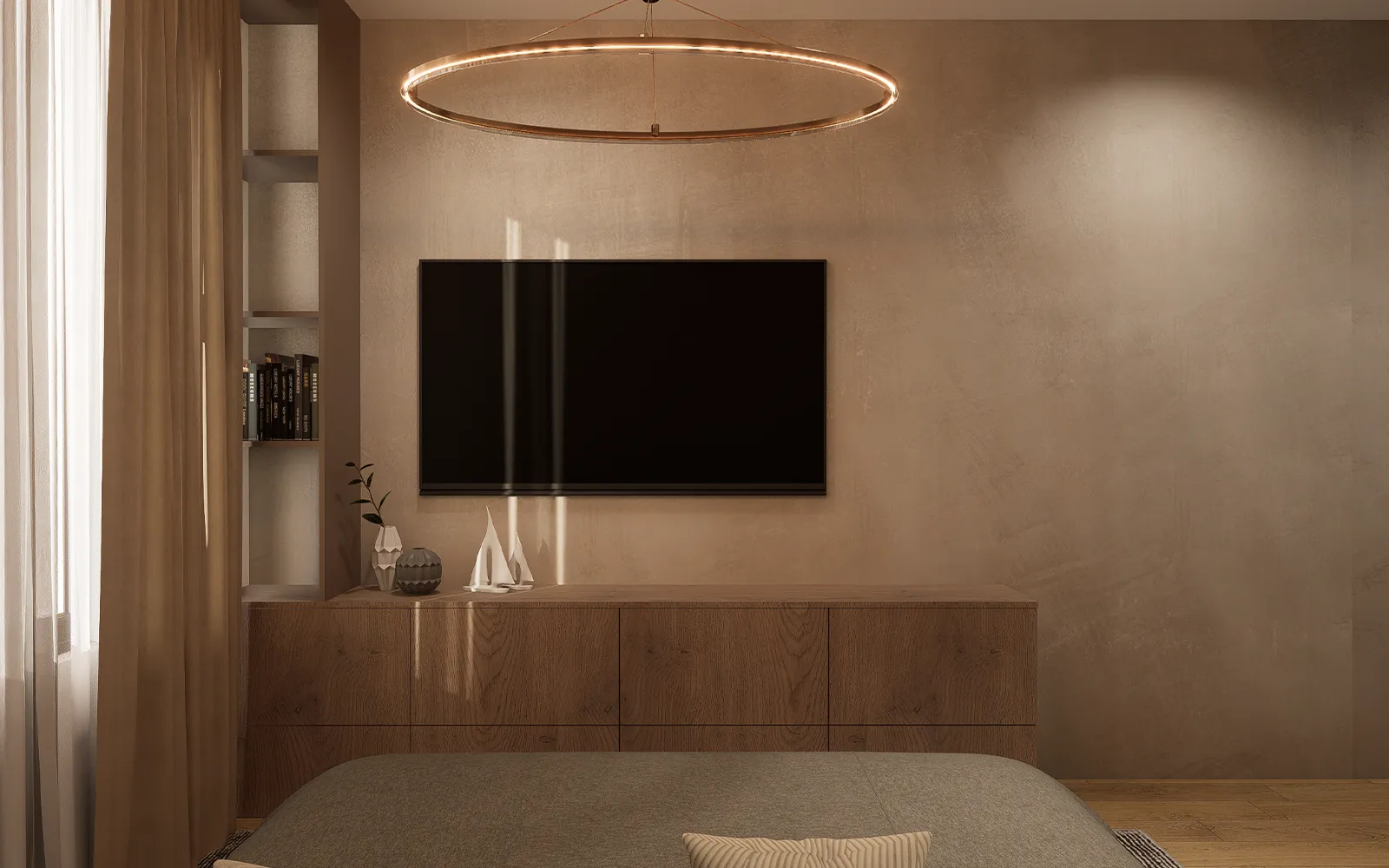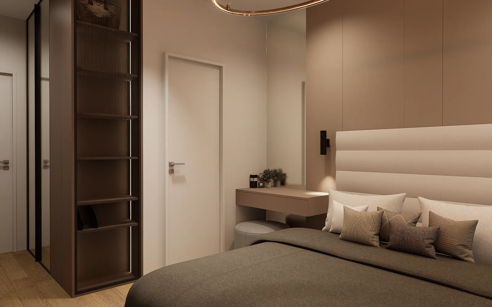 Spavaća soba oblikovana je kao mirna i funkcionalna zona stana. U centru prostora nalazi se krevet s uzglavljem, uz koji su smješteni make up stolić i noćni ormarić. Zid iza kreveta izveden je u dekoru imitacije kašmira s integriranim rasvjetnim tijelima, dok je ostatak zida obložen tapetom u imitaciji betona. Nasuprot kreveta nalazi se komoda, biblioteka i televizor.
