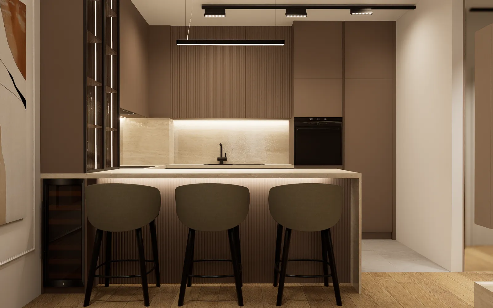 Crni detalji poput sudopera, slavine, gola profila, ugradbenih uređaja i magnetne šinske rasvjete stvaraju kontrast i naglašavaju suvremeni karakter kuhinje. U poluotok je integriran vinski hladnjak, a dio kuhinje oblikovan je kao ostakljena vitrina.