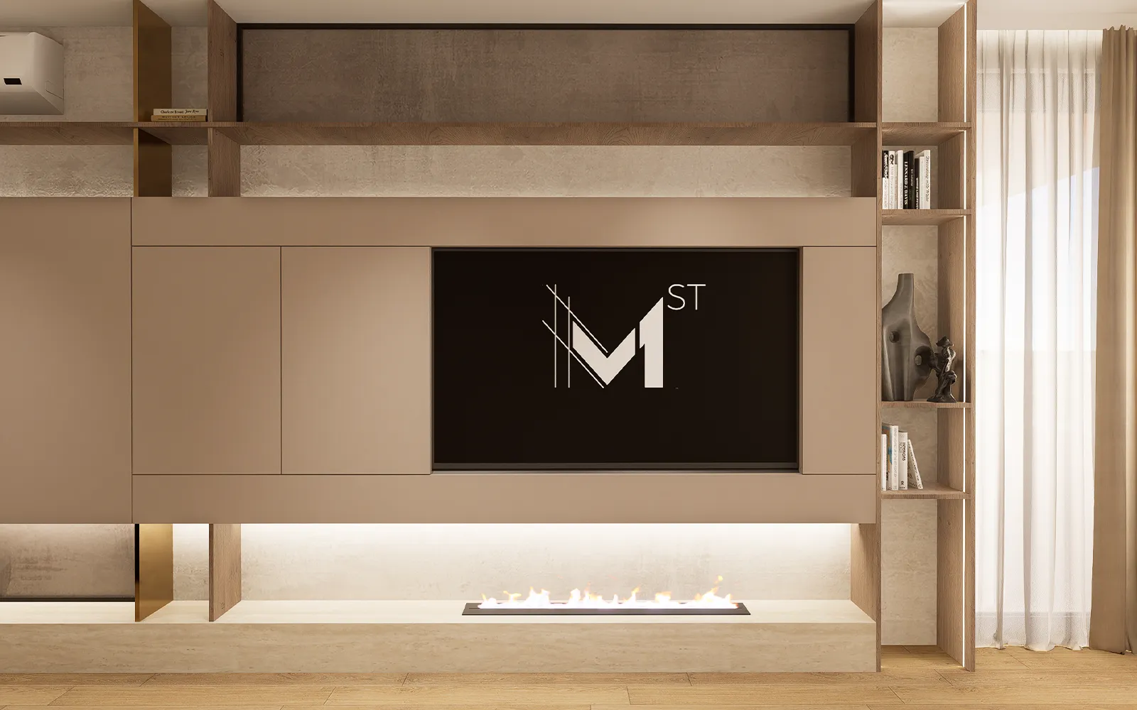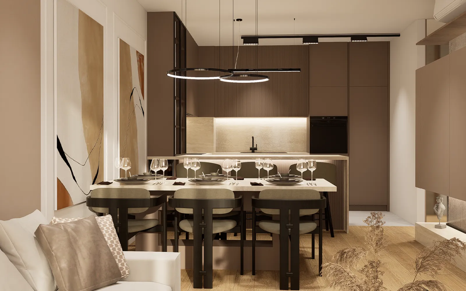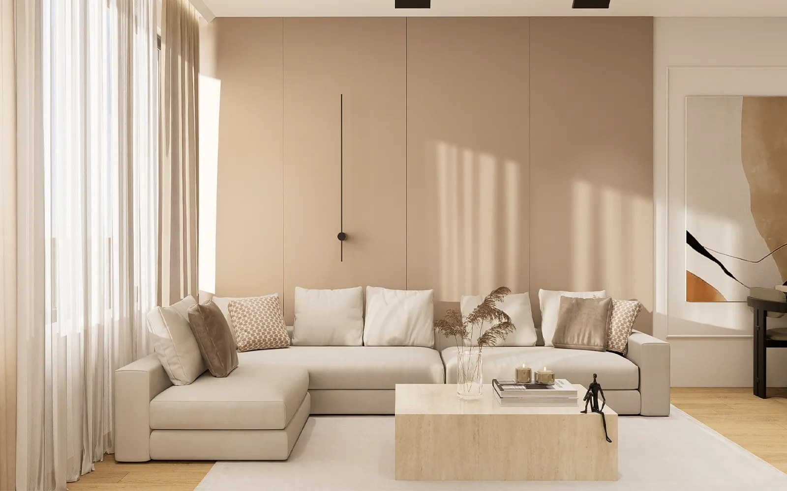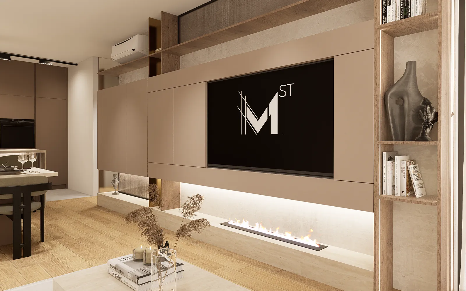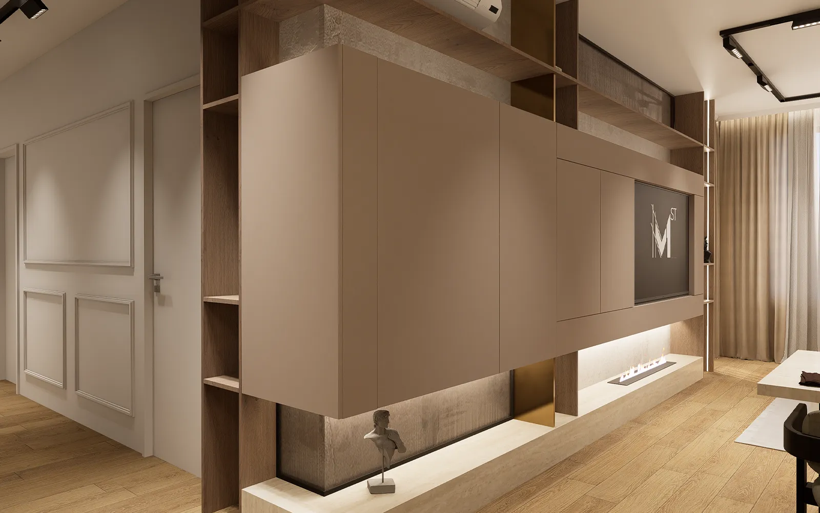 Interijer je oblikovan u stilu toplog minimalizma, koji karakteriziraju čiste linije, smirena paleta boja, prirodni materijali i integrirana rasvjeta. Kroz cijeli stan koriste se taupe, kašmir i bež tonovi u kombinaciji s crnim detaljima i travertin površinama, čime je postignut elegantan i bezvremenski izgled prostora.