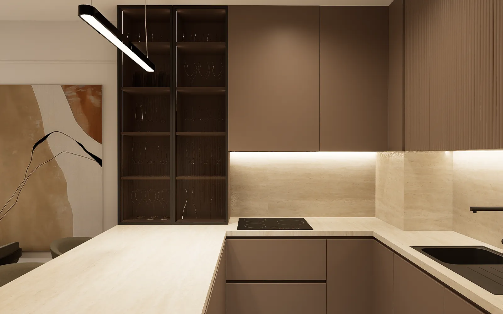 Kuhinja je projektirana s poluotokom u U formi, čime je dobivena velika radna površina i dodatni prostor za sjedenje. Kuhinjski elementi izvedeni su u taupe i kašmir tonovima, dok su radna ploča i zidna obloga u imitaciji travertina.