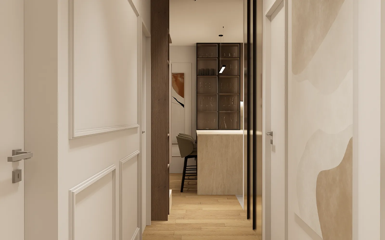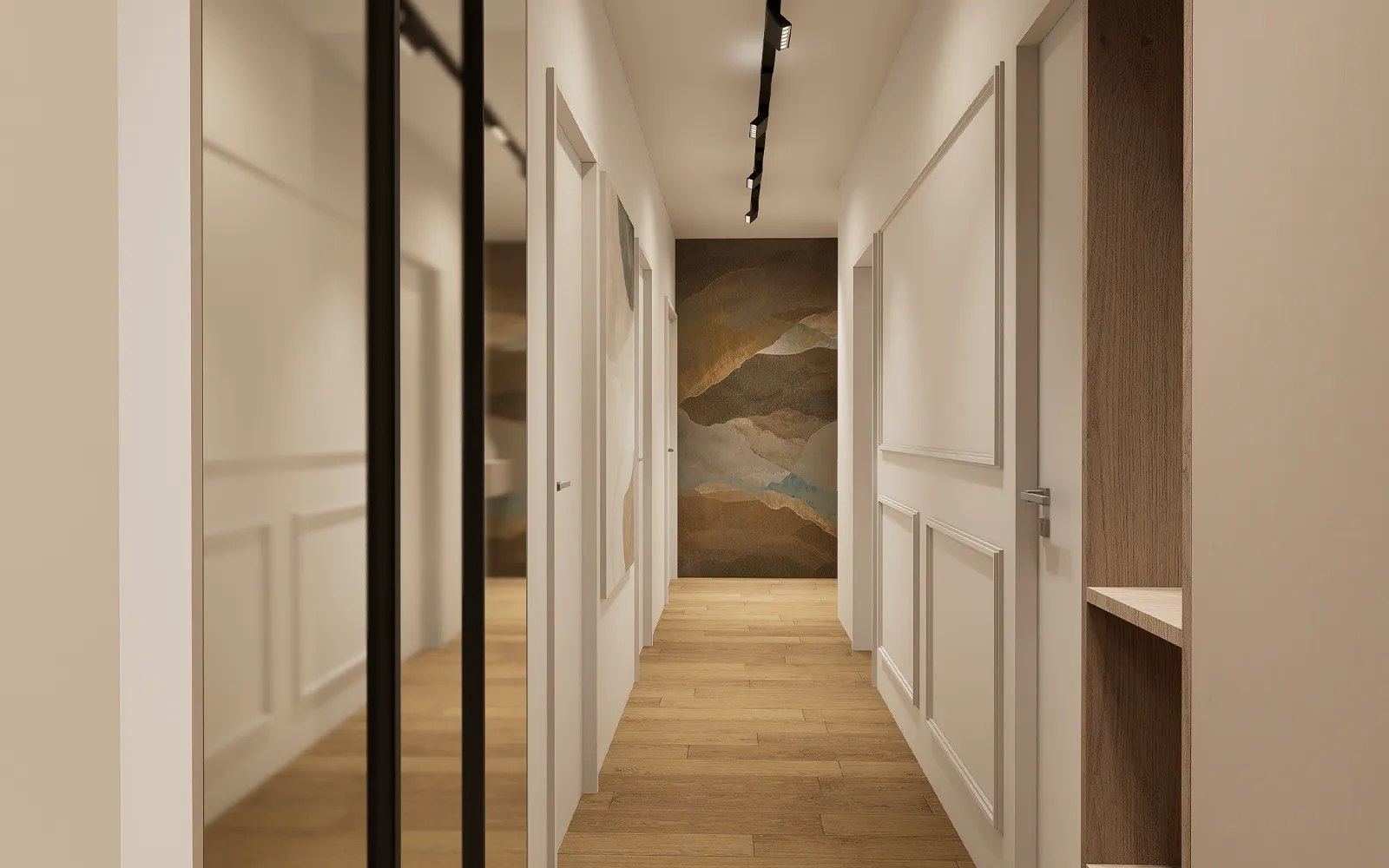 Hodnik je projektiran kao funkcionalan prostor s ugradbenim ormarom smještenim u niši, čije su fronte izvedene u ogledalu kako bi se prostor vizualno povećao. Zidovi su dodatno naglašeni štukaturama i slikama, dok se kroz hodnik i dnevni boravak proteže magnetna šinska rasvjeta koja omogućuje fleksibilno osvjetljenje prostora.