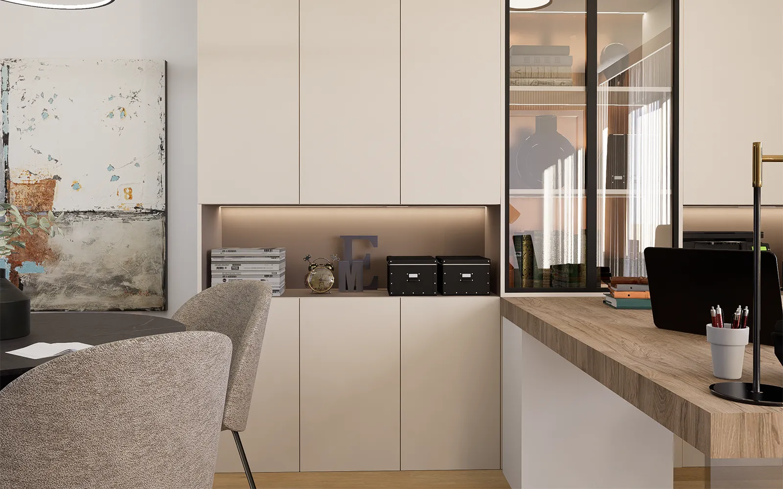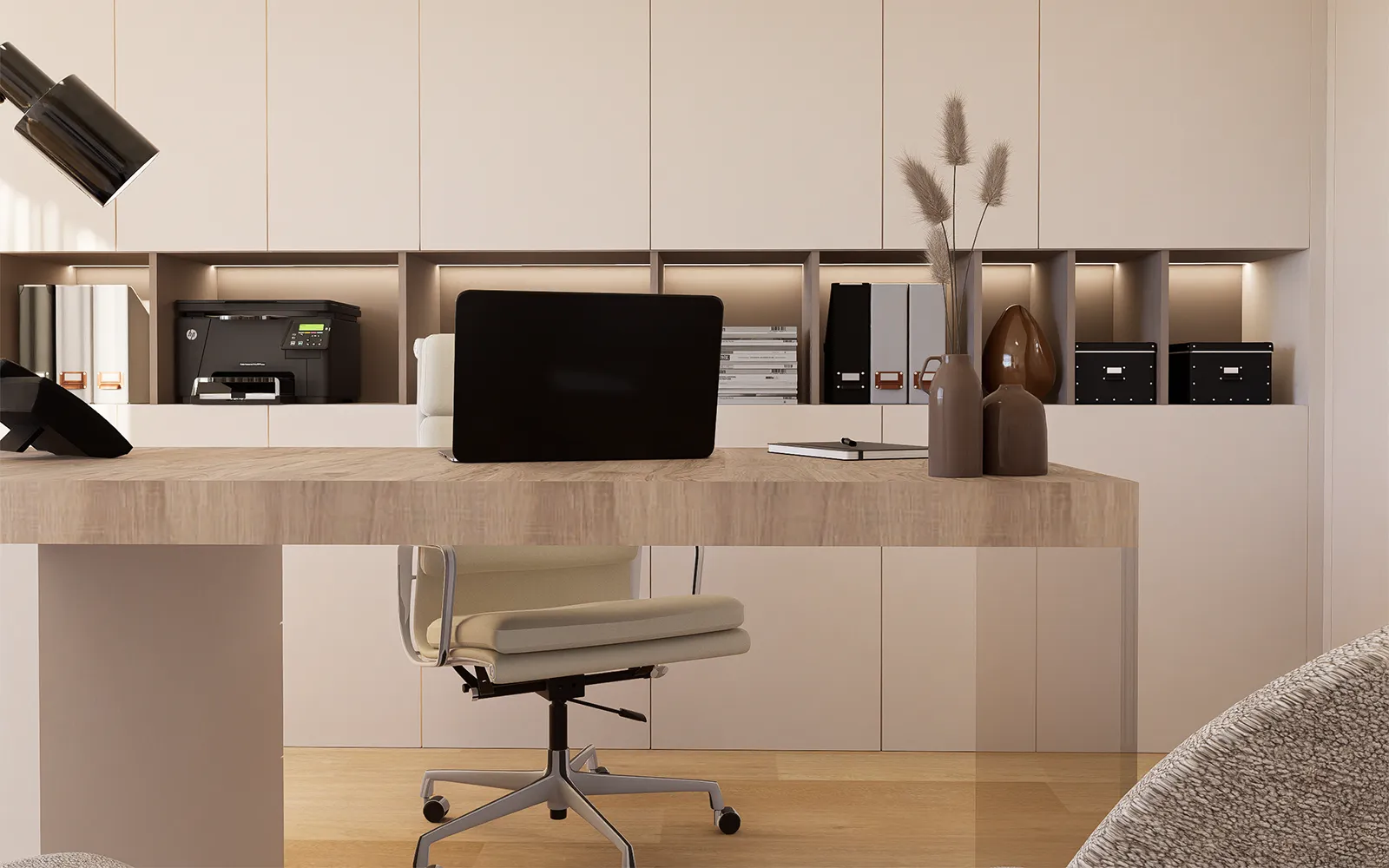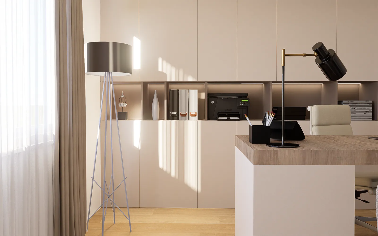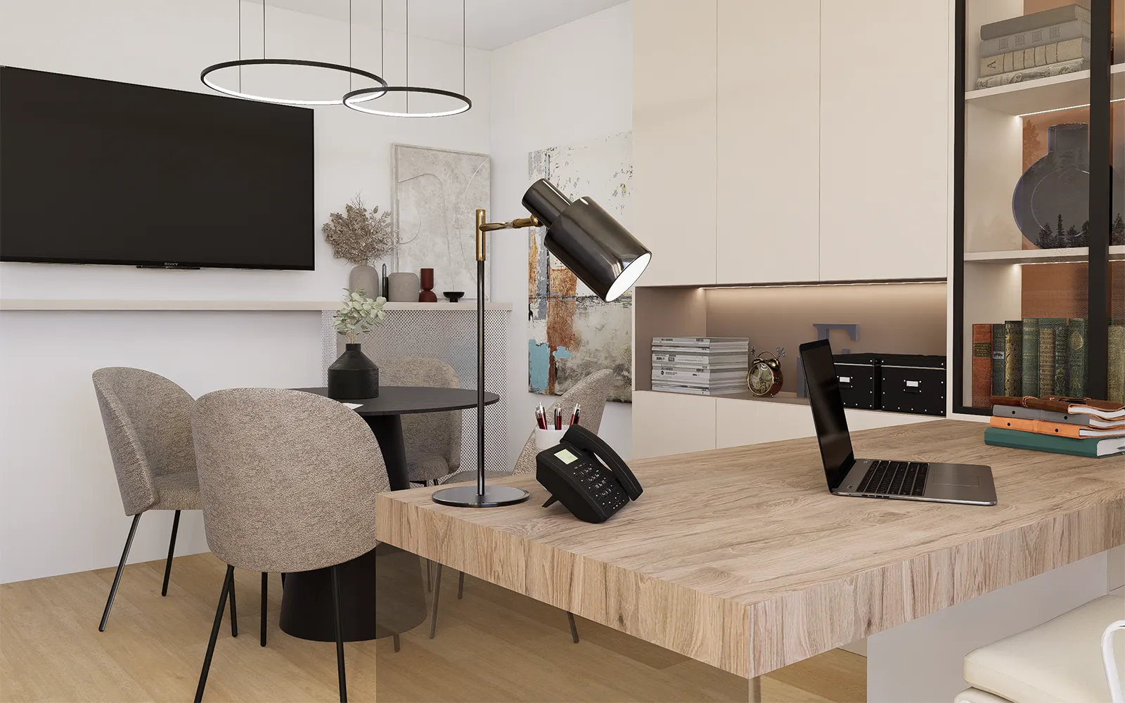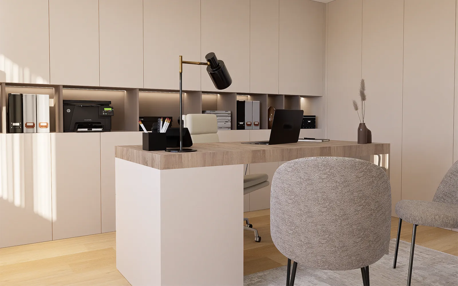 U središtu prve uredske prostorije nalazi se radni stol. Njegov dizajn kombinira staklenu ploču kao jednu nogu stola i funkcionalni ladičar s druge strane. Također, iza stola dominira ormar koji se proteže od poda do stropa, s centralnim otvorenim dijelom u tamno smeđem dekoru koji unosi dodatnu toplinu u prostor.